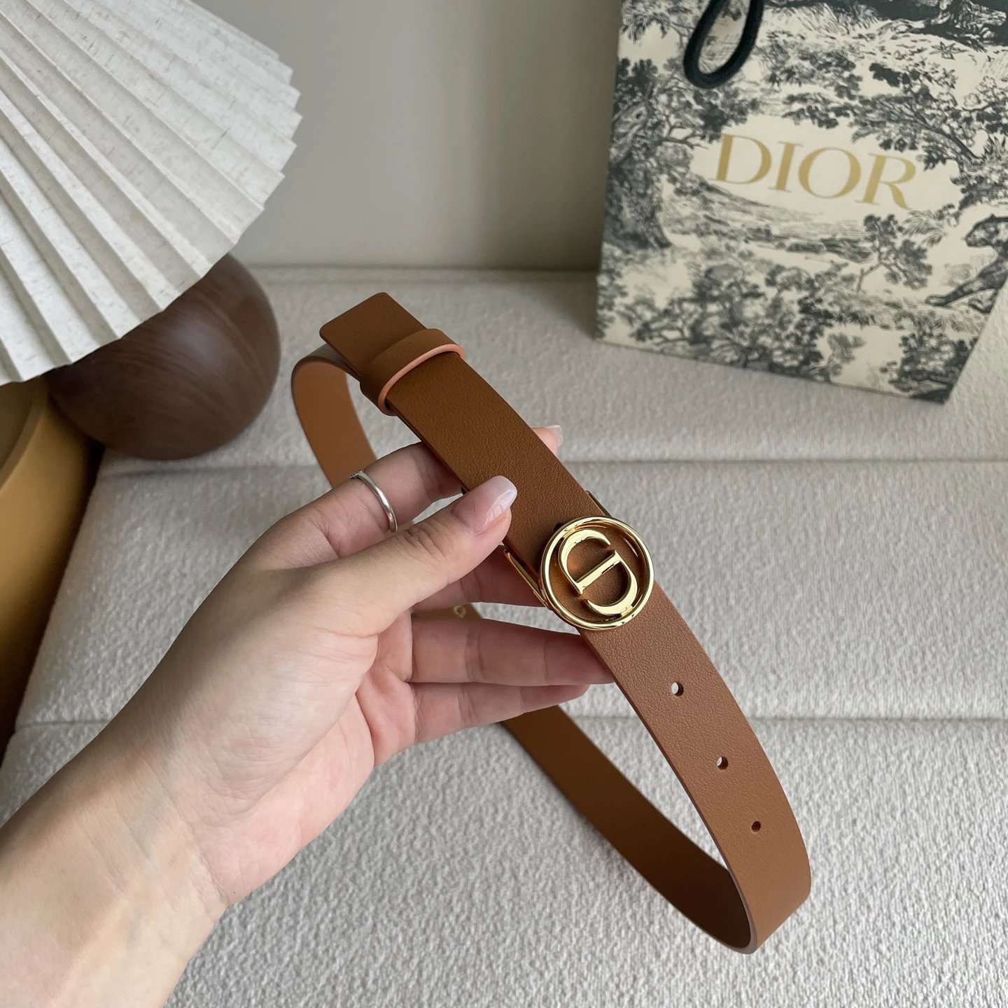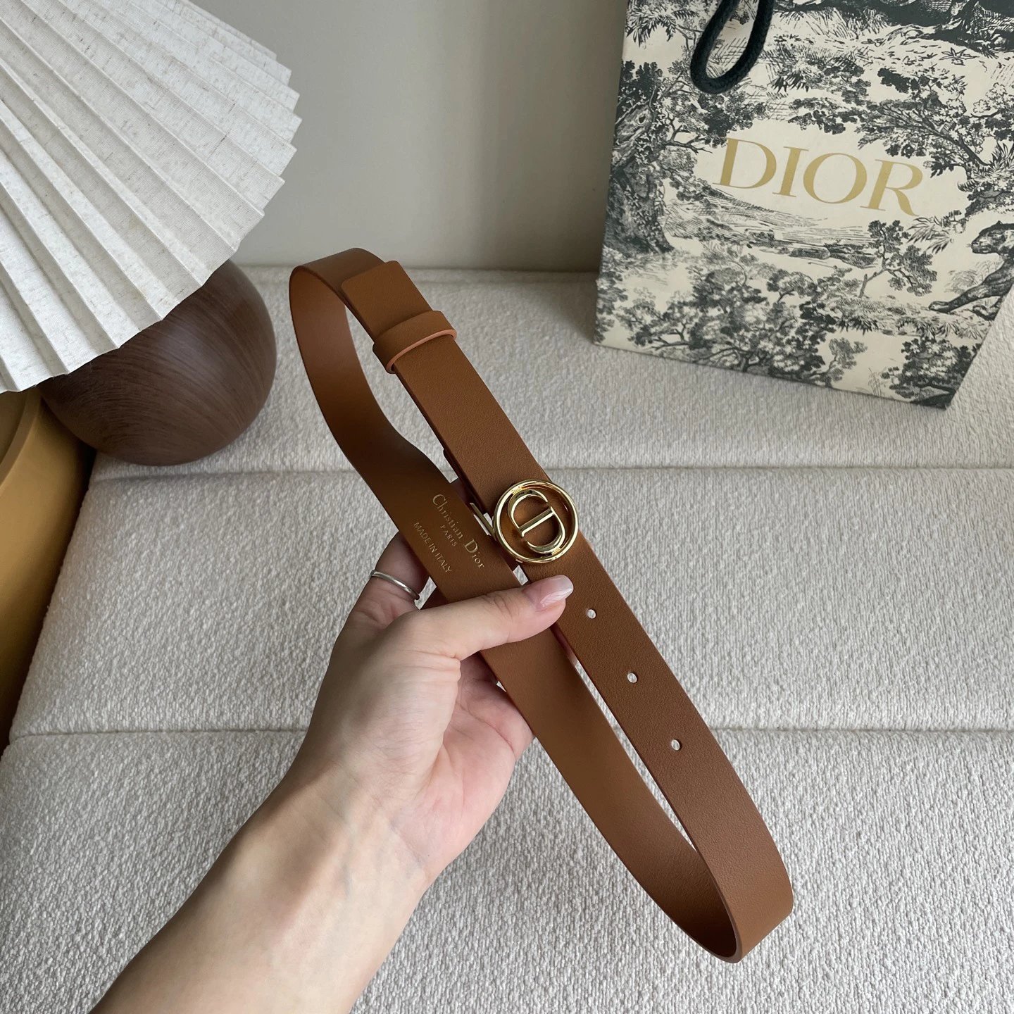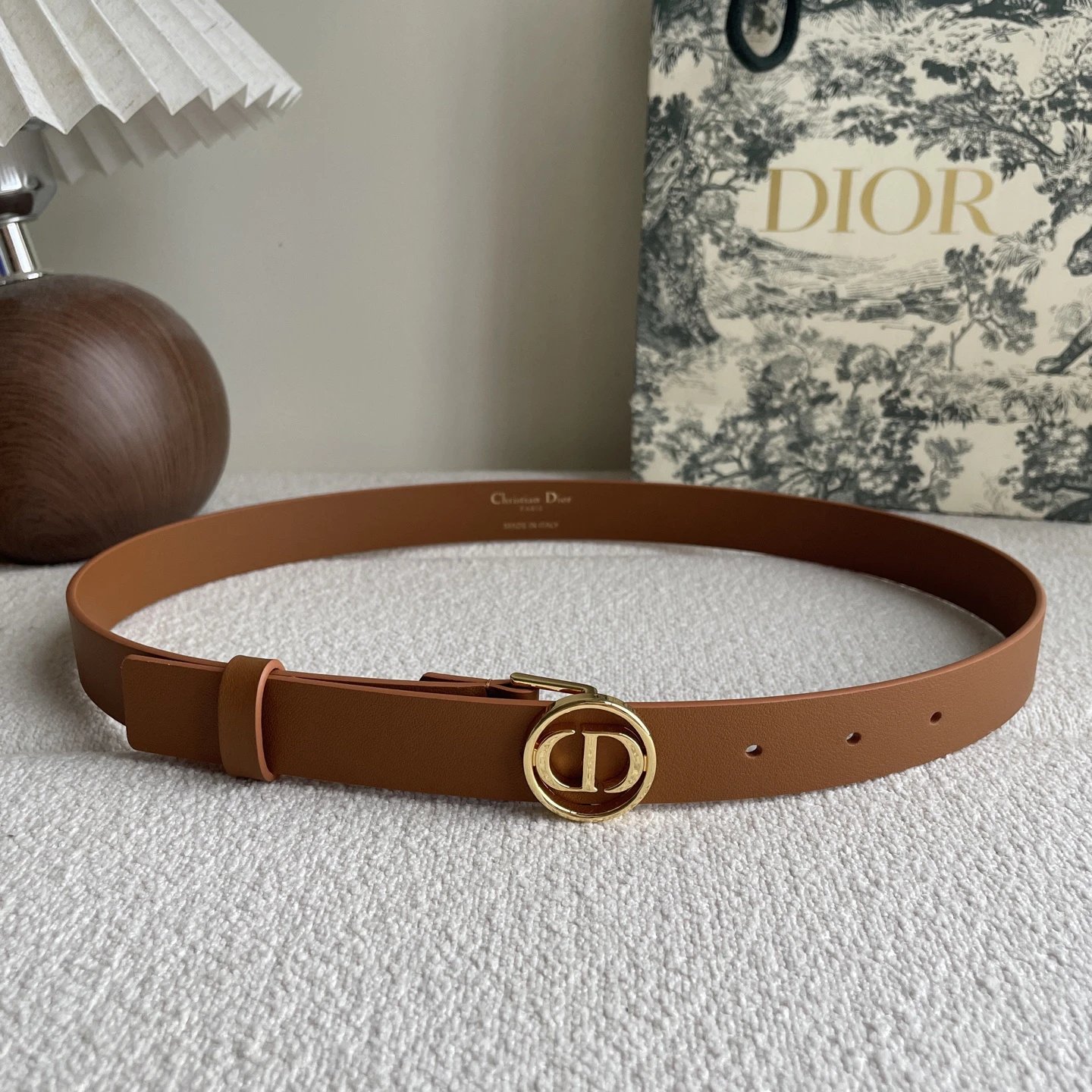 Dior Smooth Calfskin Belt is crafted from smooth calfskin with a shiny gold-tone metal buckle to enhance style.