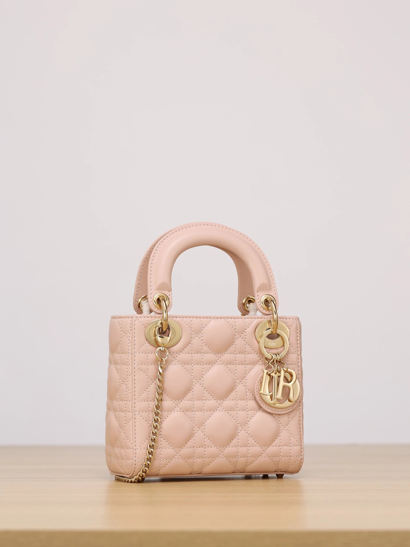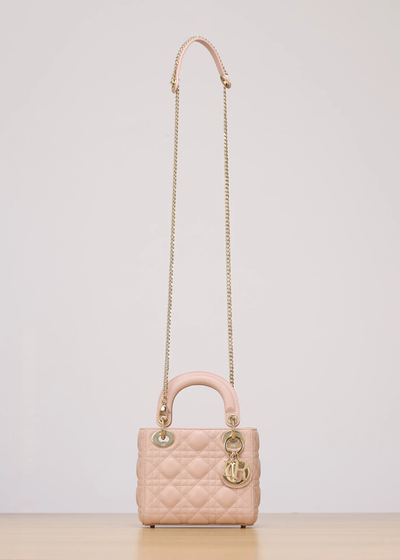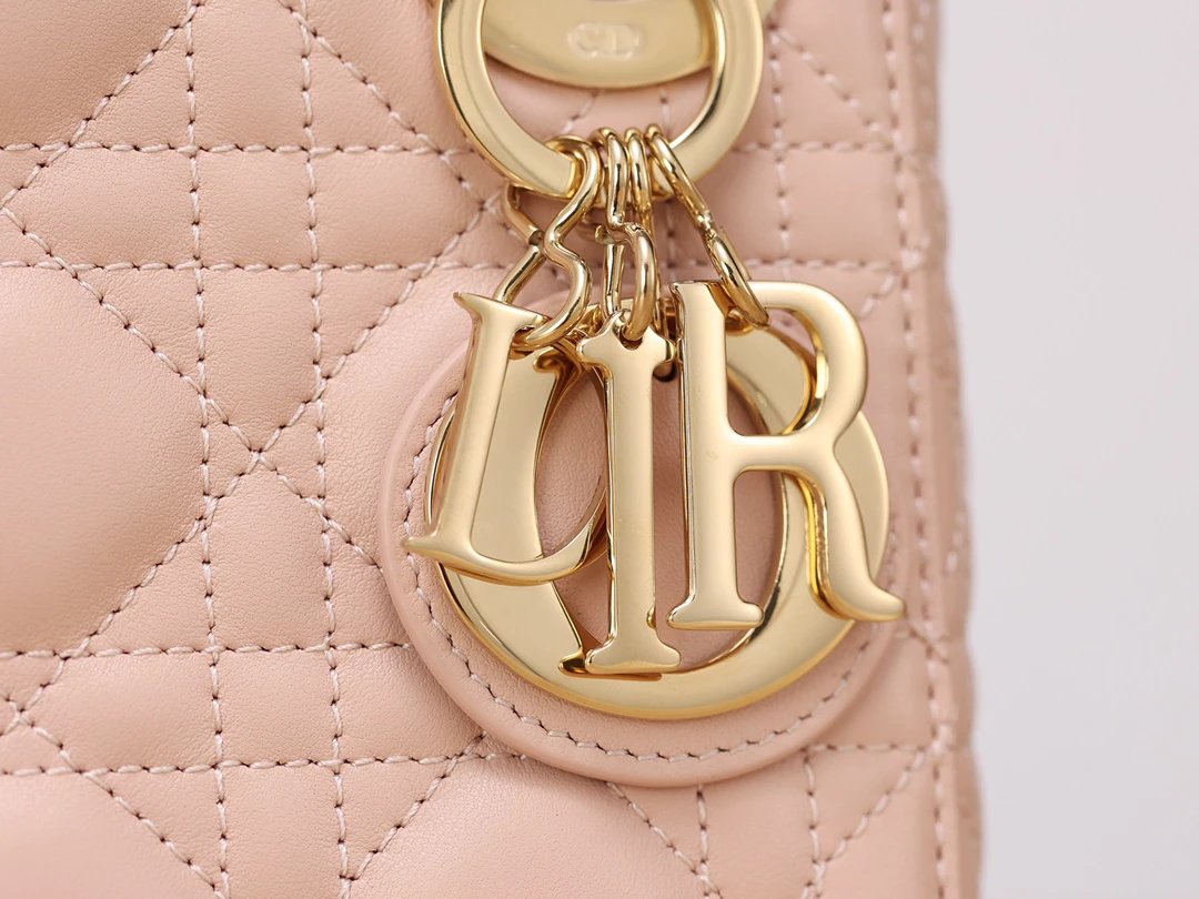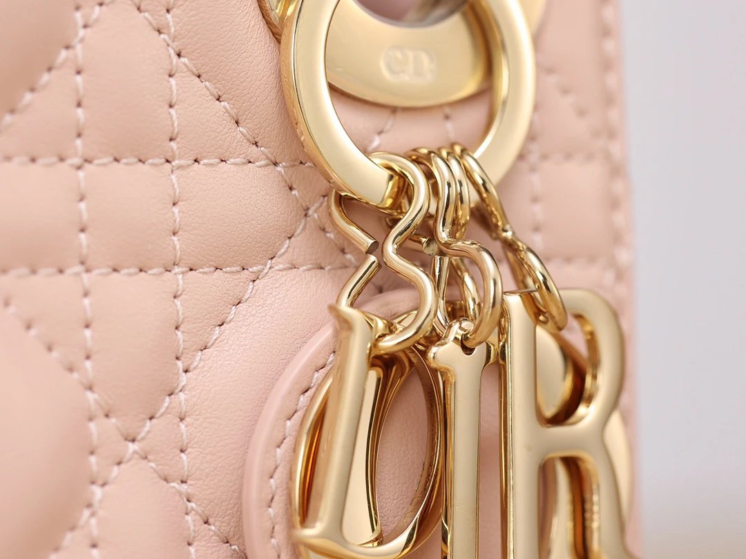 Dior Mini Lady Dior handbag uses pink lambskin with cannage stitching.