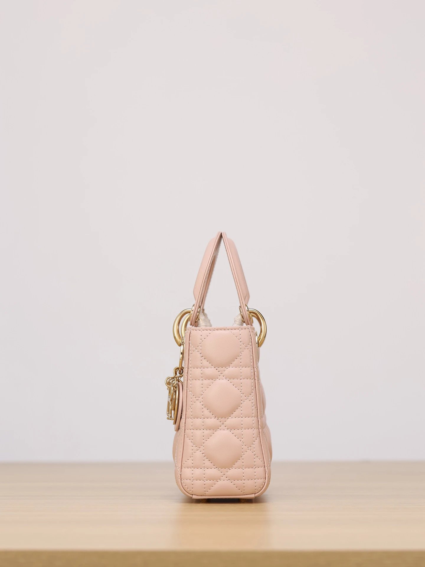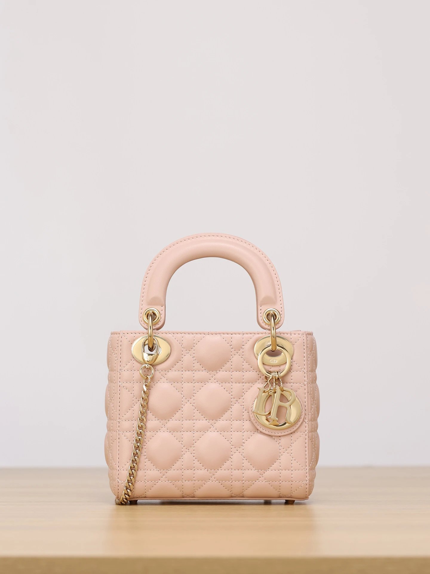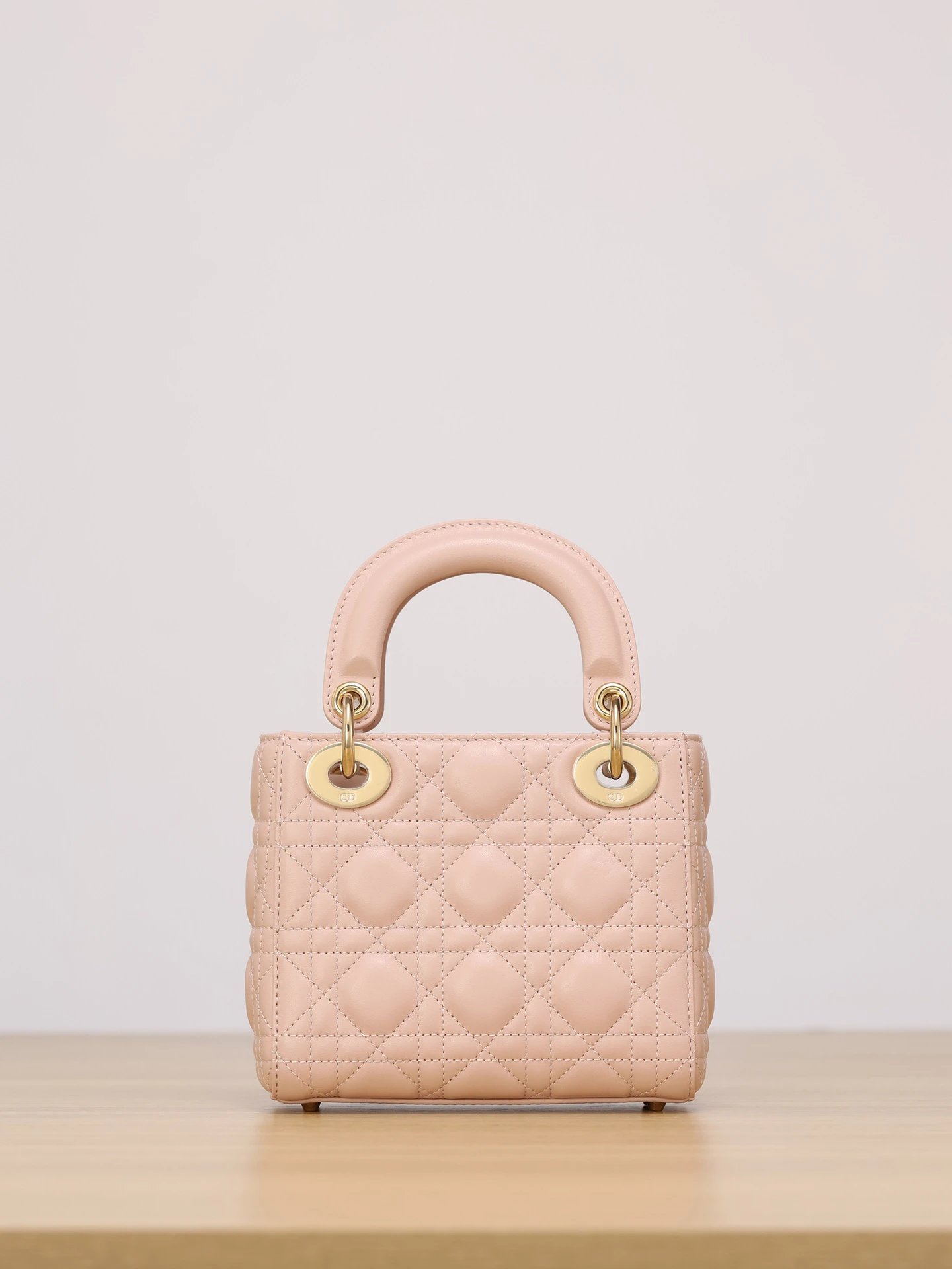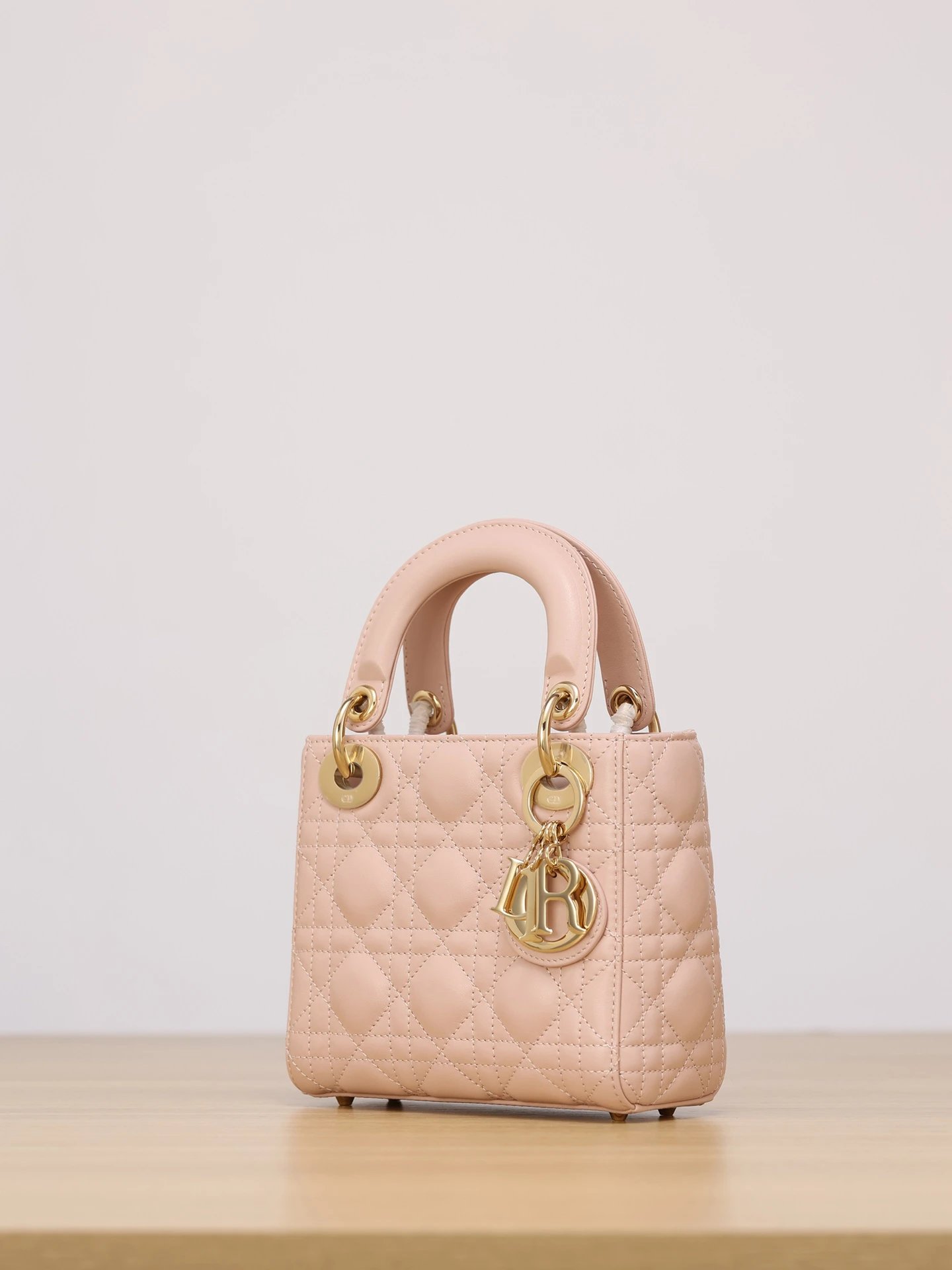 Dior Mini Lady Dior handbag uses pink lambskin with cannage stitching.