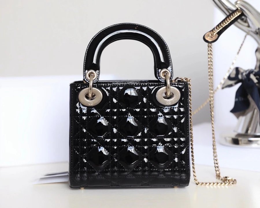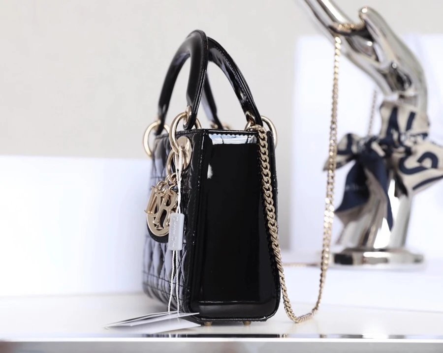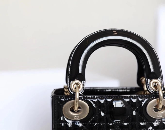 Dior Lady Dior Mini Tote Bag features Cannage stitching, patent leather, and black gold finish.