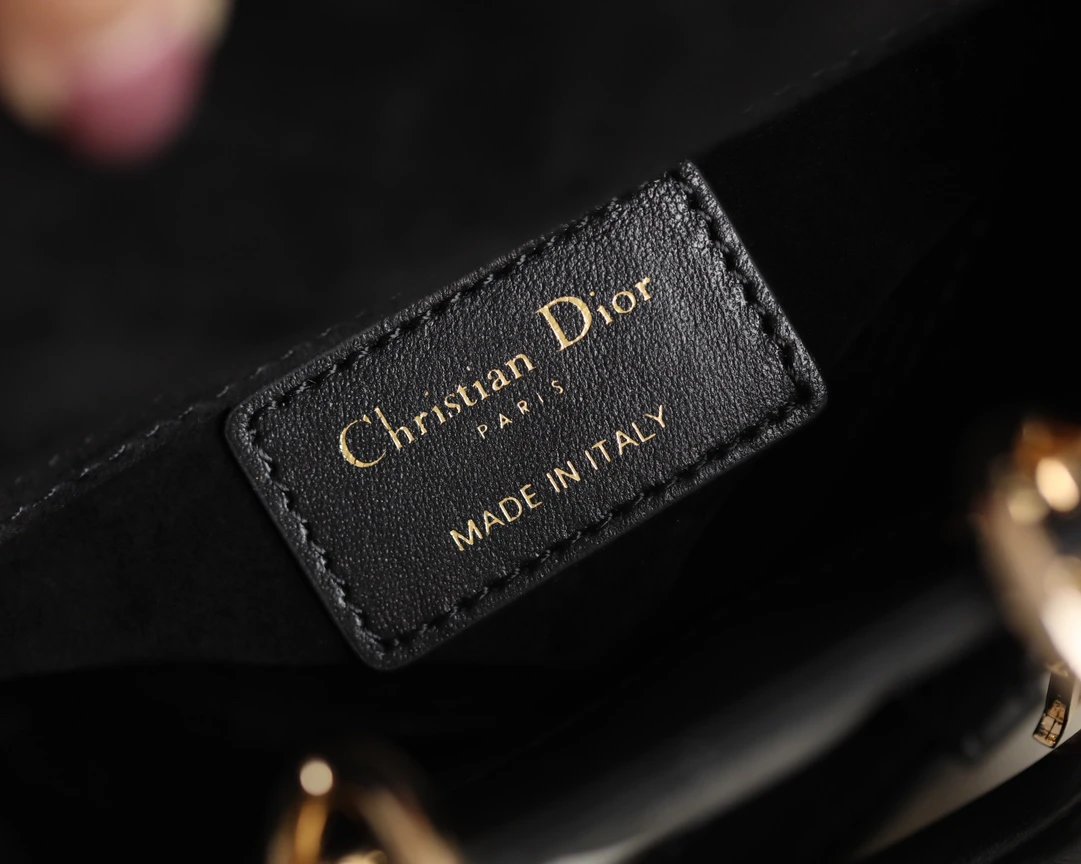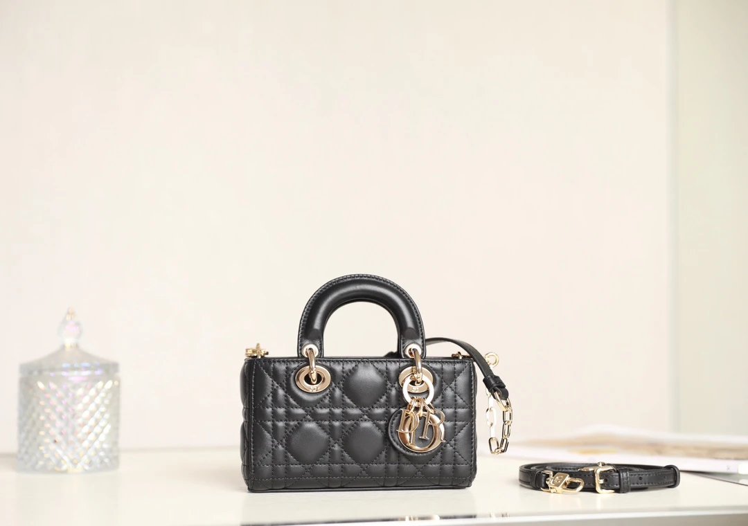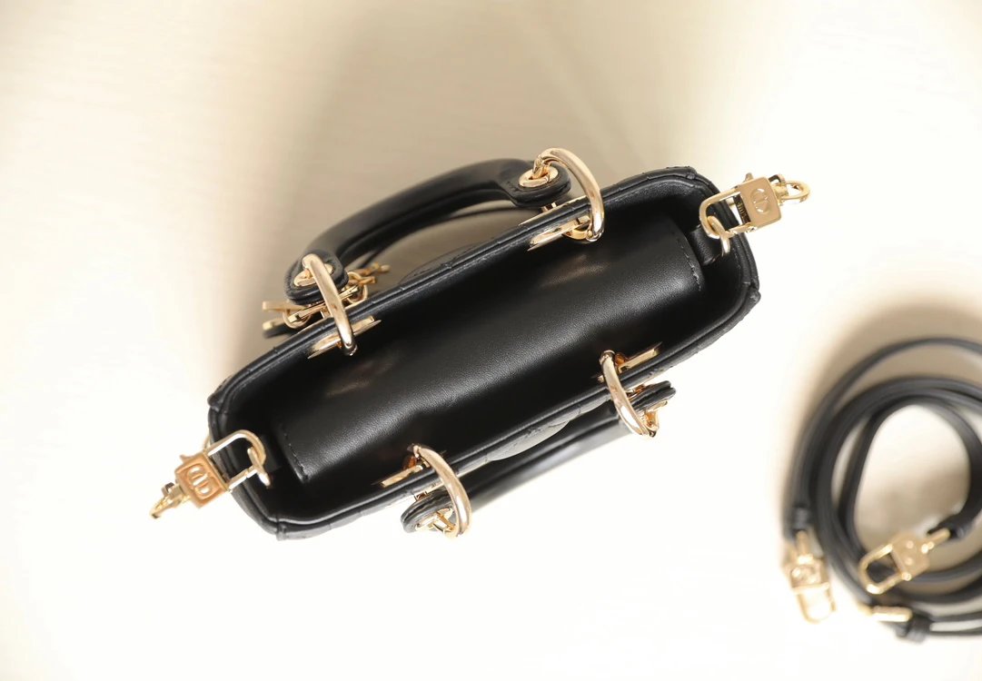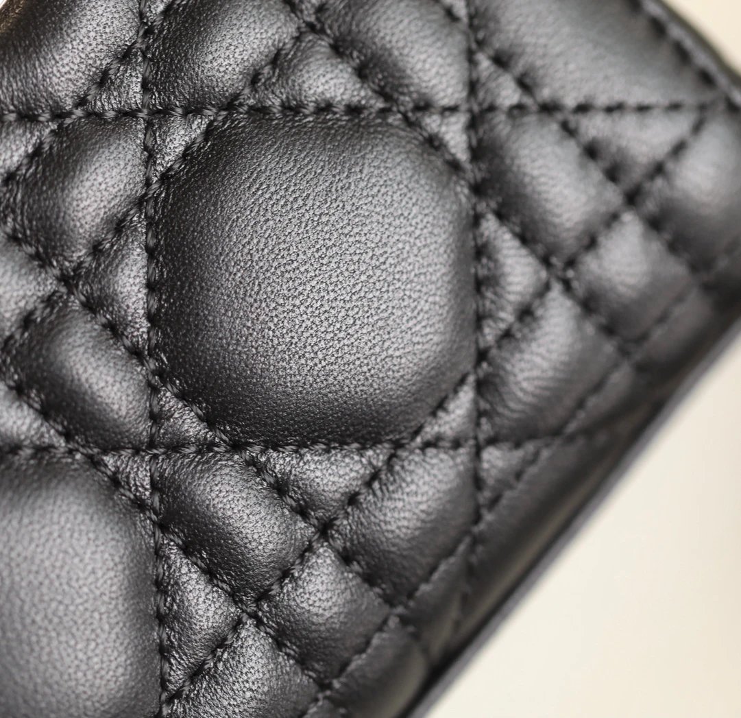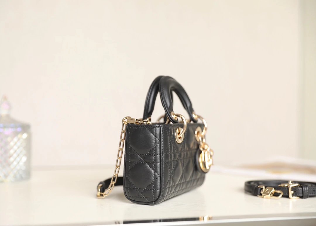 Showcases Lady Dior's sleek aesthetic with cannage quilted details & light gold "D1OR" charm.