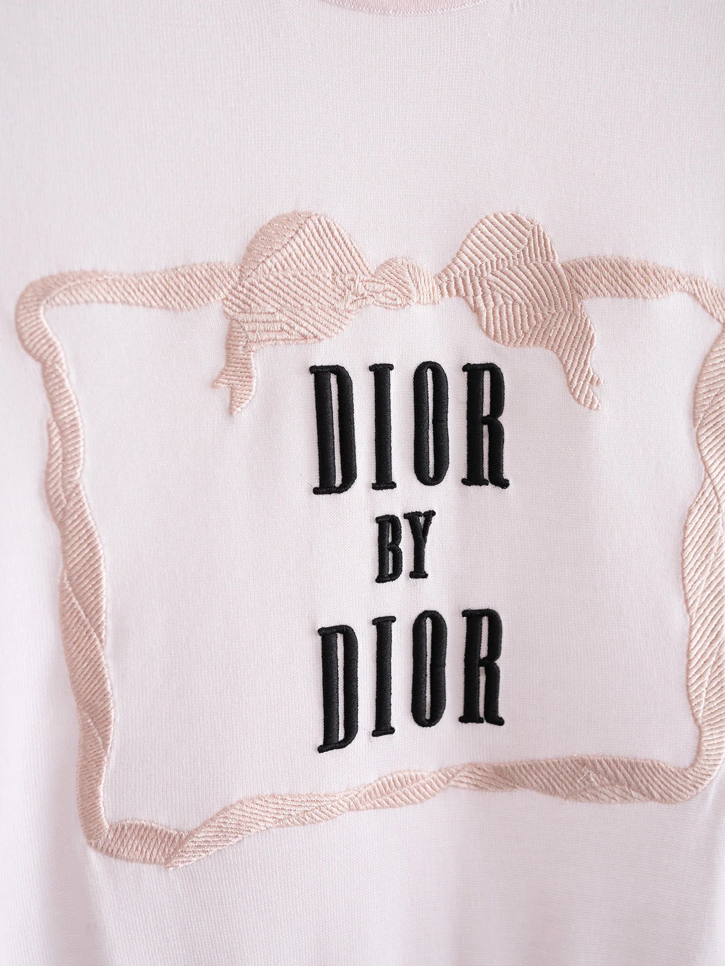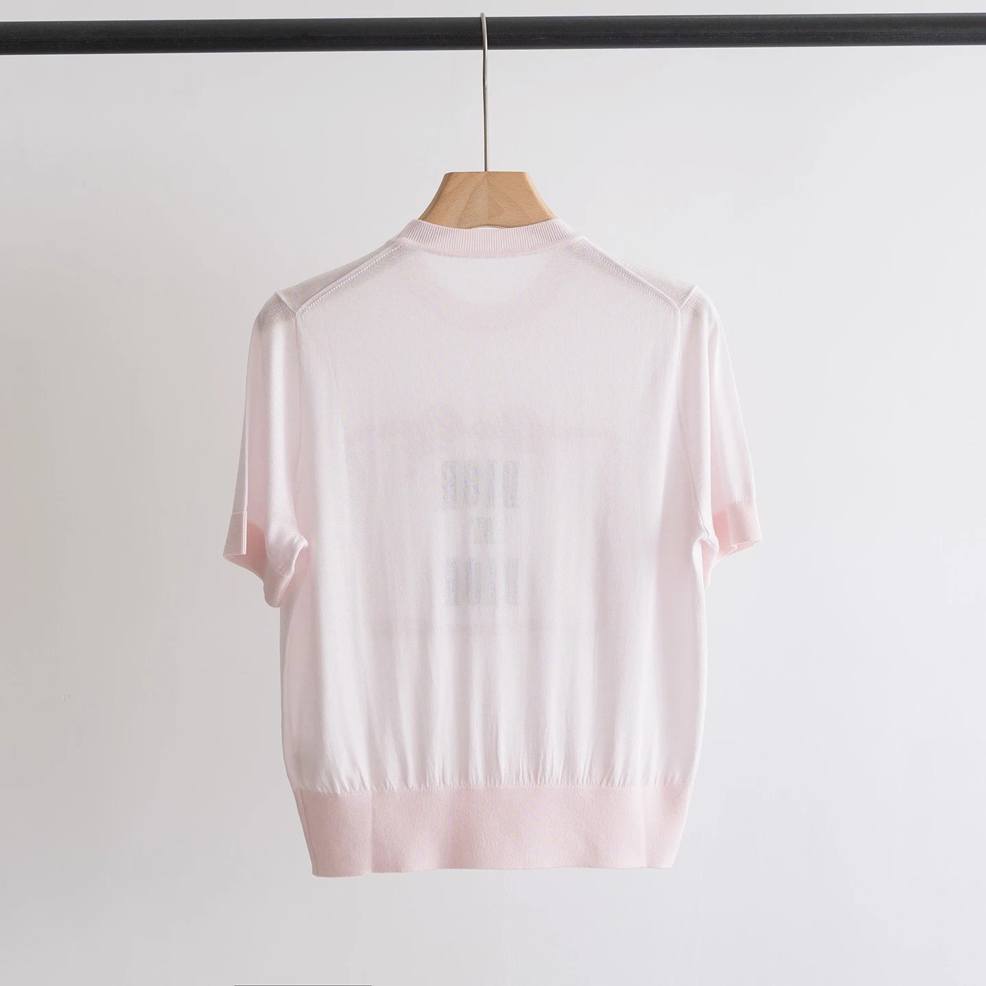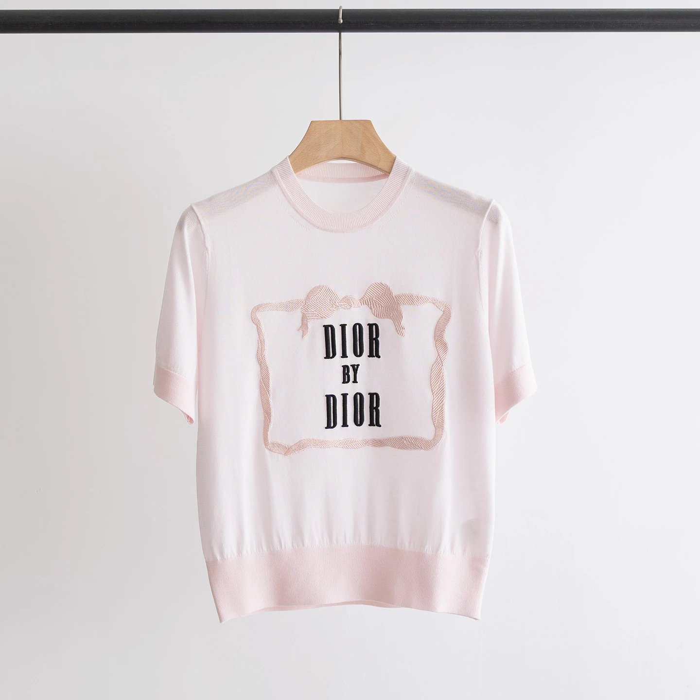 Dior 2026 Spring Summer silk knit T-shirt reinterprets 18th-century style. 51% Lenzing Modal, 43% Acrylic, 6% Mulberry Silk, 16-gauge knitting. Crew neck, front logo embroidery (3D effect). Soft, smooth, lightweight, breathable.