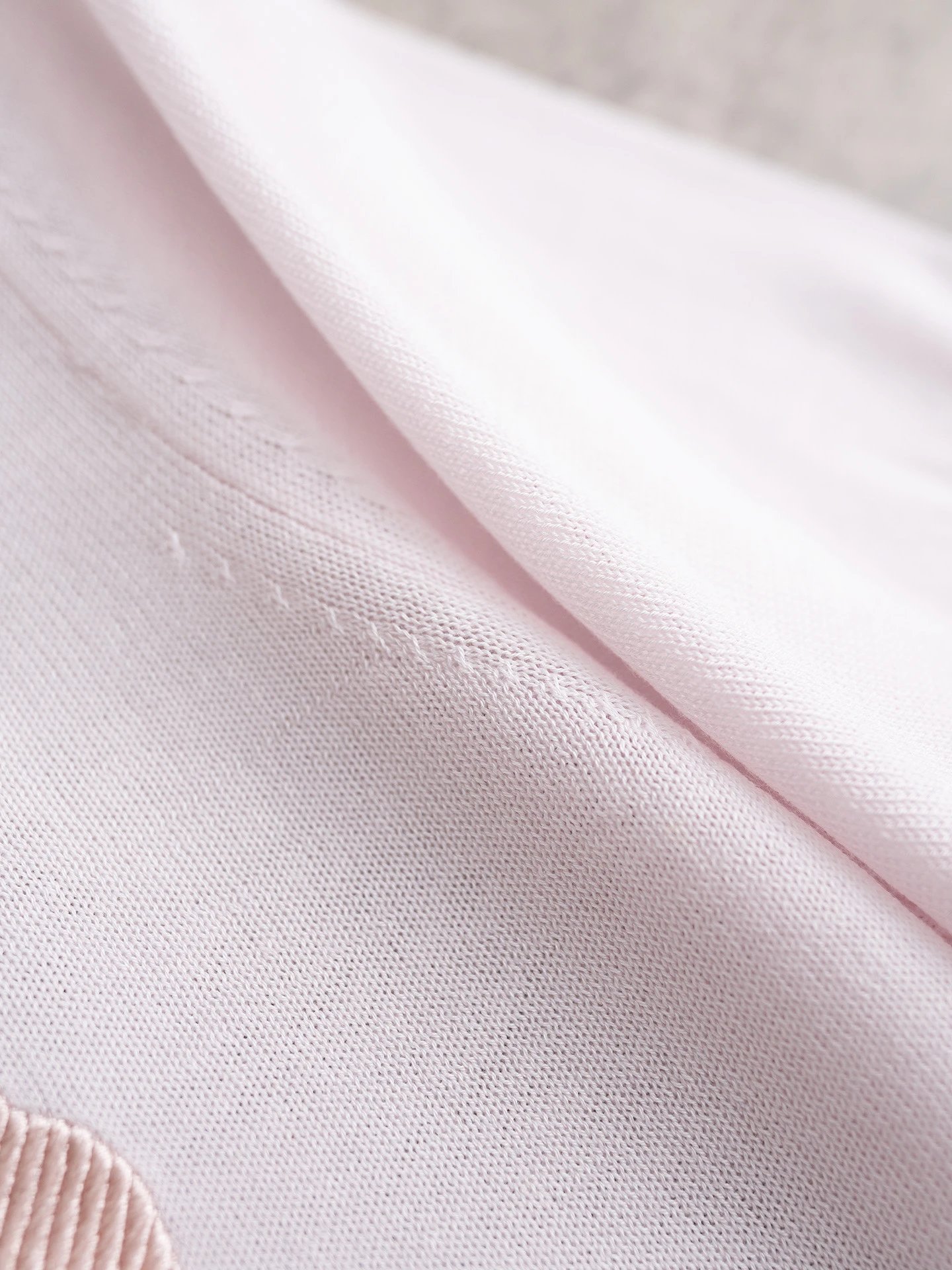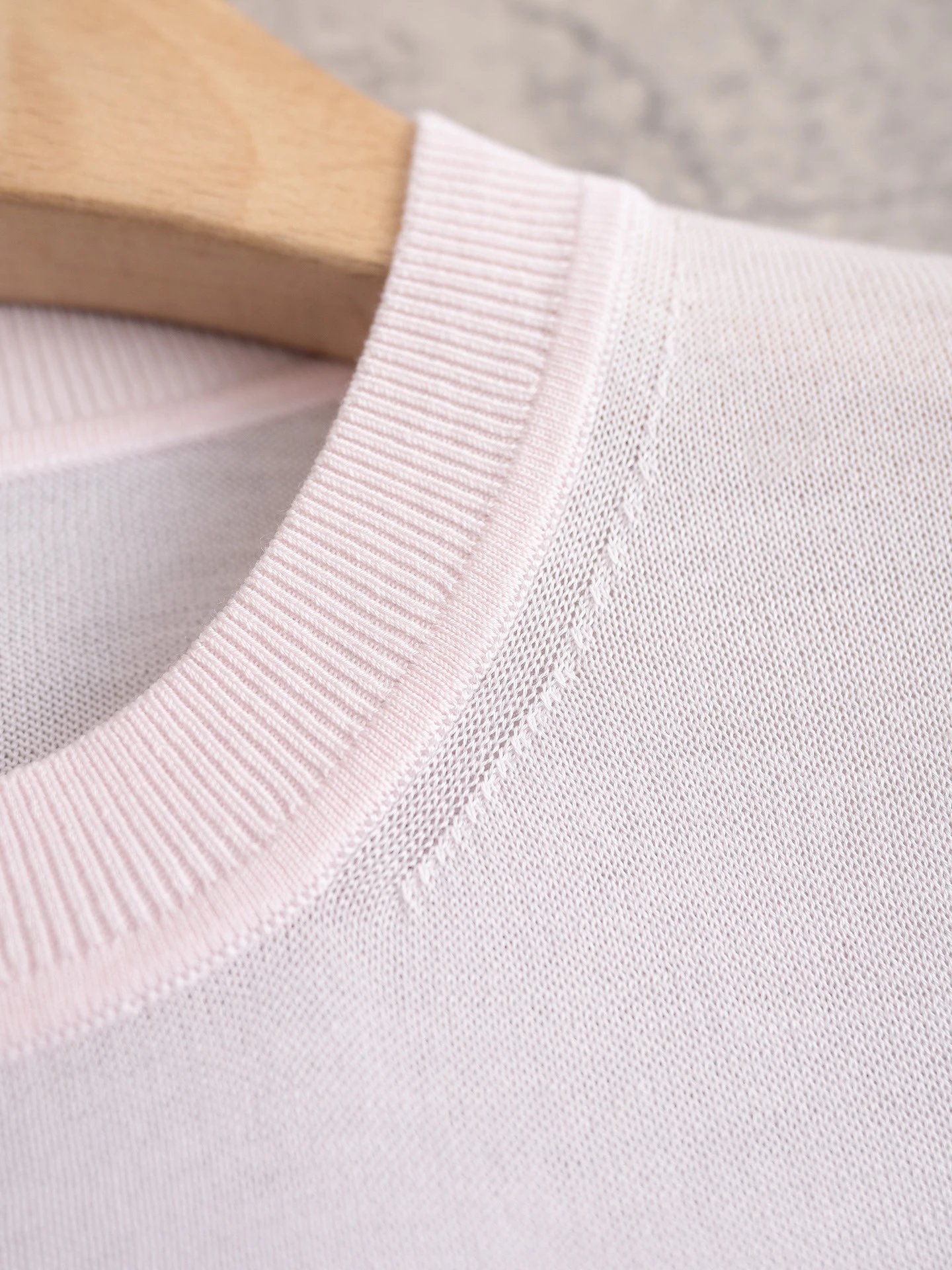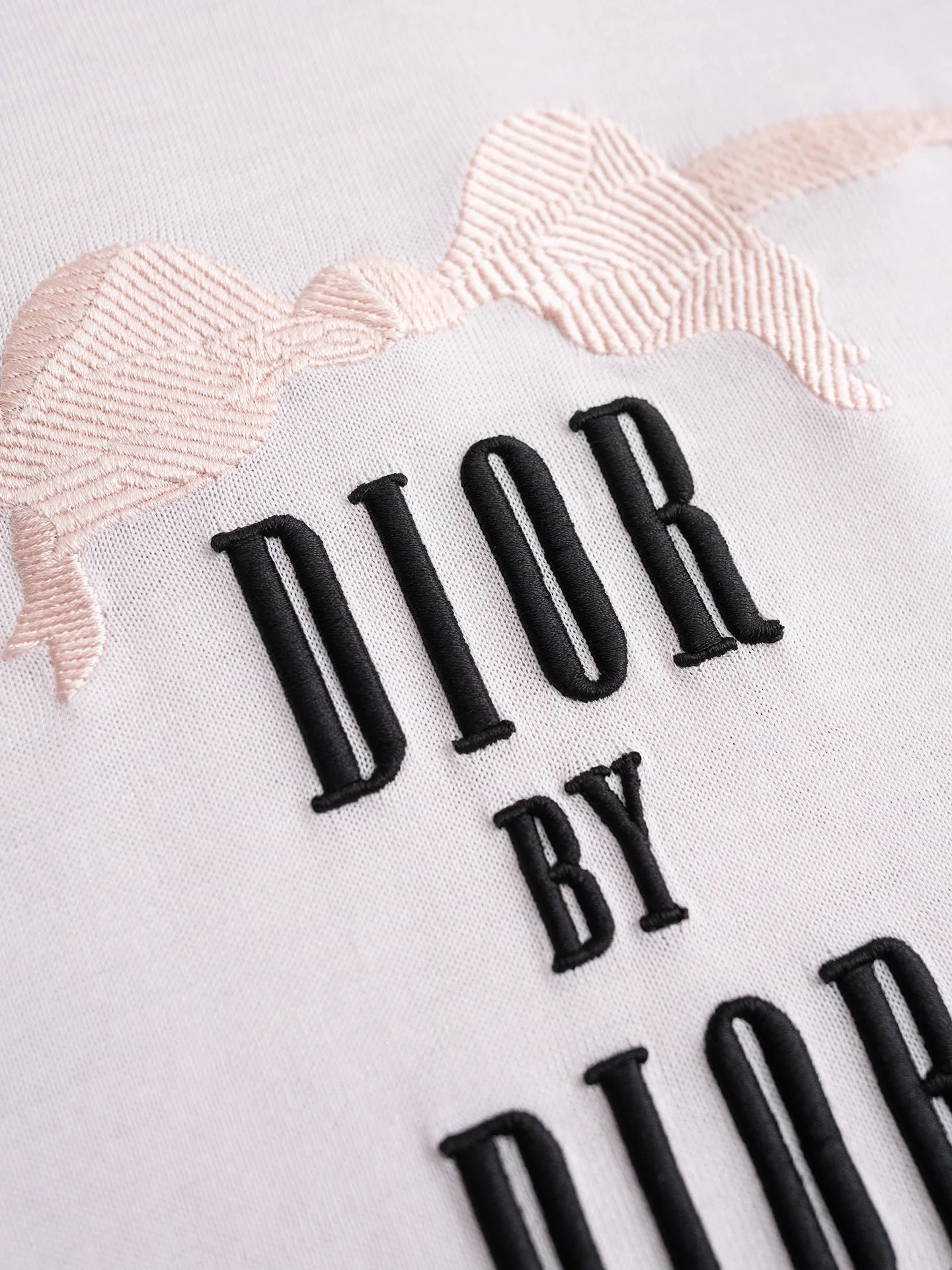 Dior 2026 Spring Summer silk knit T-shirt reinterprets 18th-century style. 51% Lenzing Modal, 43% Acrylic, 6% Mulberry Silk, 16-gauge knitting. Crew neck, front logo embroidery (3D effect). Soft, smooth, lightweight, breathable.