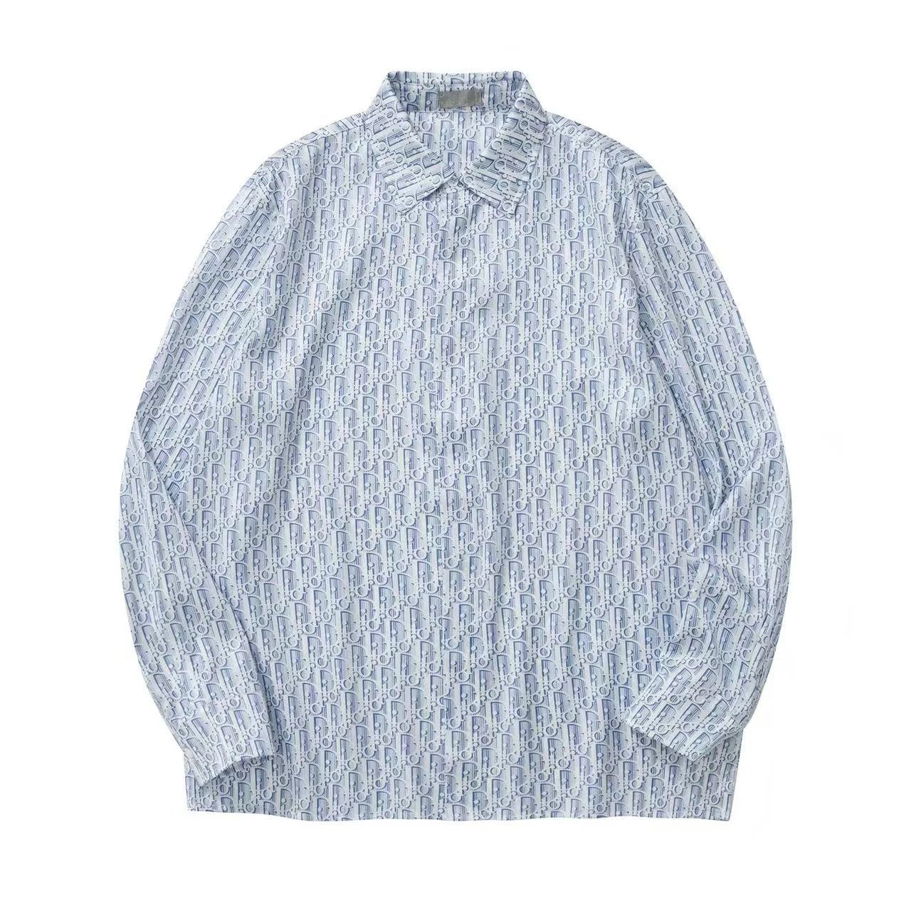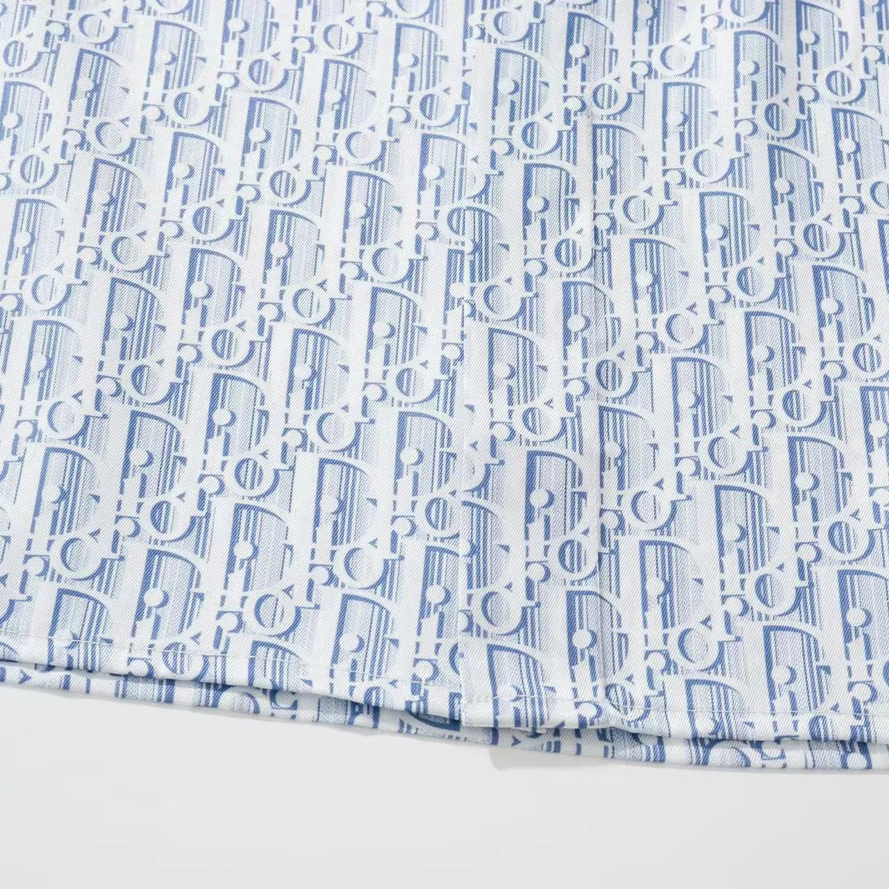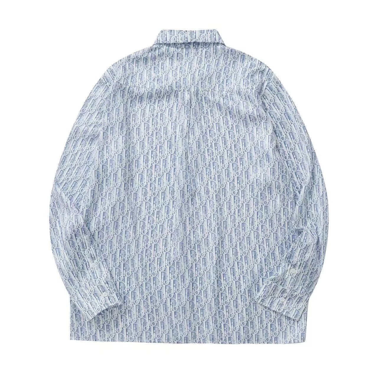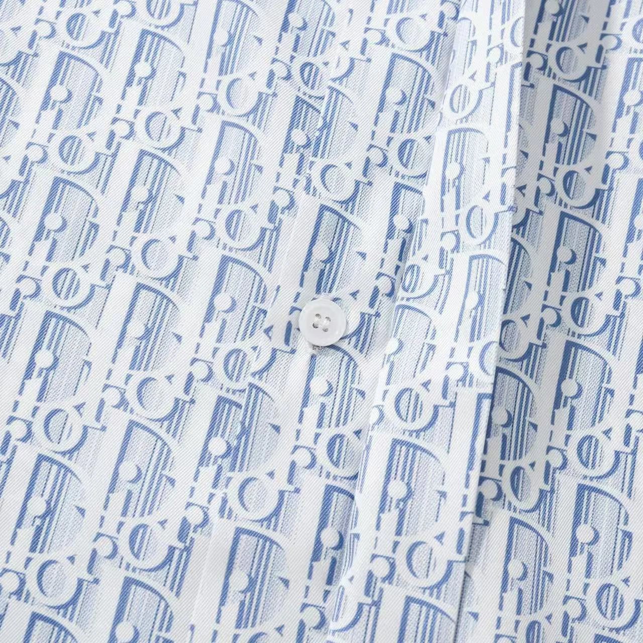 Dior new blue silk twill shirt features Oblique print & stripes, classic cut with hidden buttons.