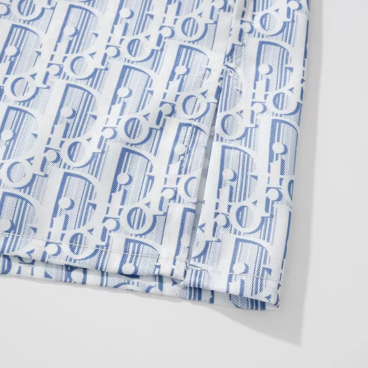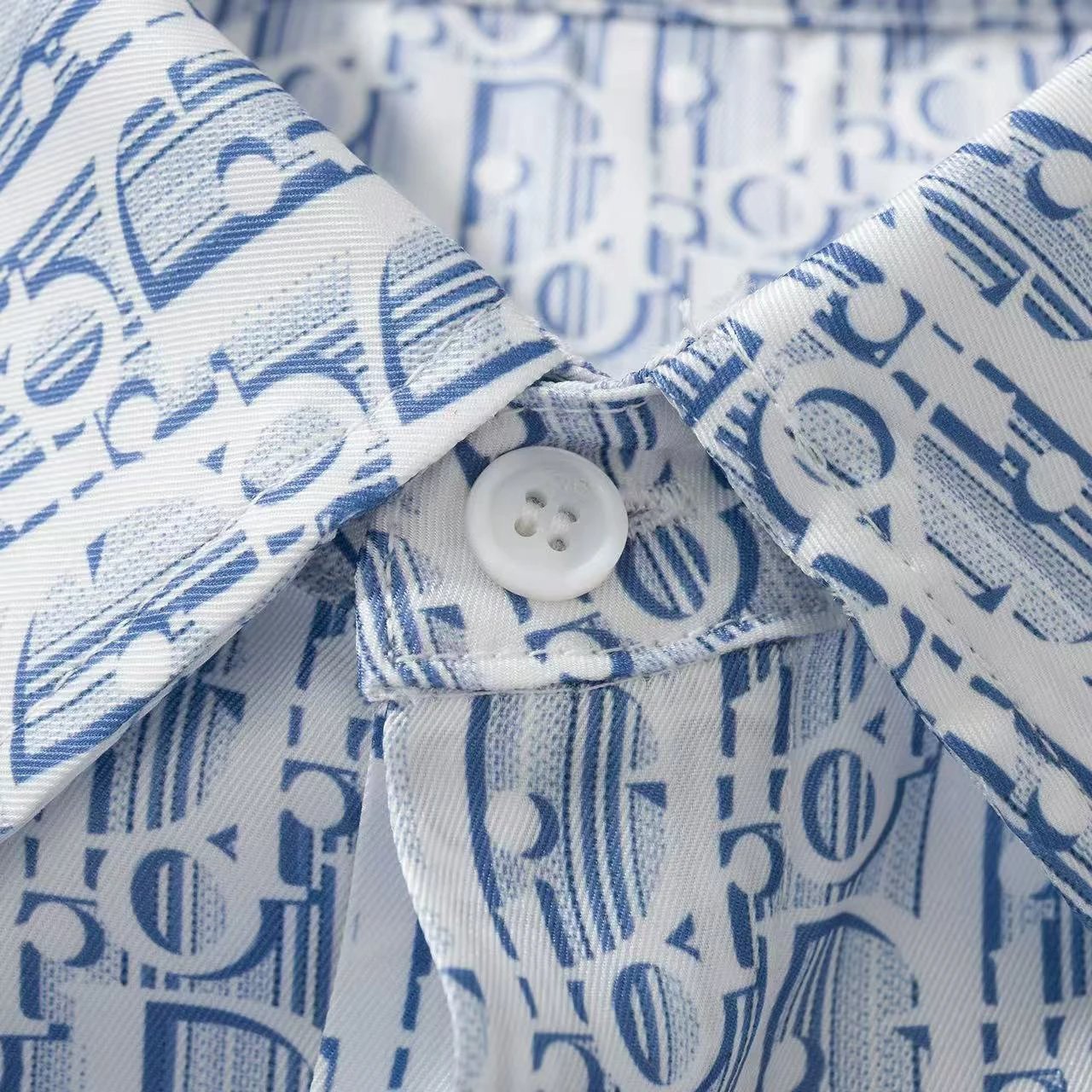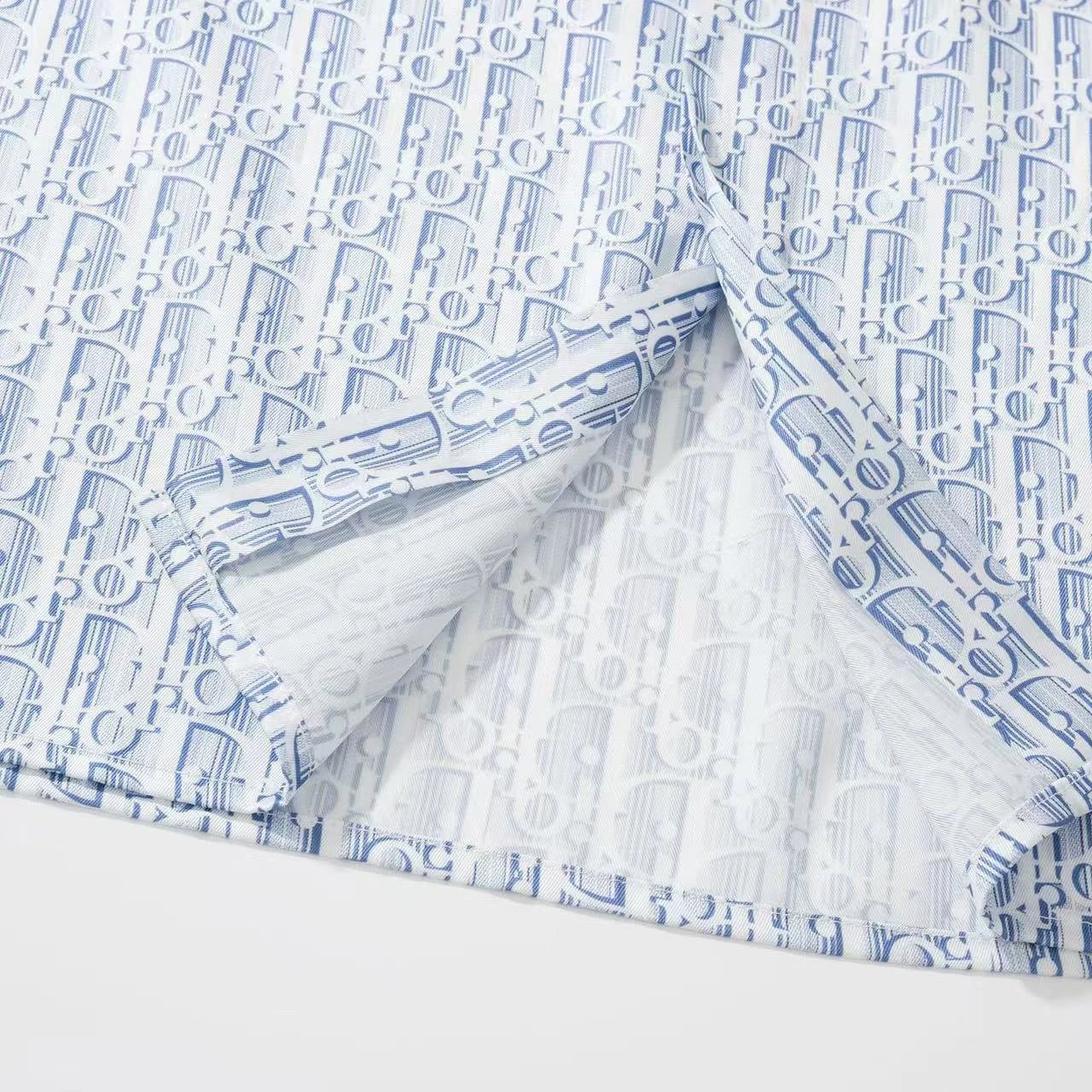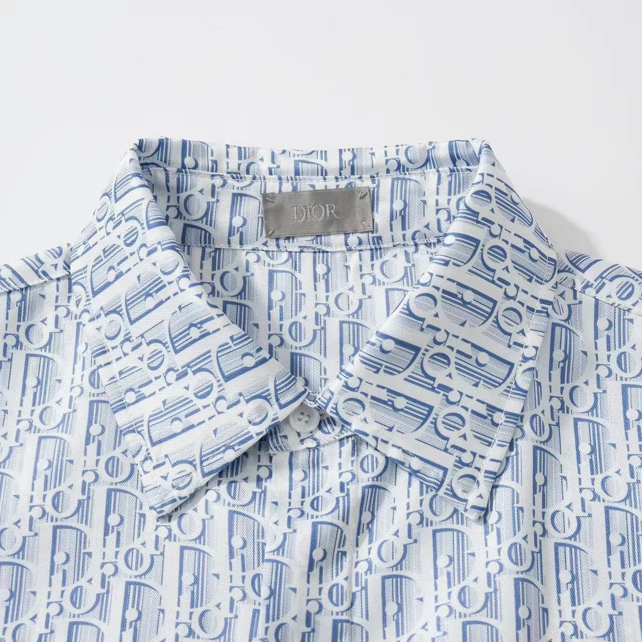 Dior new blue silk twill shirt features Oblique print & stripes, classic cut with hidden buttons.
