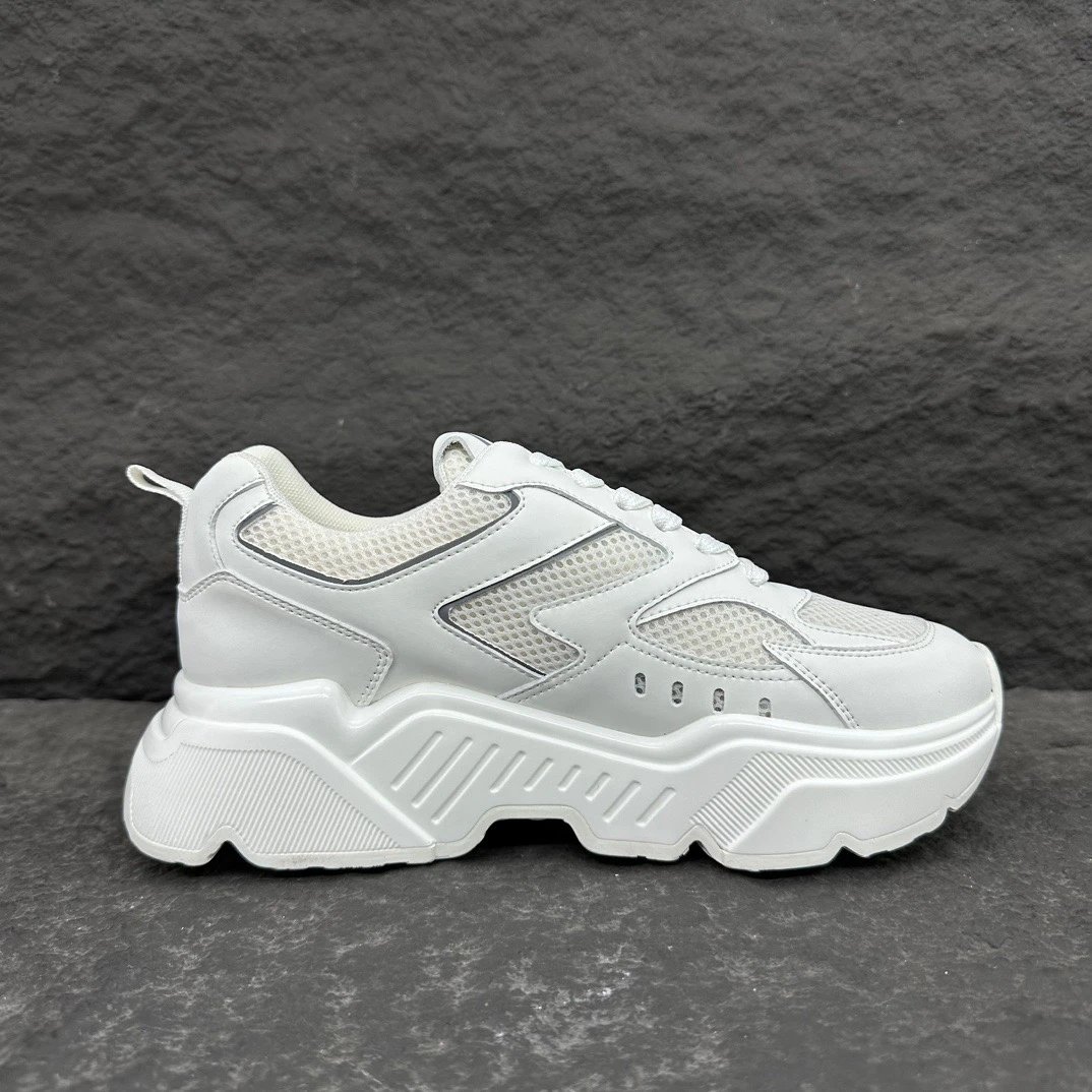 White nappa upper, silver logo, gray calfskin heel, Super Flex rubber sole.