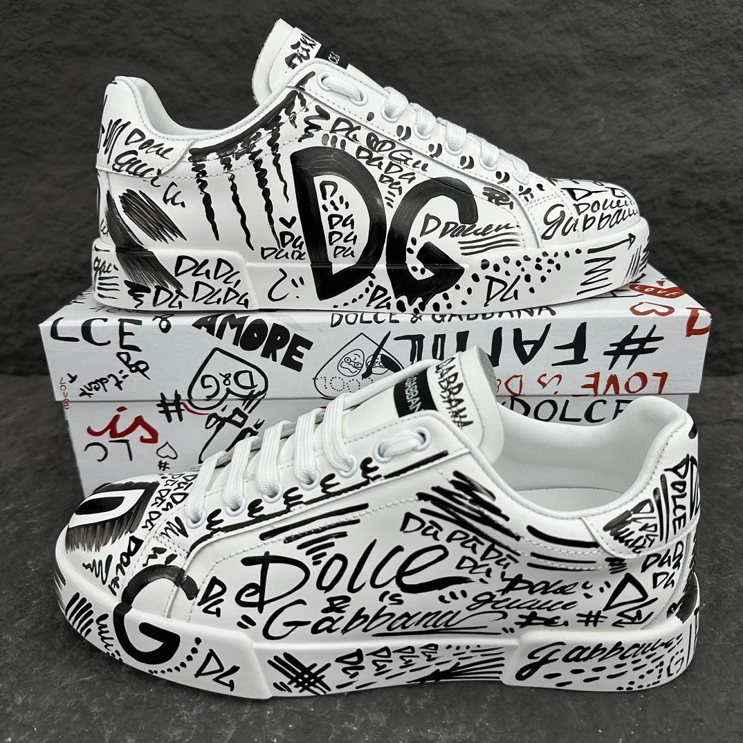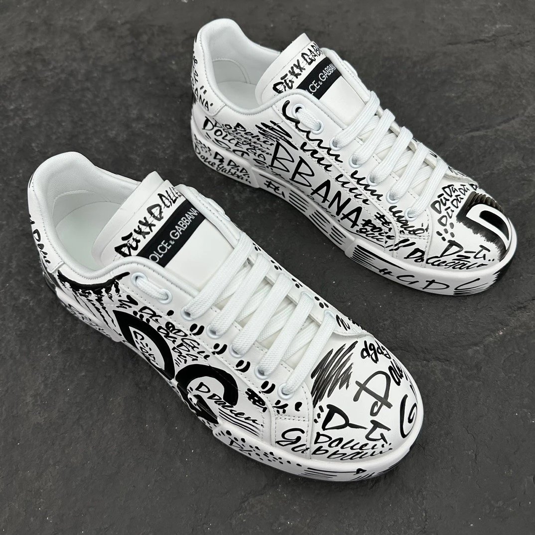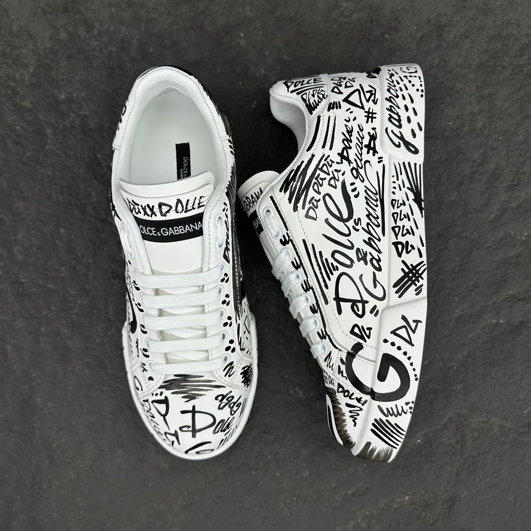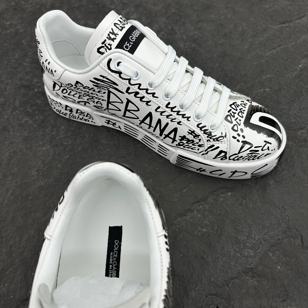 Dolce Gabbana Portofino Graffiti Calfskin Unisex Sneakers feature vibrant graffiti prints and signature logo details.