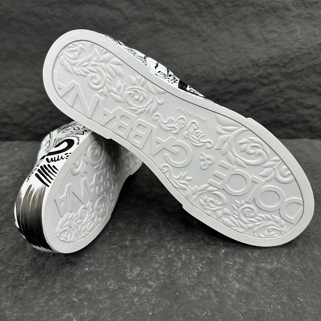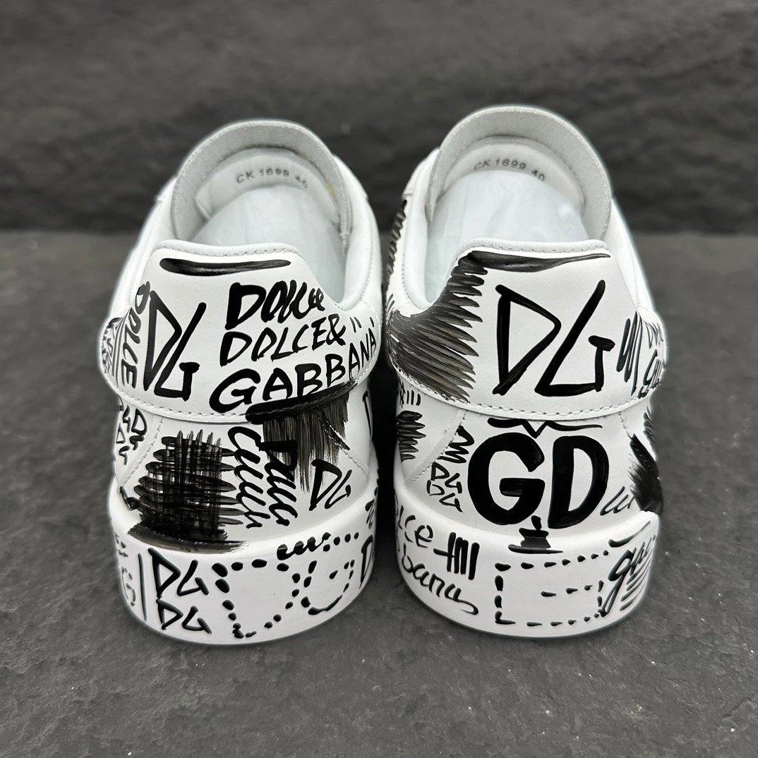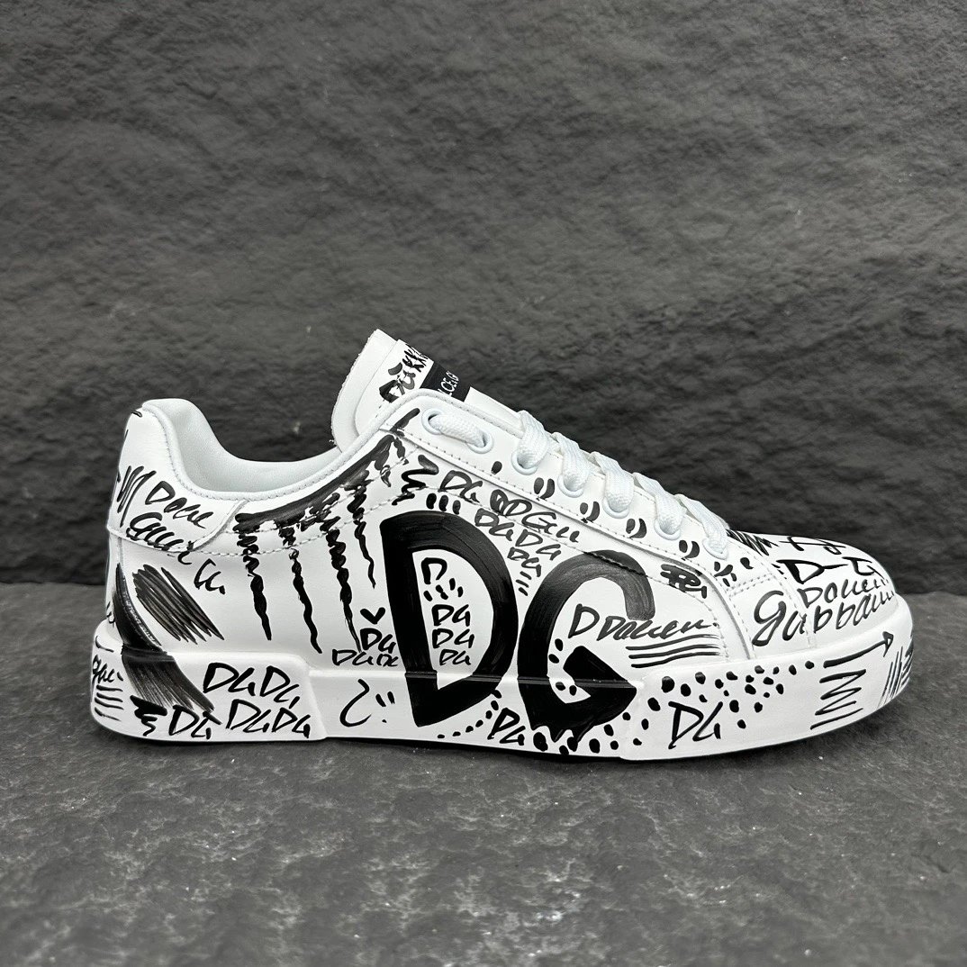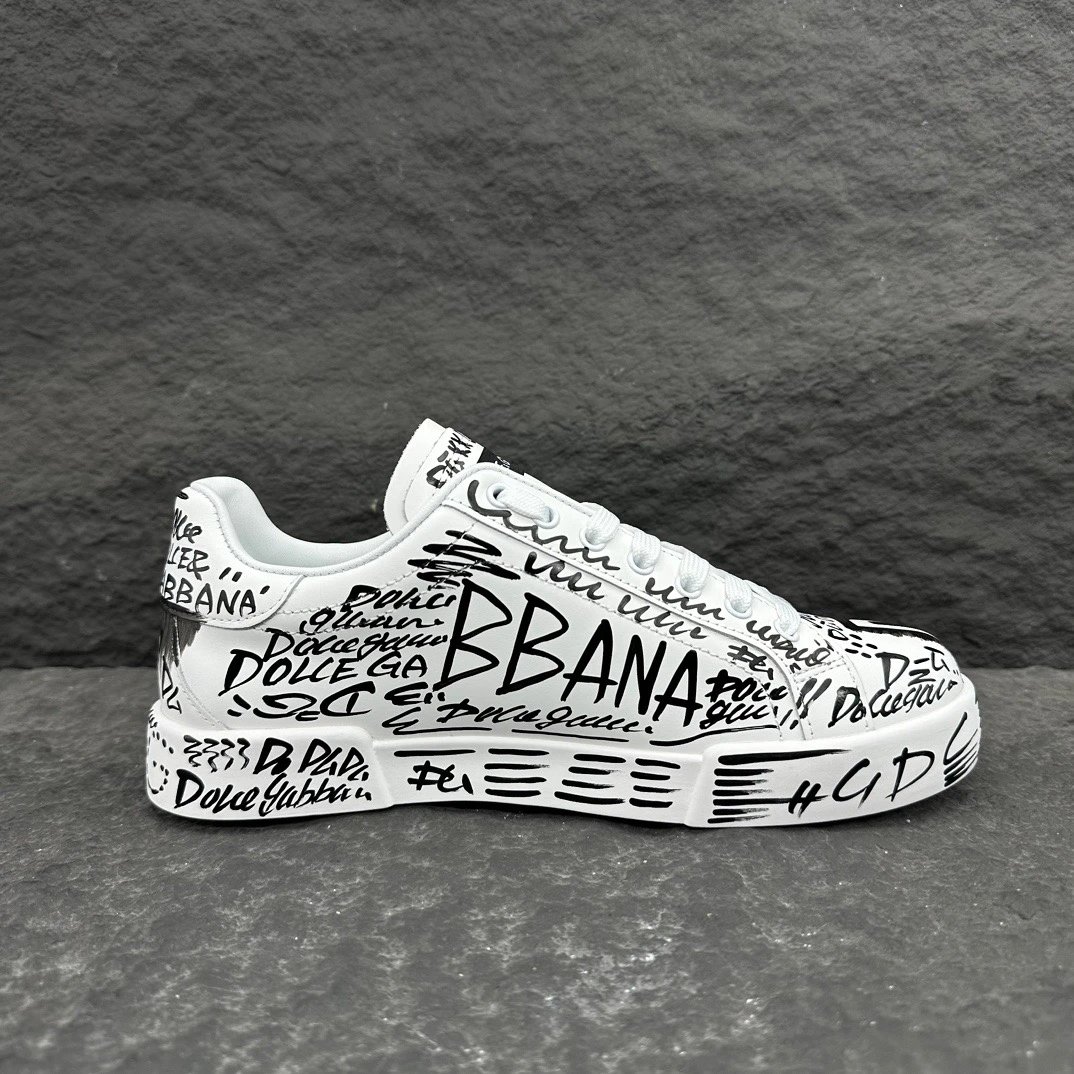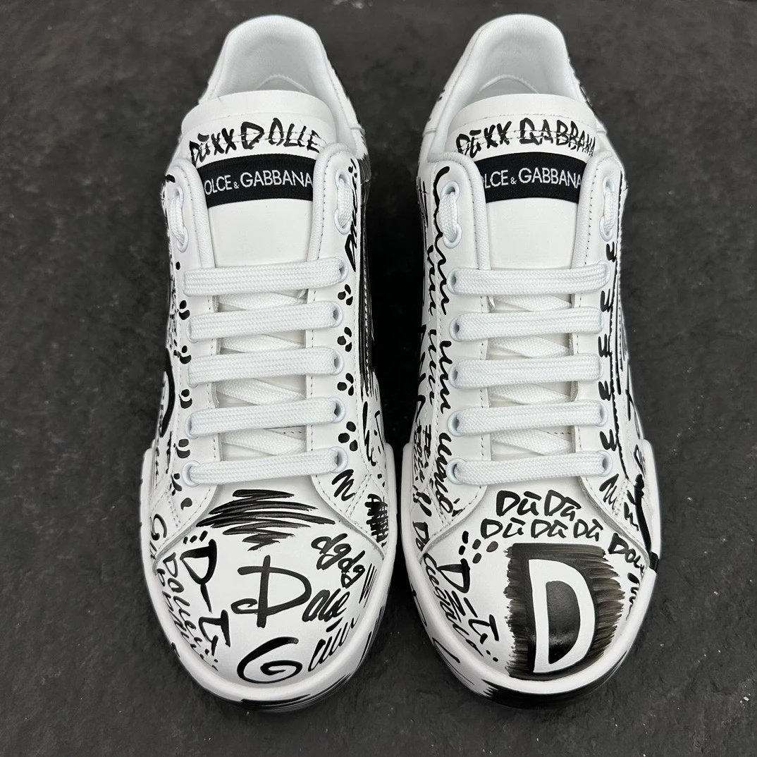 Dolce Gabbana Portofino Graffiti Calfskin Unisex Sneakers feature vibrant graffiti prints and signature logo details.