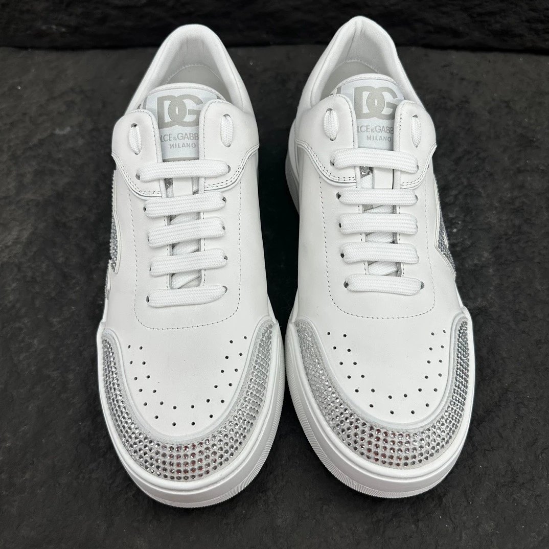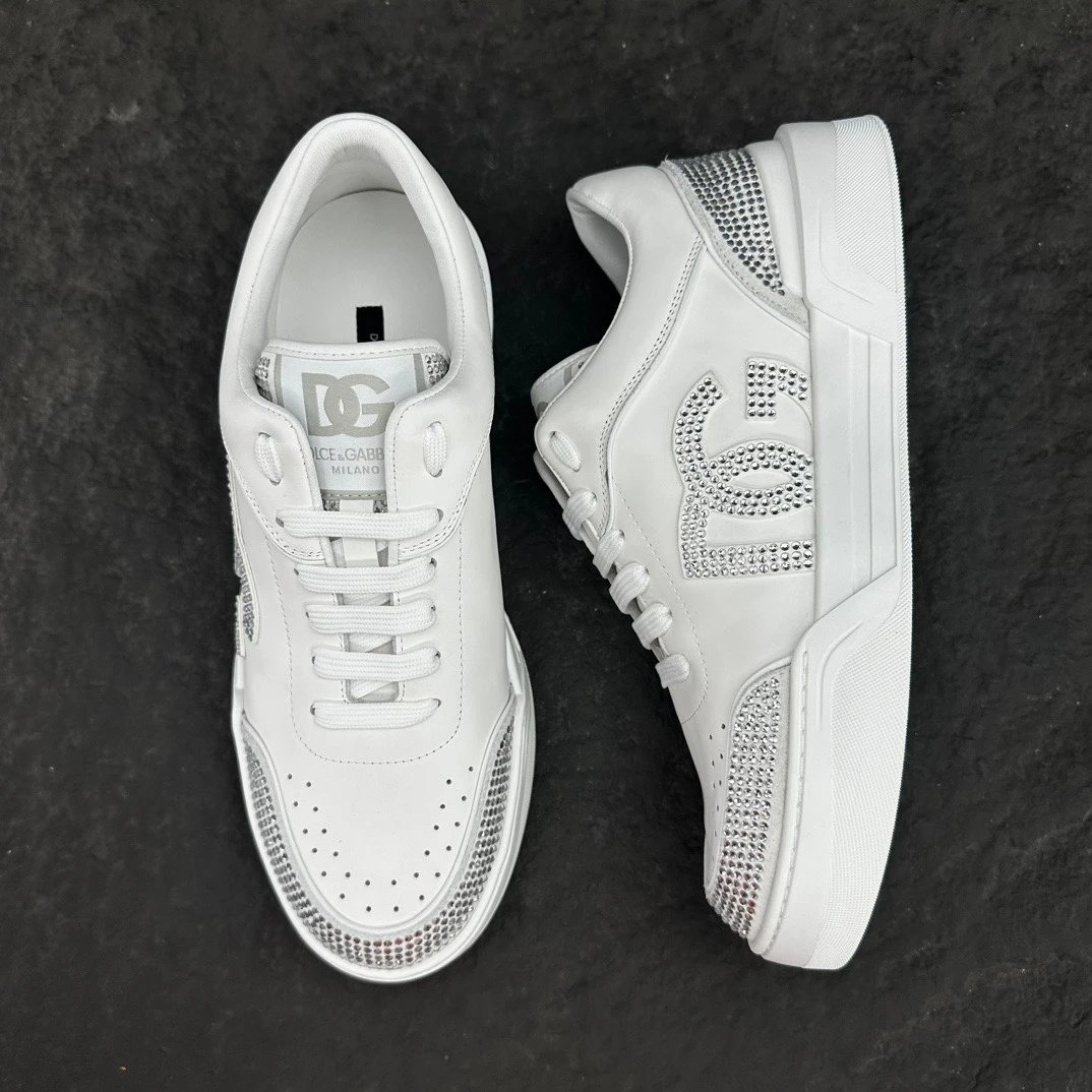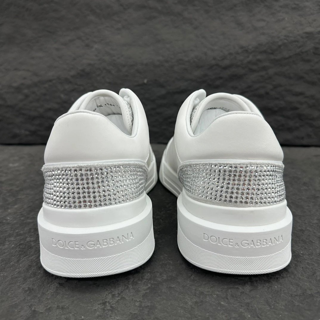 Dolce Gabbana New Roma Crystal Embellished Sneakers feature calfskin & suede uppers with flat laces and logo tongue.