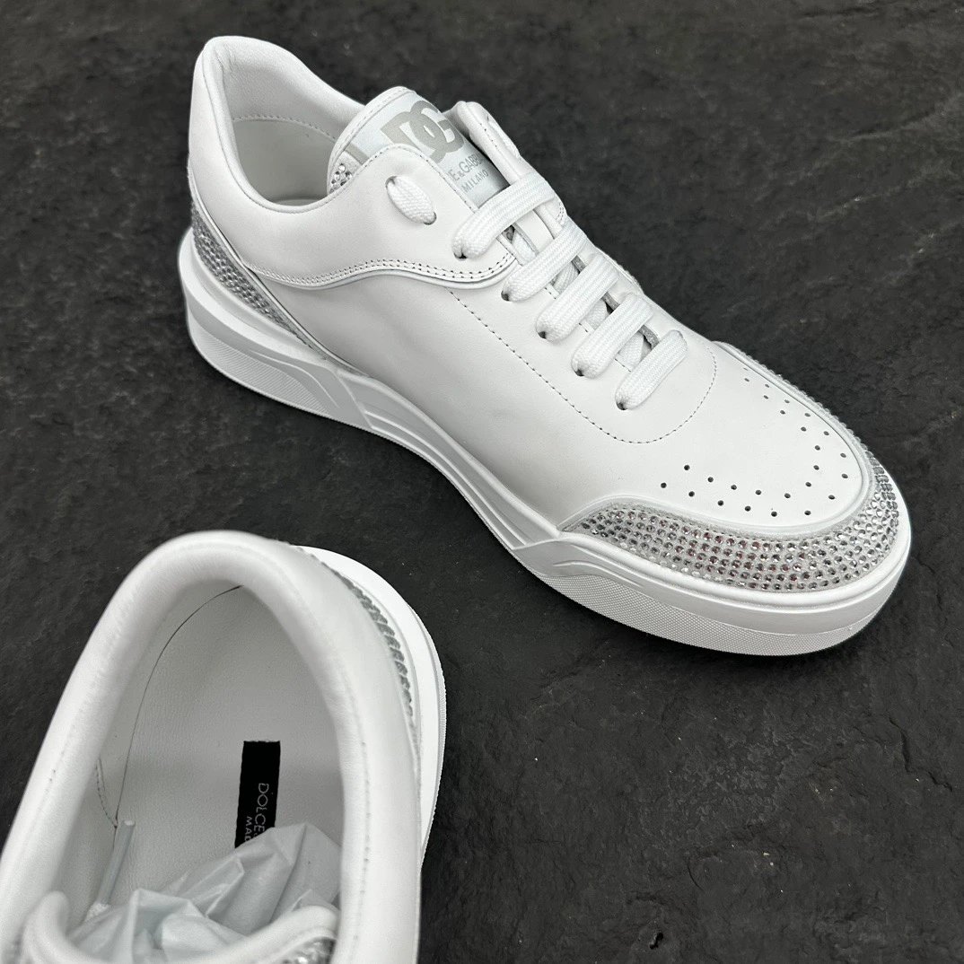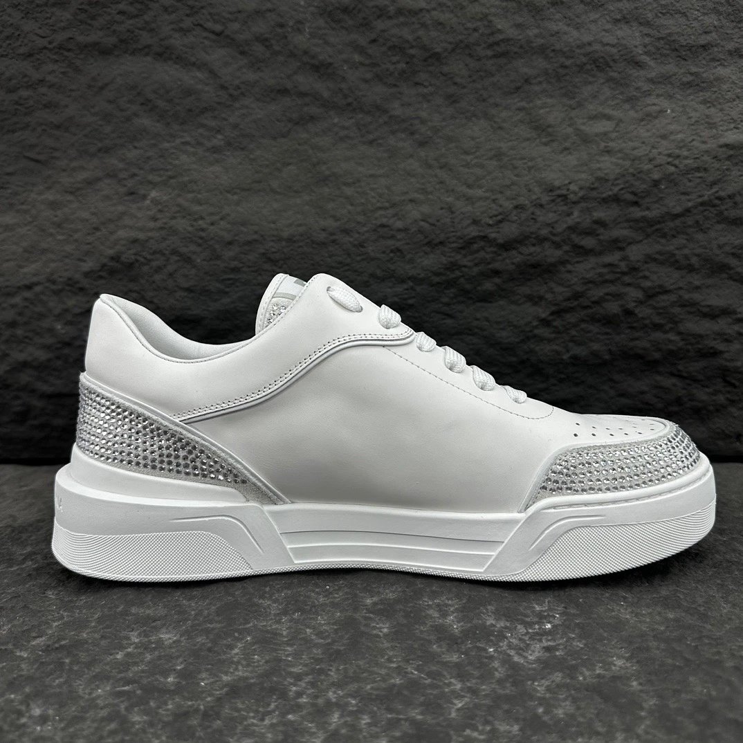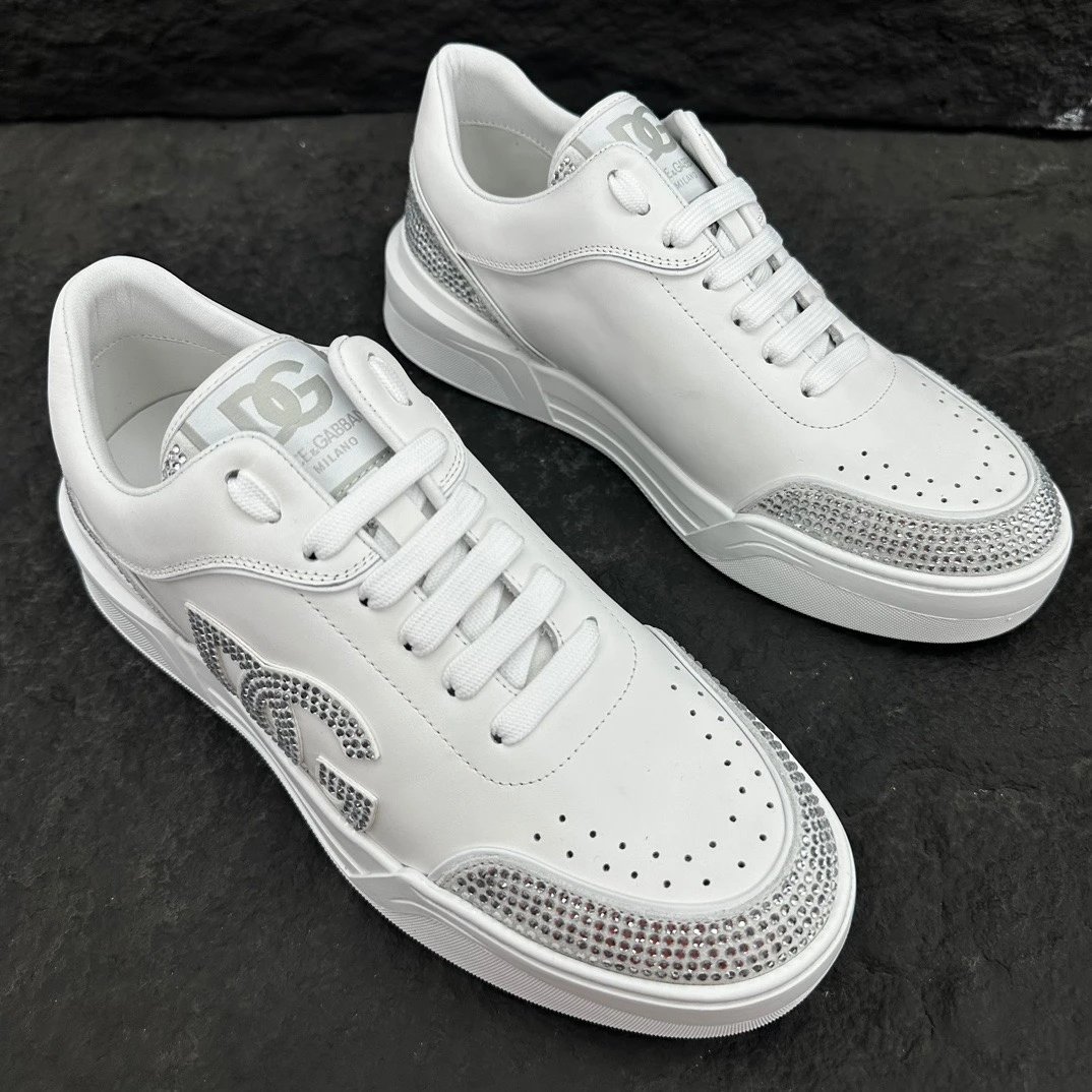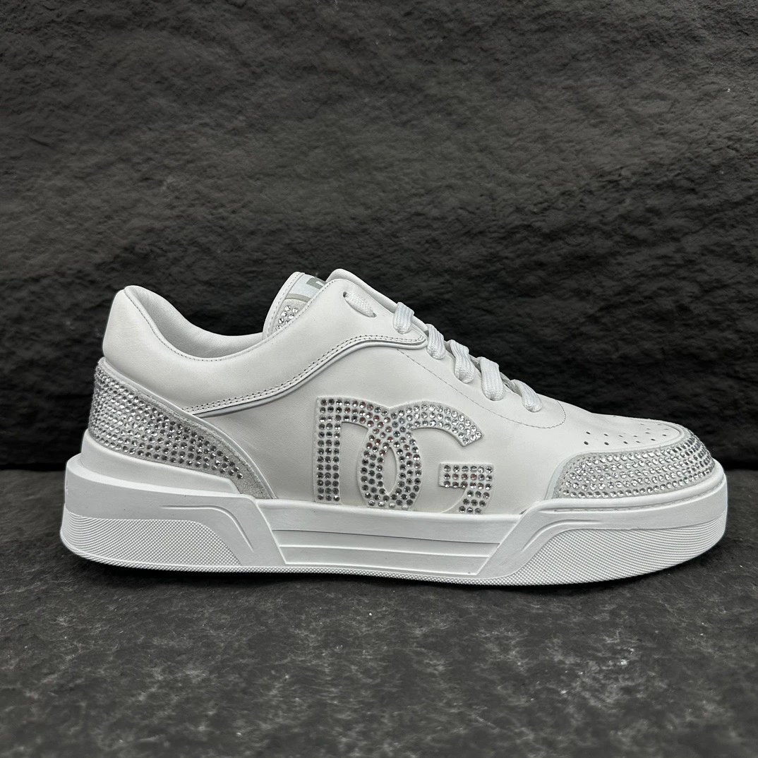 Dolce Gabbana New Roma Crystal Embellished Sneakers feature calfskin & suede uppers with flat laces and logo tongue.