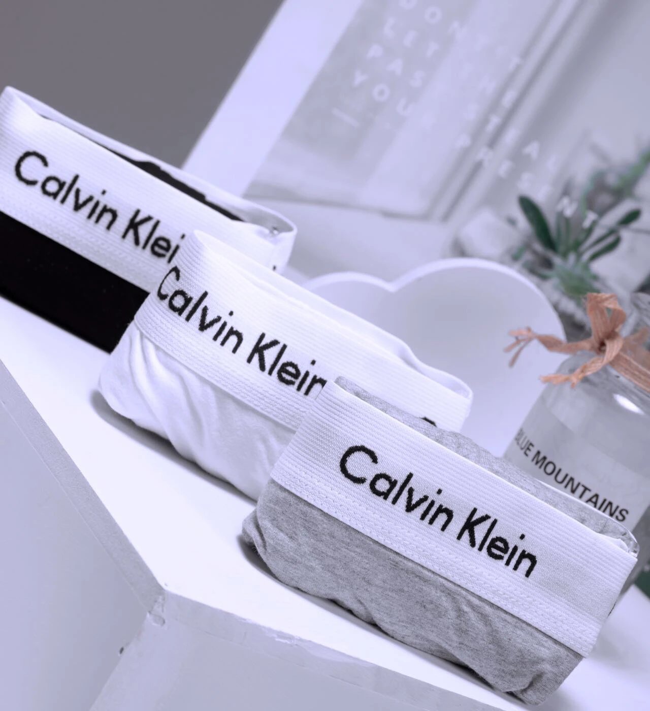 Calvin Klein Custom White Waist Series Men's Boxer Briefs include a 3-pack of classic colors: black, white, gray.