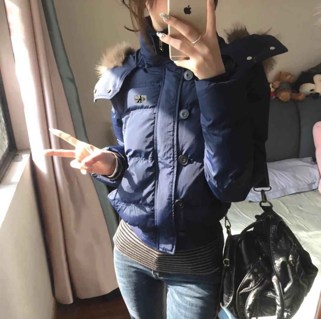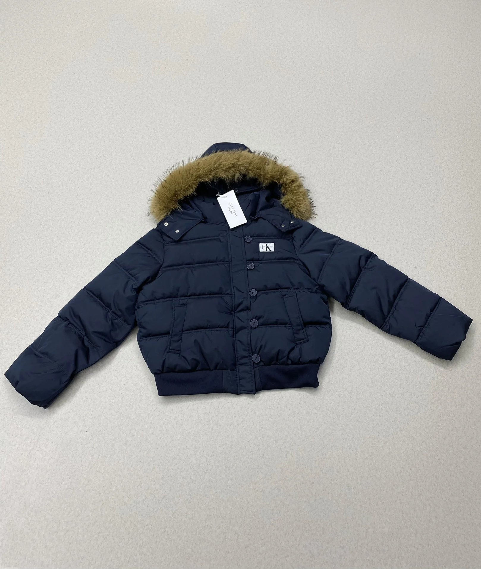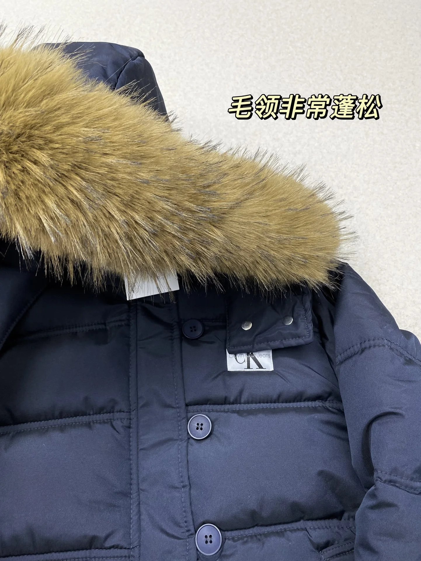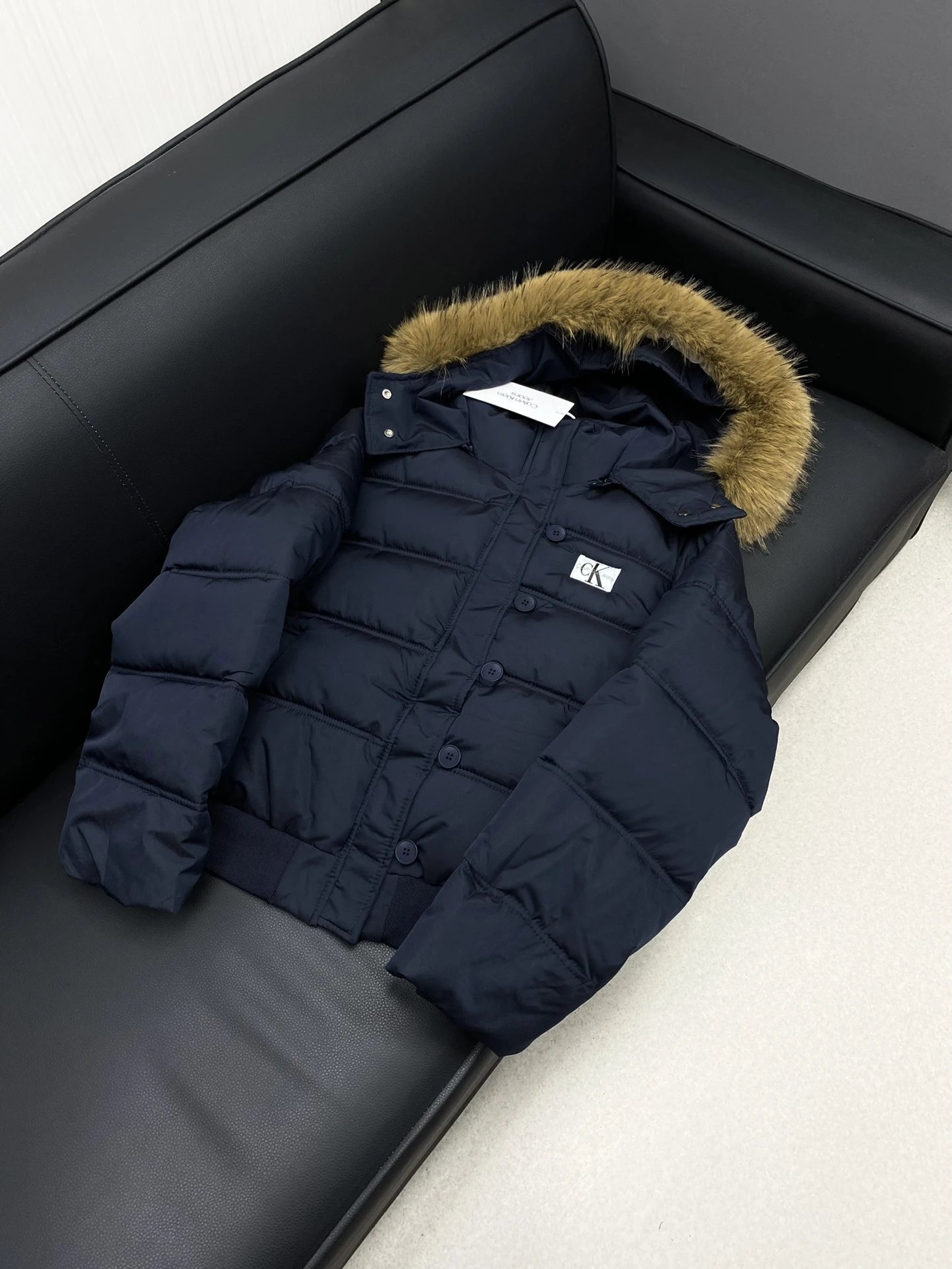 Calvin Klein Unisex Hooded Down Padded Jacket features thick raccoon fur collar, embroidered logo & high-quality fluffy warmth.