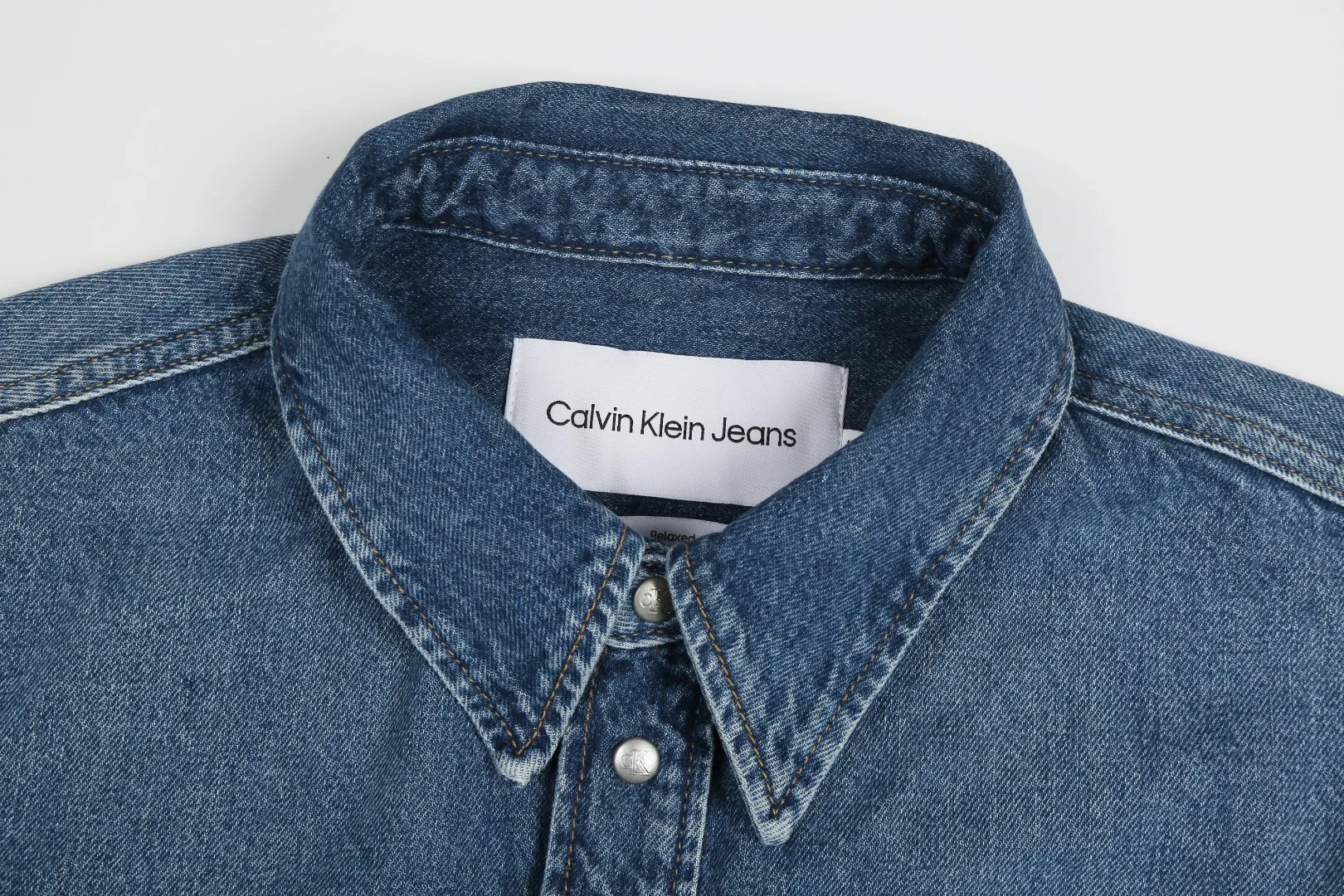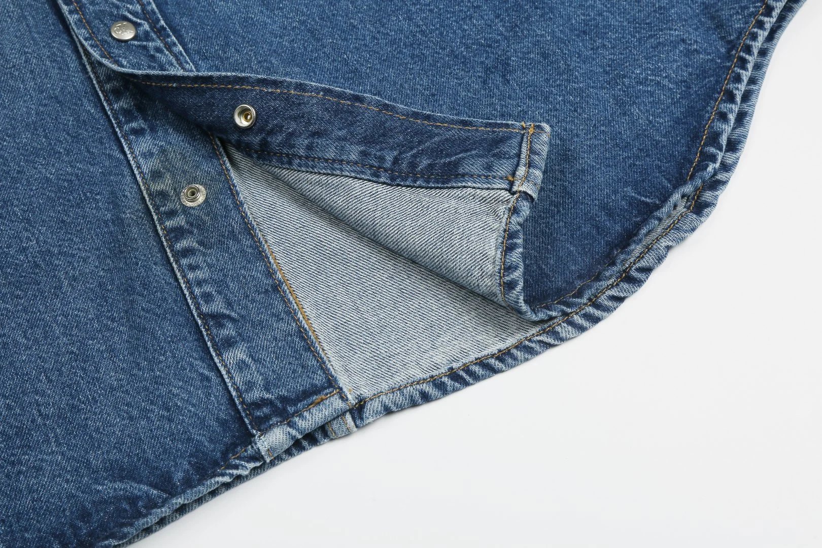 Made with original 10*7 white weft yarn, features custom woven label, 1.2mm snap buttons, clean edge treatment.