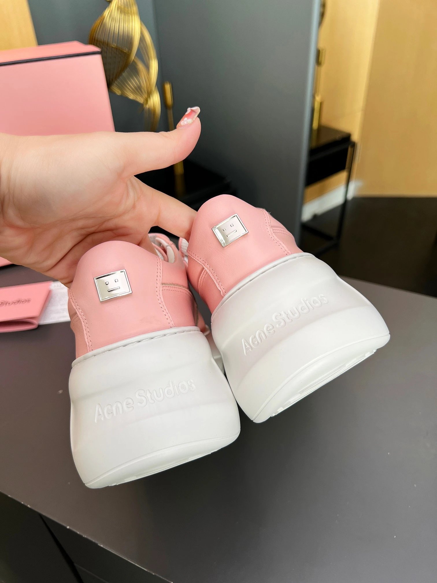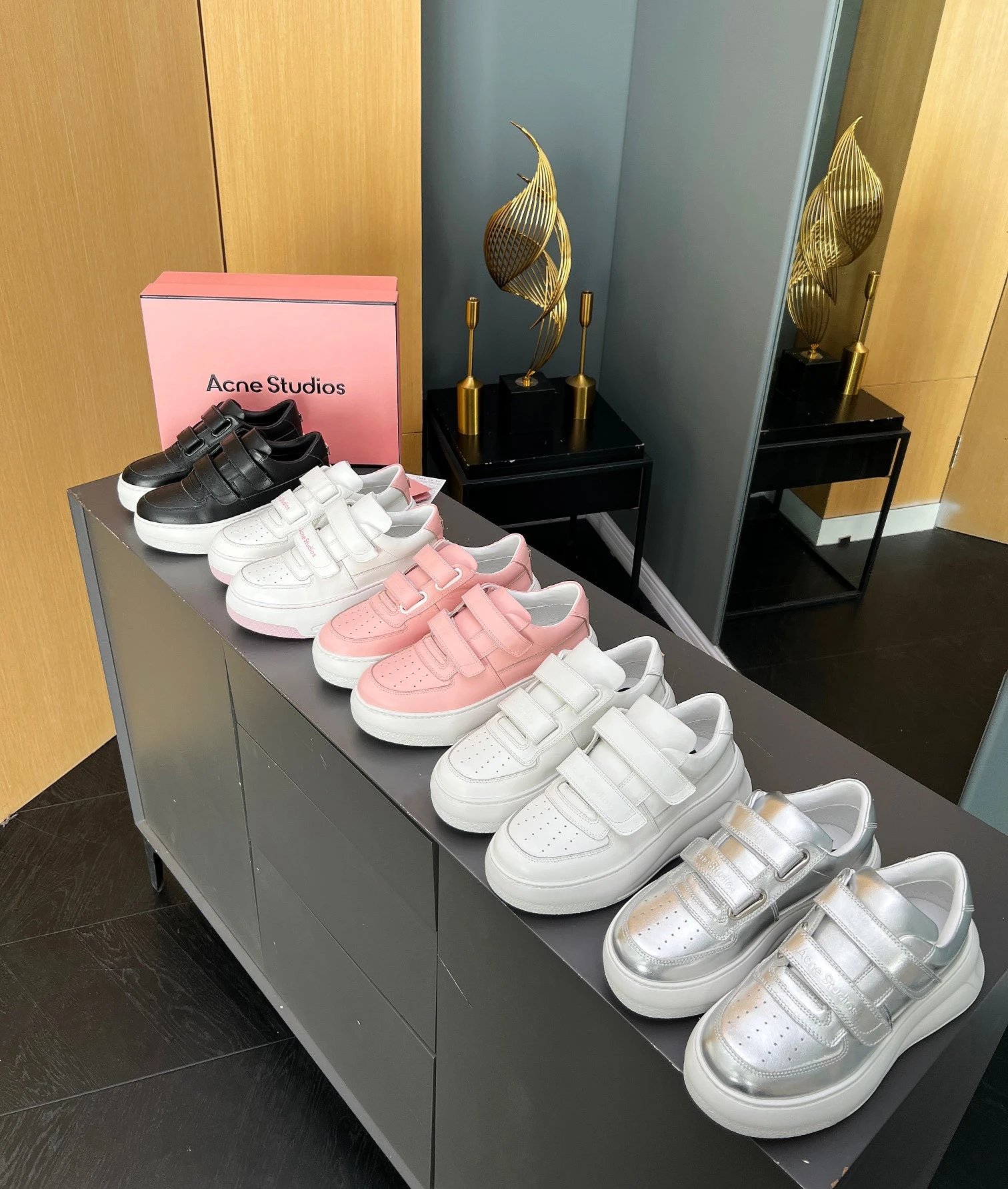 Acne Studios Women's White Smile Velcro Sneakers: round toe, cute heel smile, easy adjustable Velcro closure.