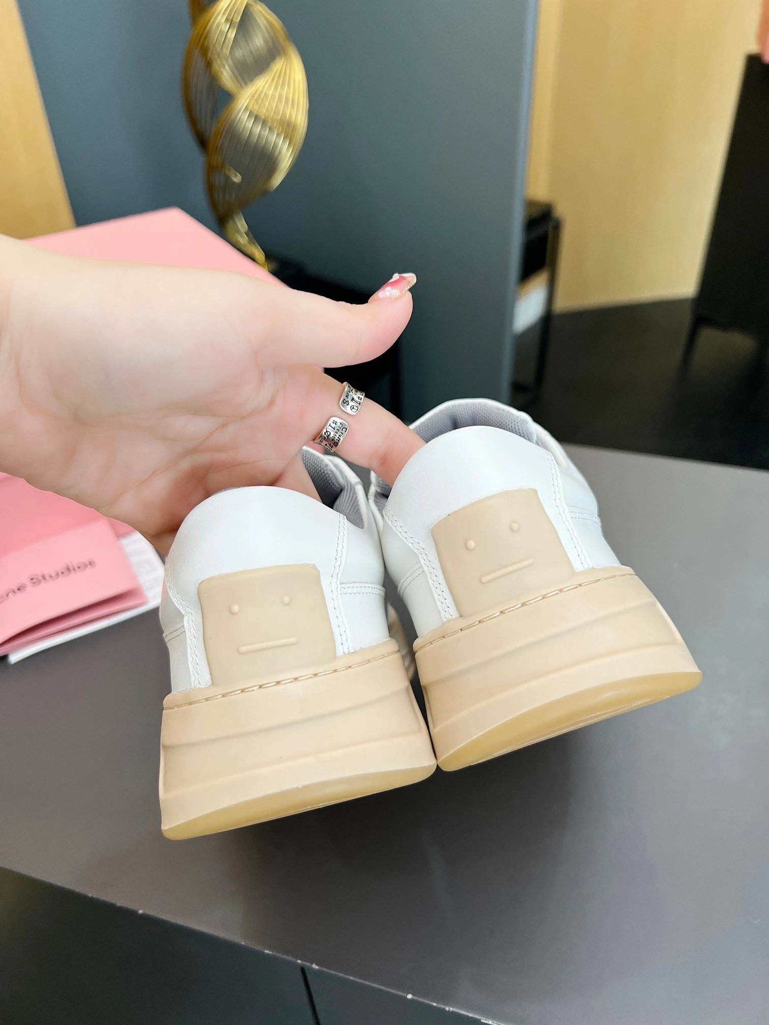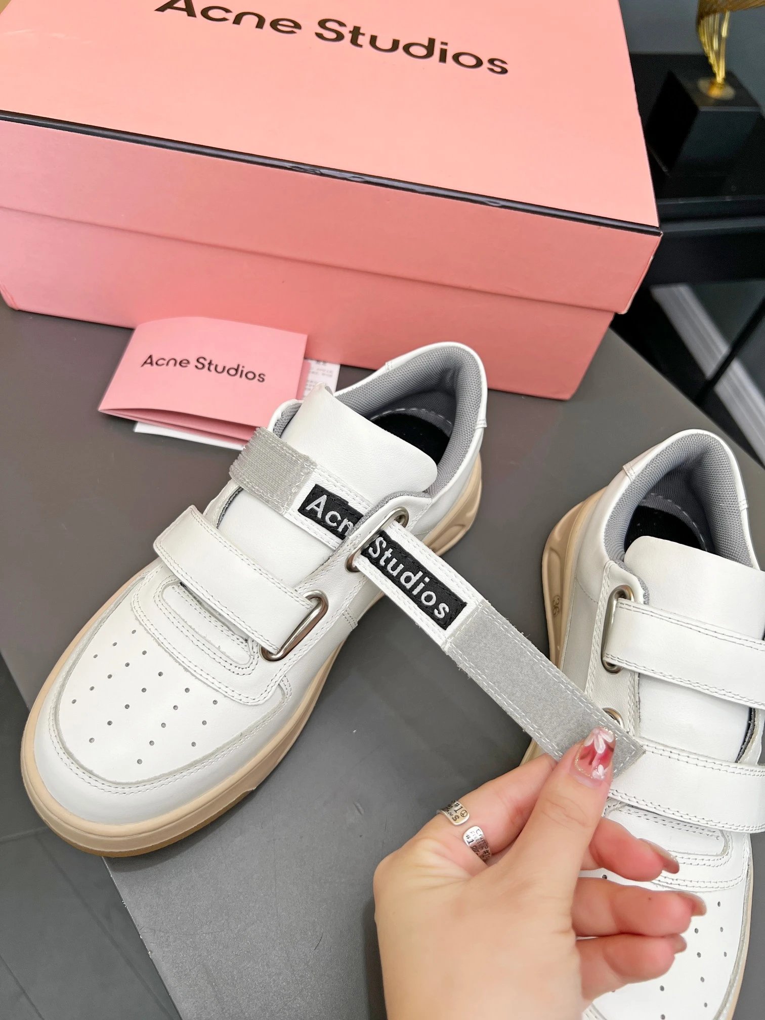 Acne Studios Smiley Velcro White Sneakers feature a cute smiley design, thick 4cm sole, and easy velcro closure.