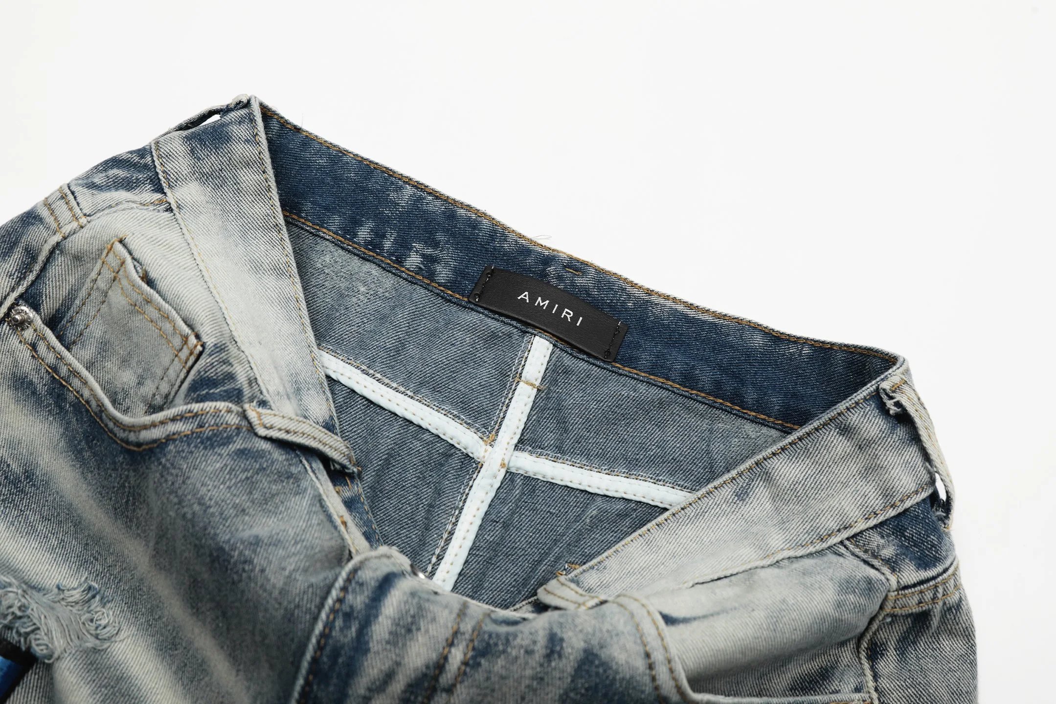 Premium washed denim, high-end vibe; knee rips + leather panels, leather waist label.