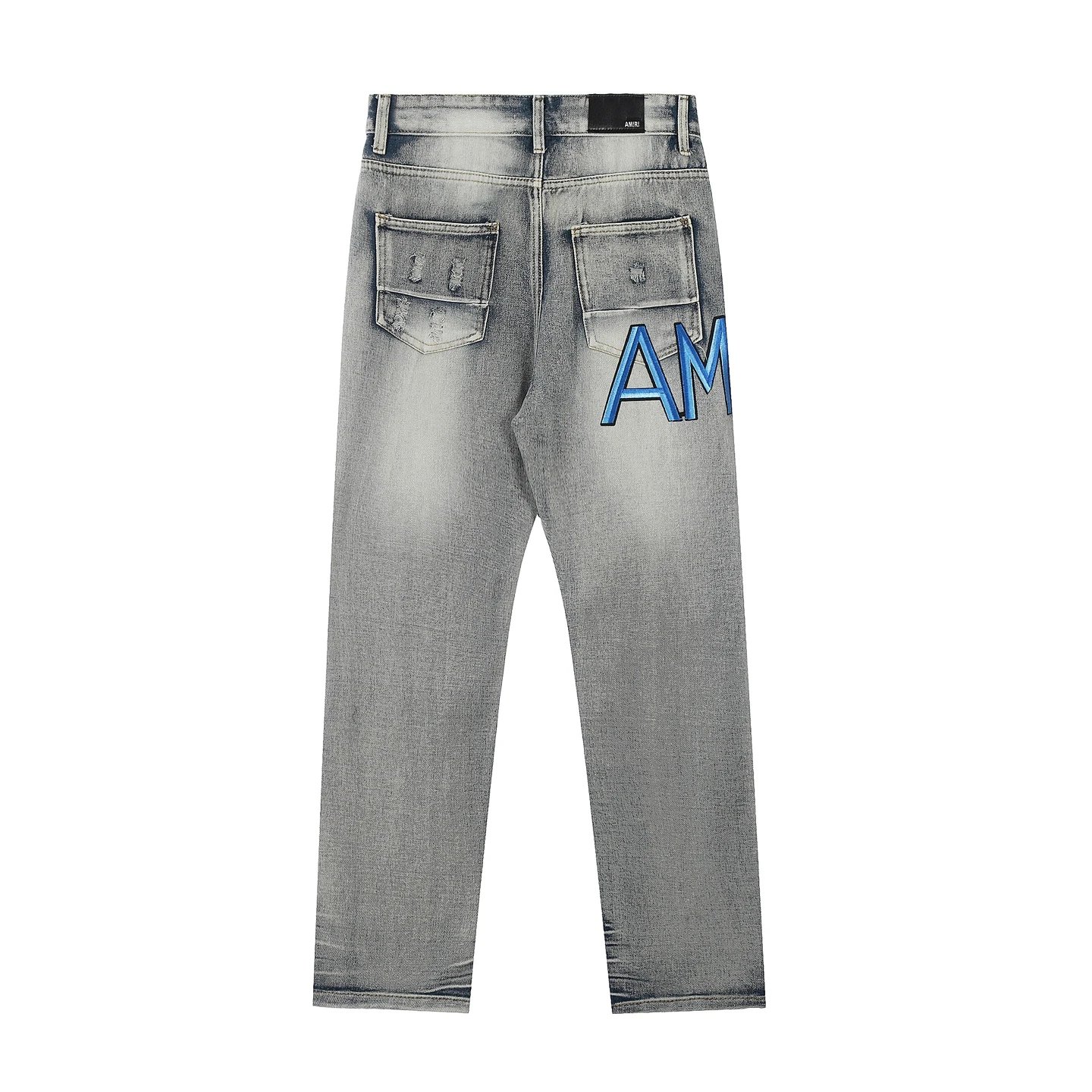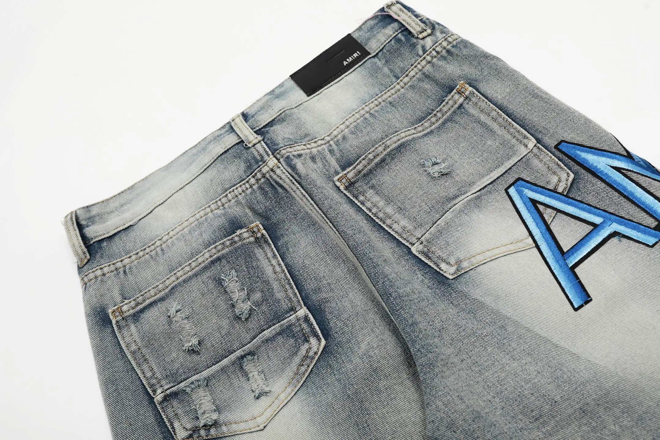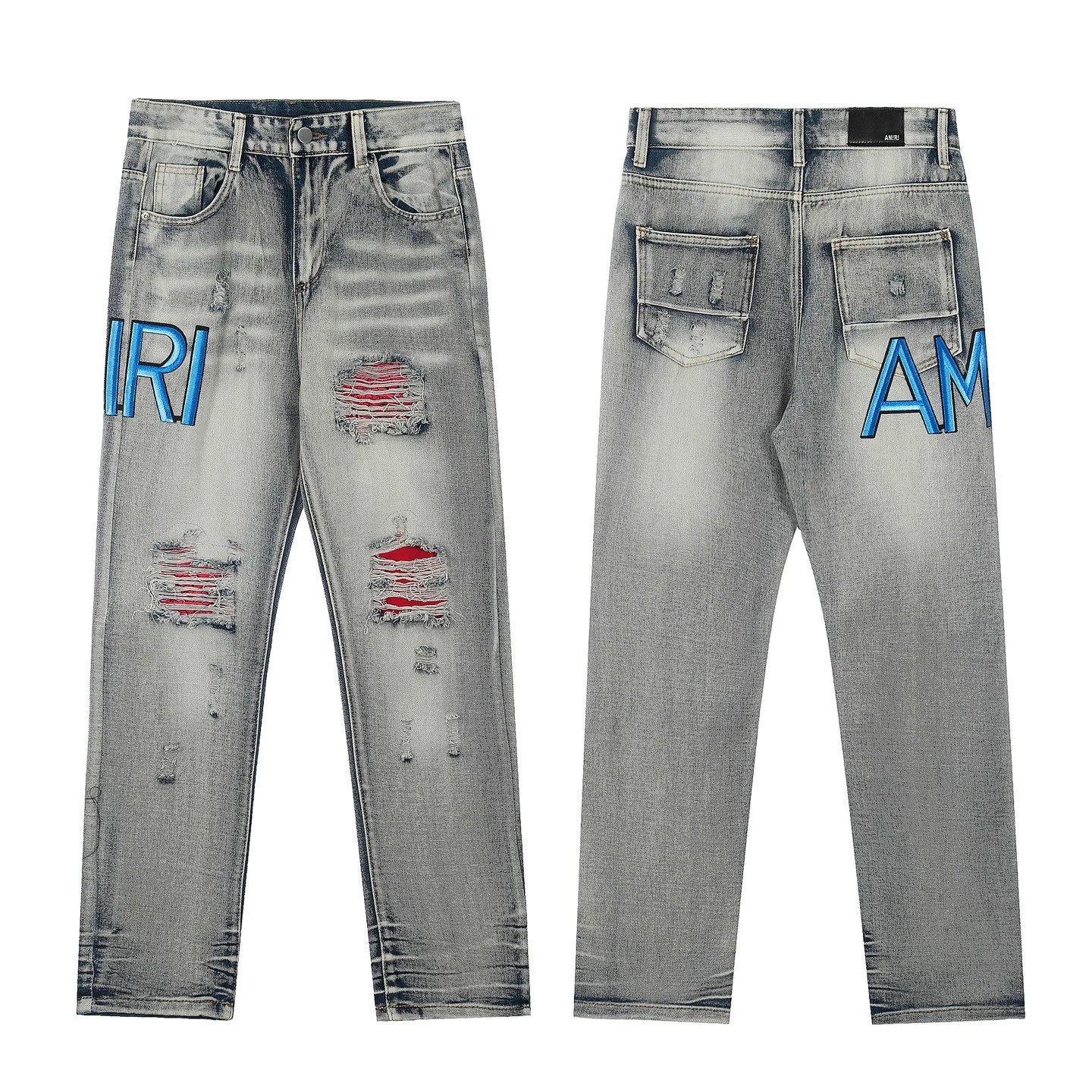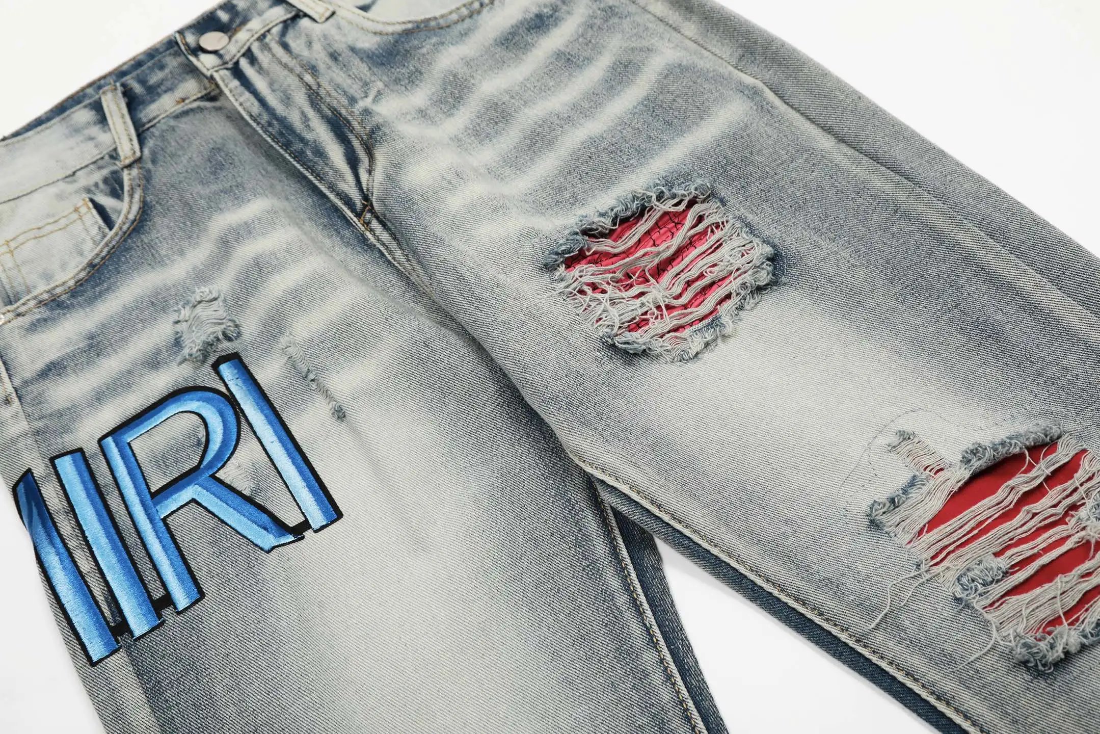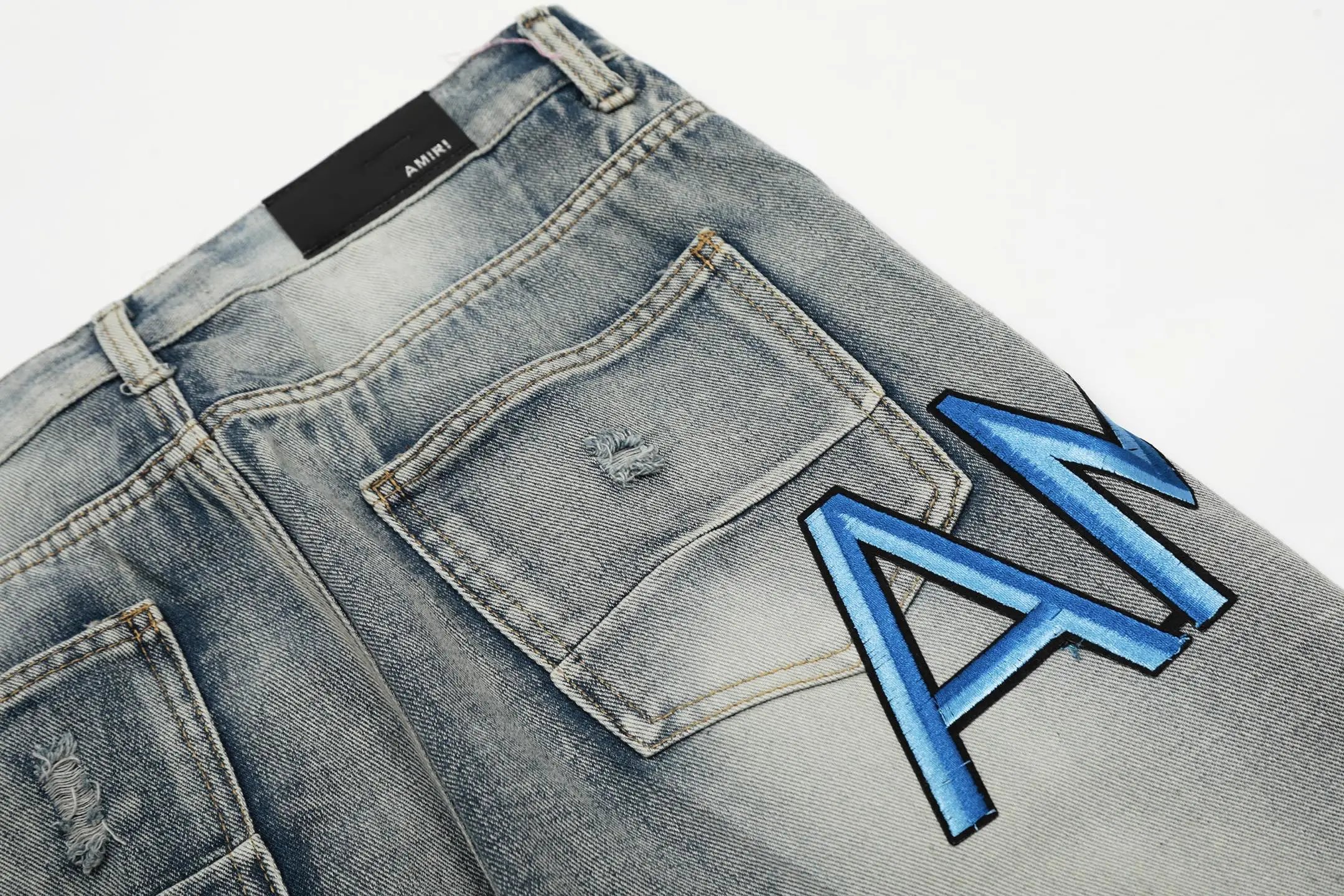 AMIRI #M28 P99 Ripped Jeans: embroidered letters, leather patches, slim tapered fit.