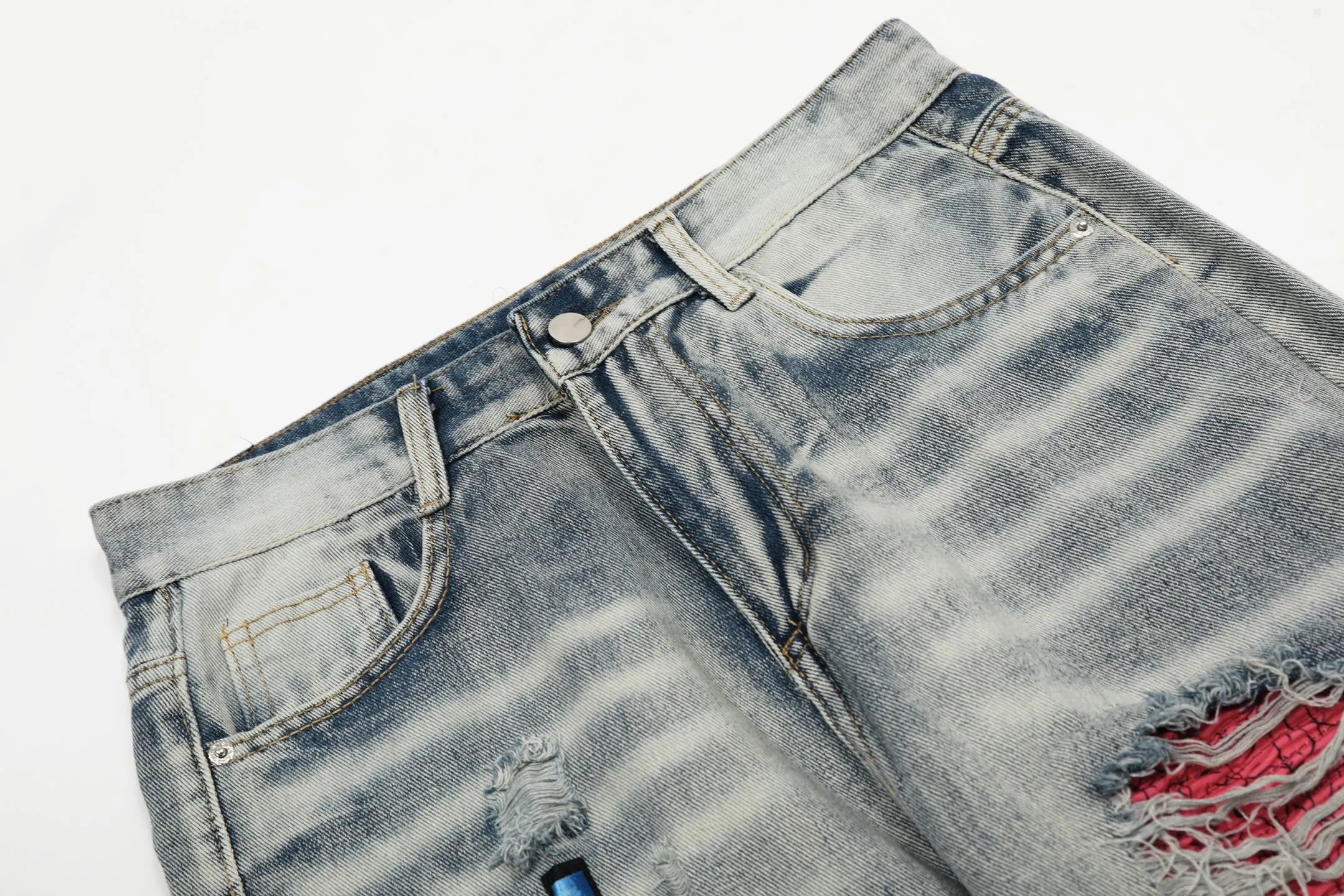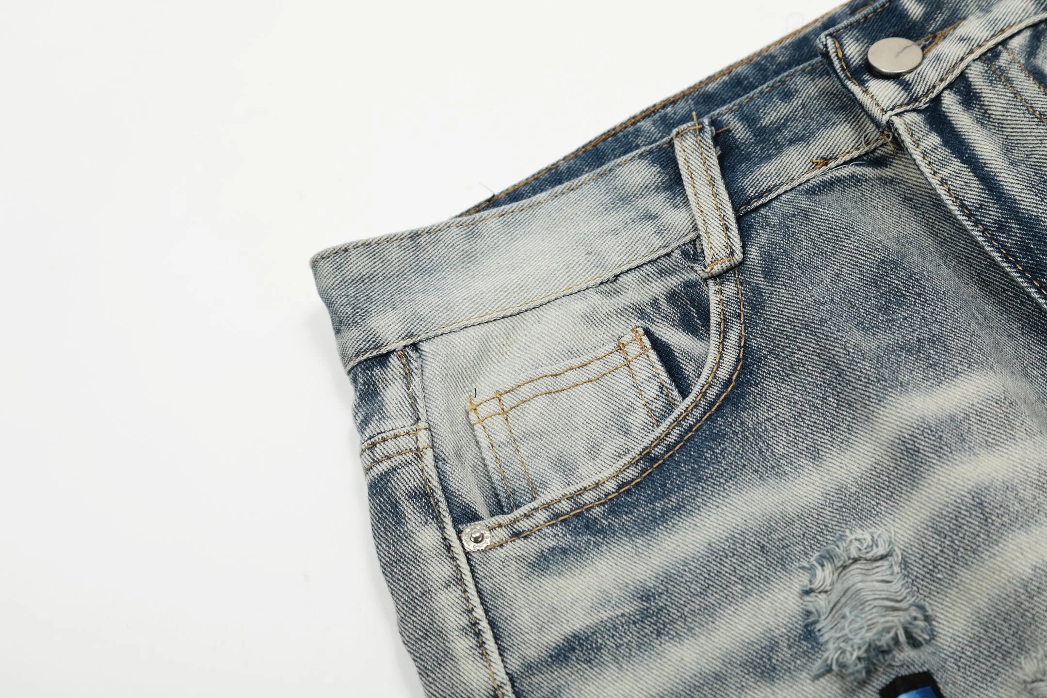 Handmade distressed details (monkey cuts) beat mass-produced fit/rip shape.