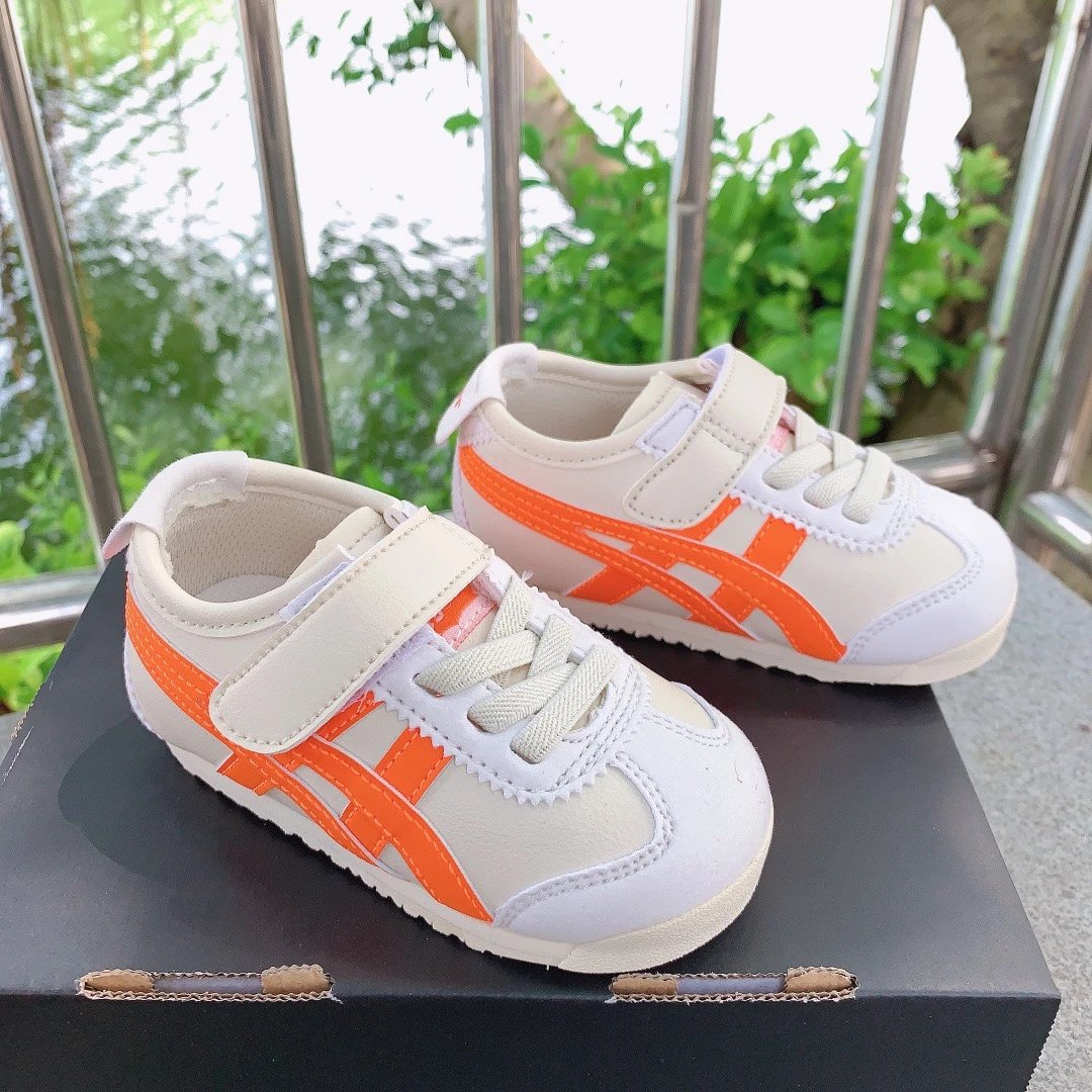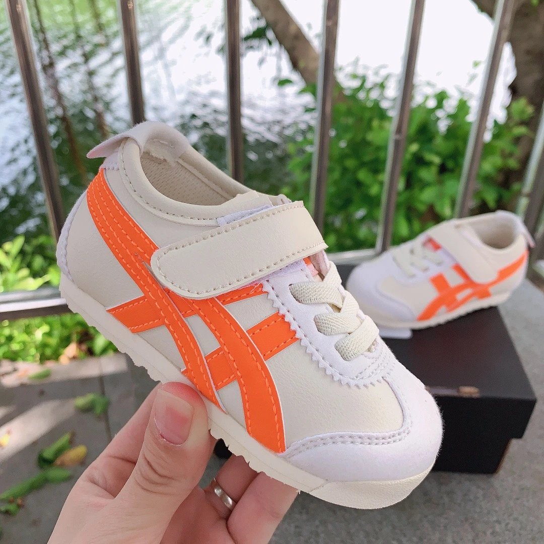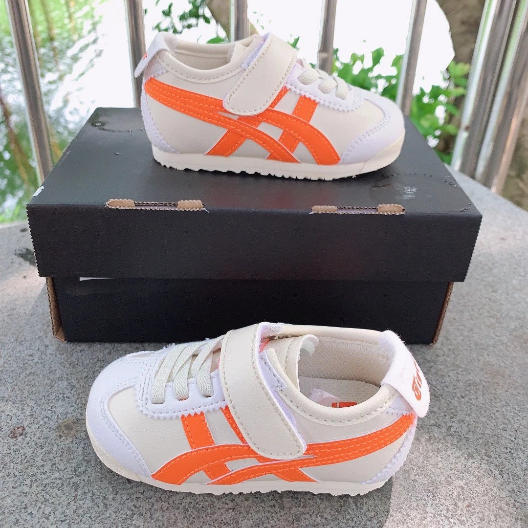 ASICS Onitsuka Tiger Velcro Kids Shoes feature breathable fabric and soft design for little ones.