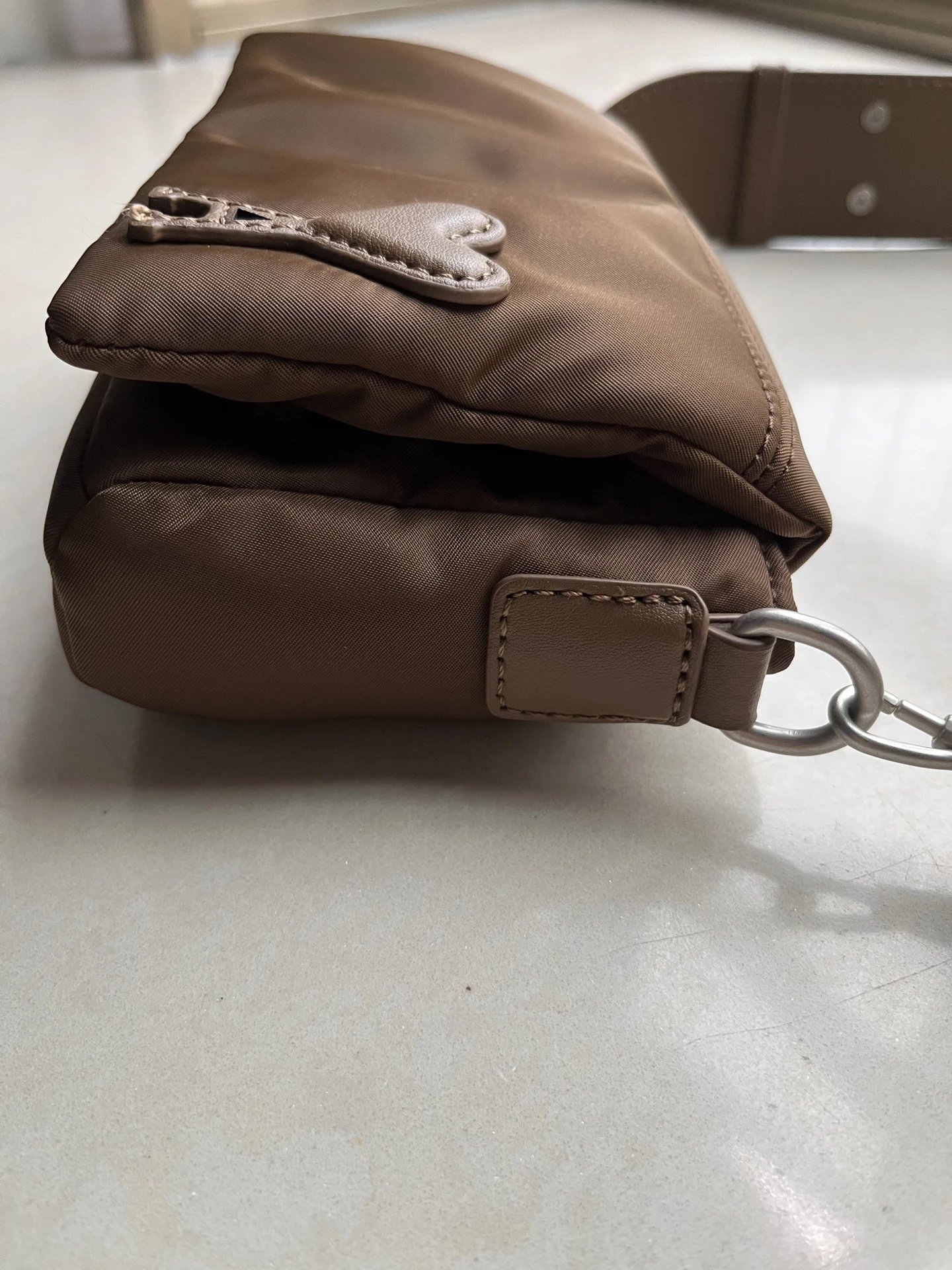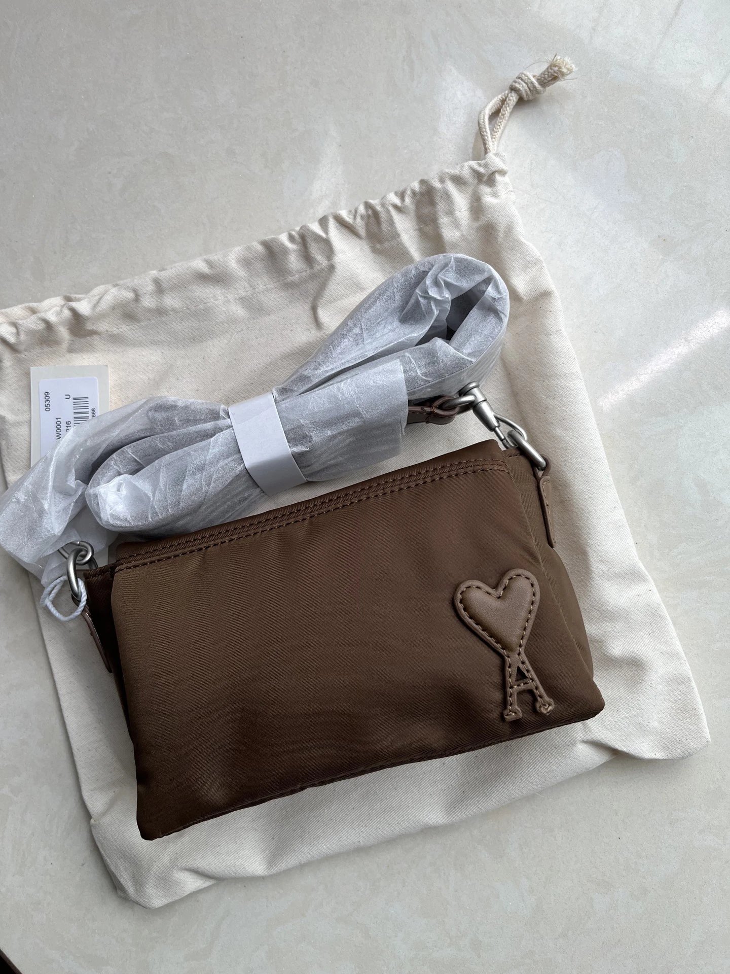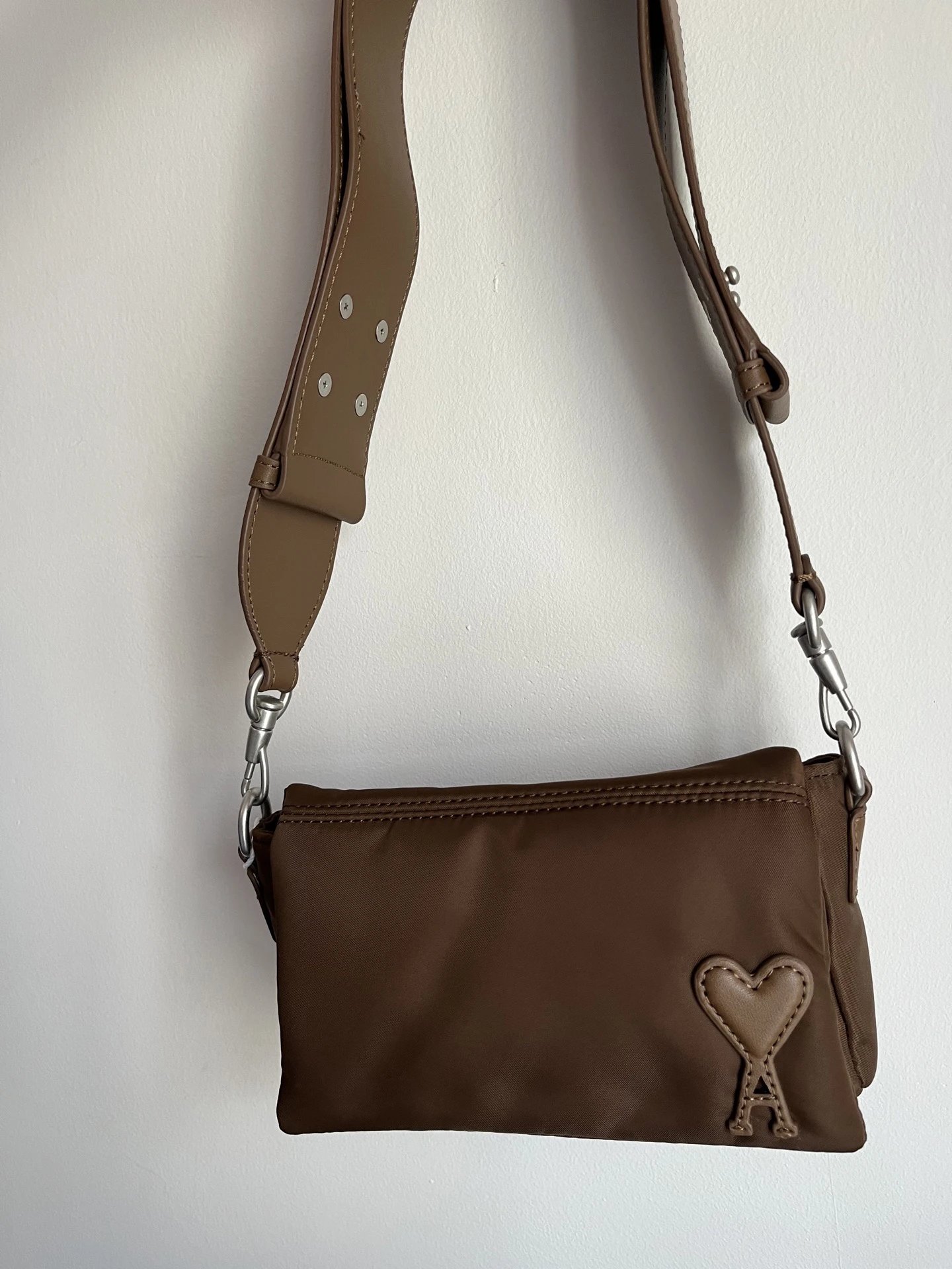 AMI MARCEL Flap Shoulder Bag is a stylish underarm mini square bag with leather patch heart and adjustable strap.