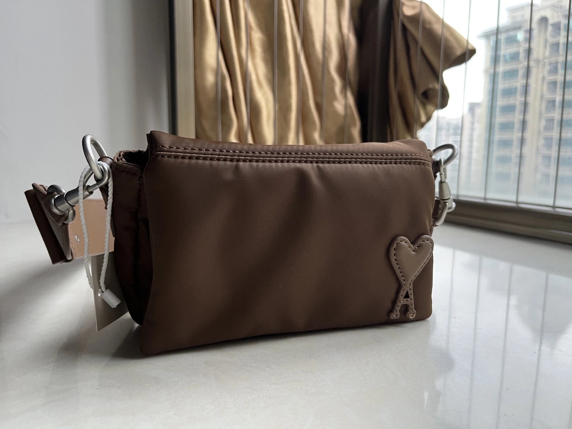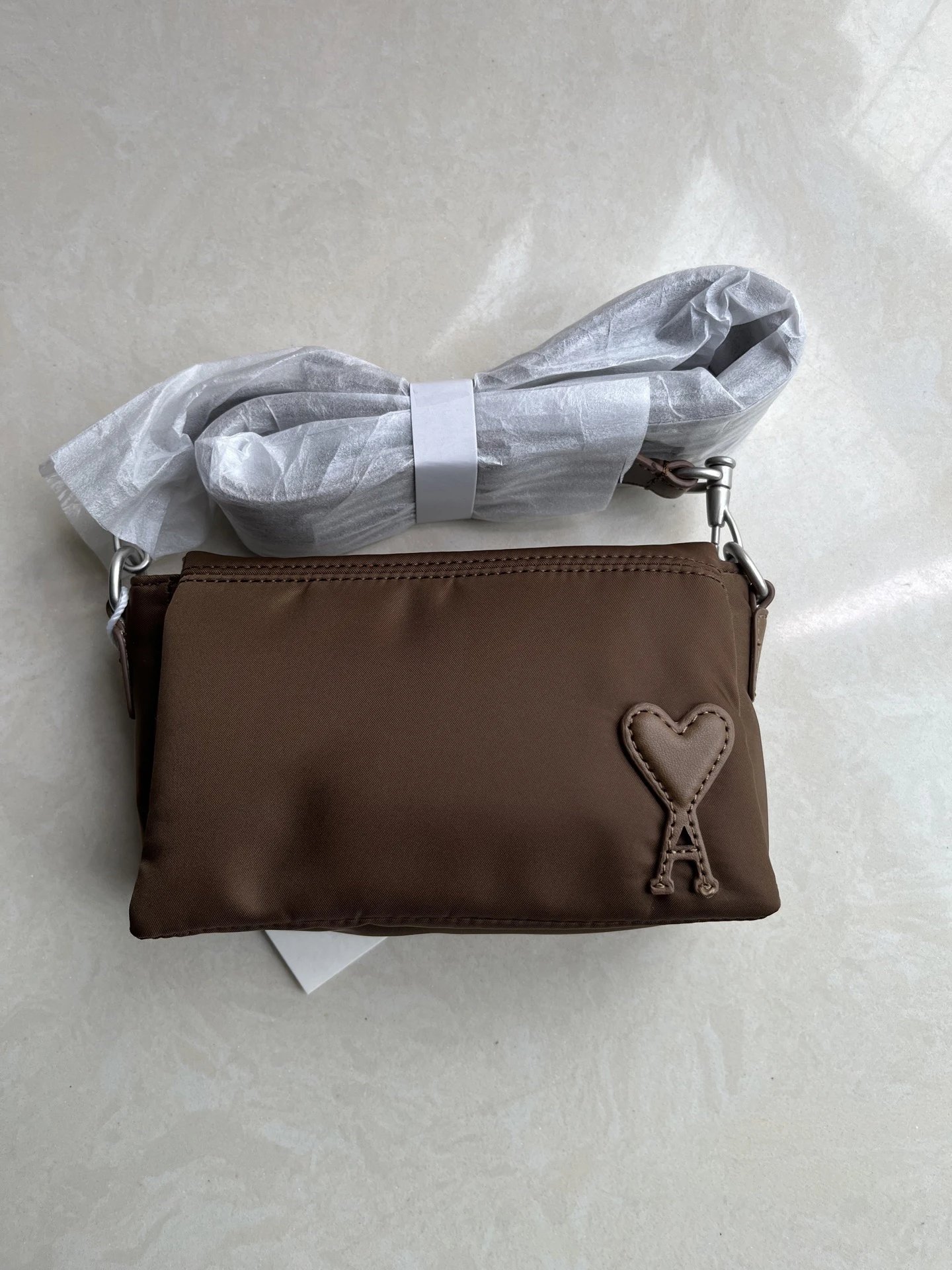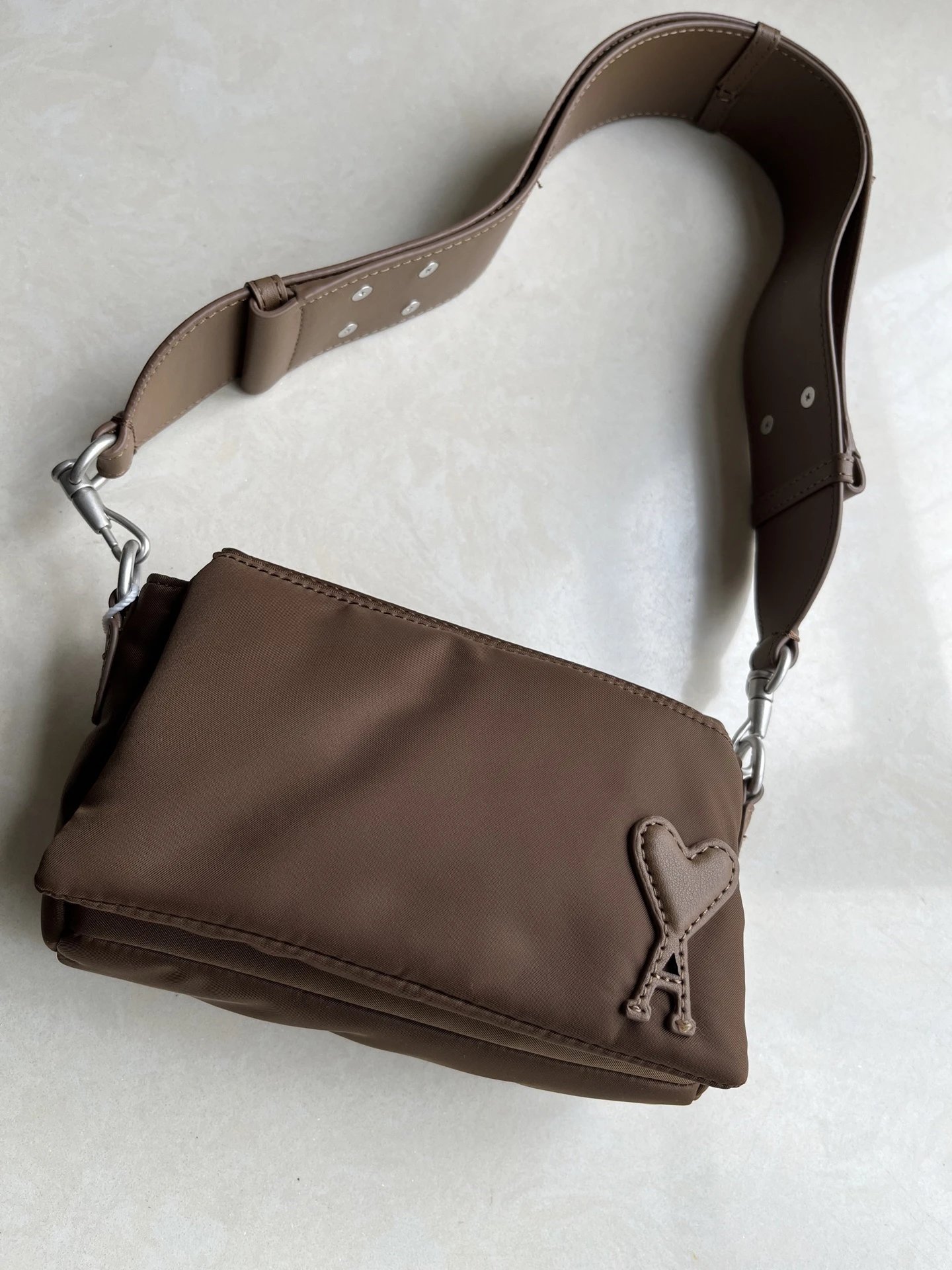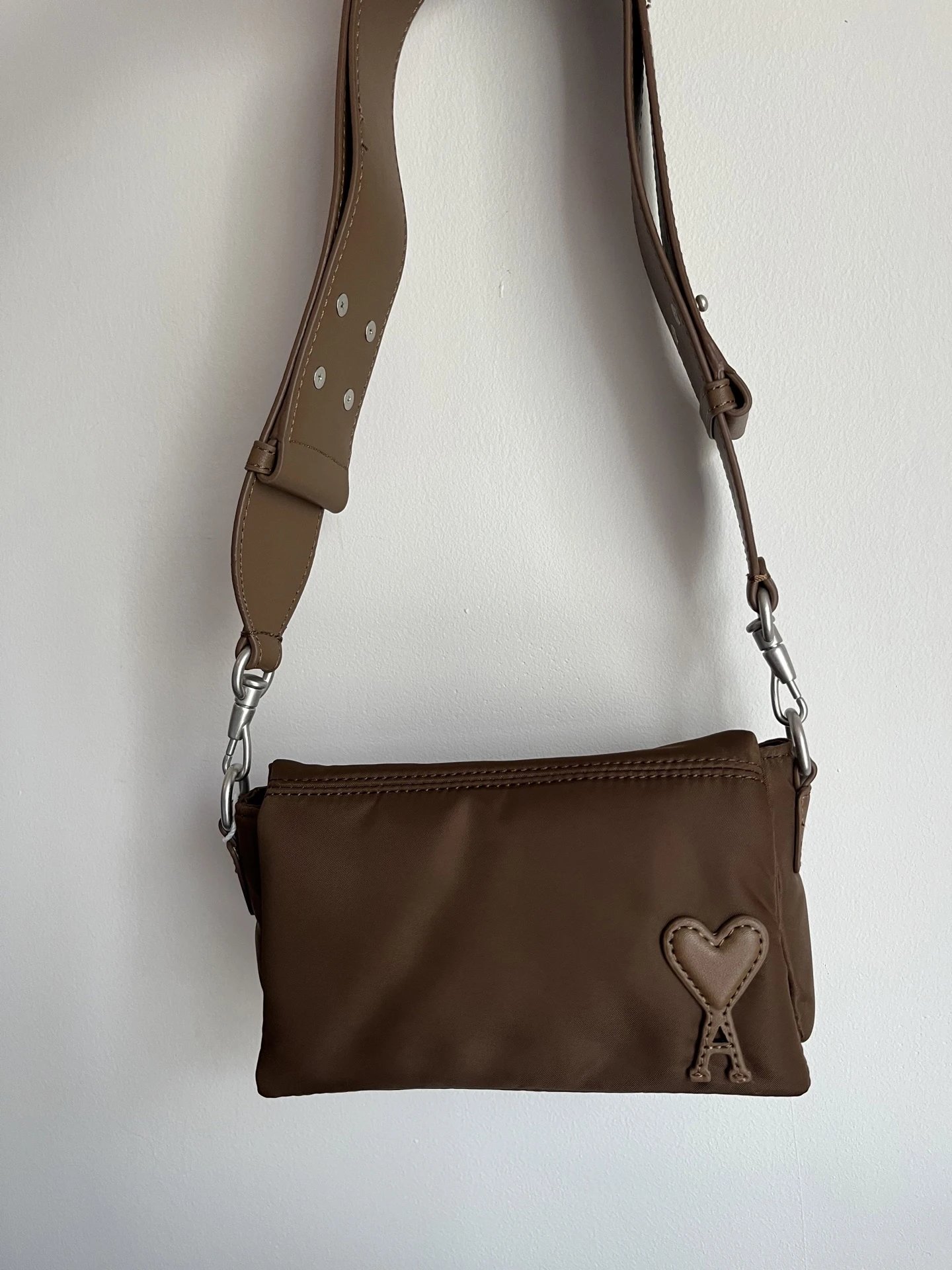 AMI MARCEL Flap Crossbody Bag is an early autumn new arrival with leather heart patch & adjustable strap.