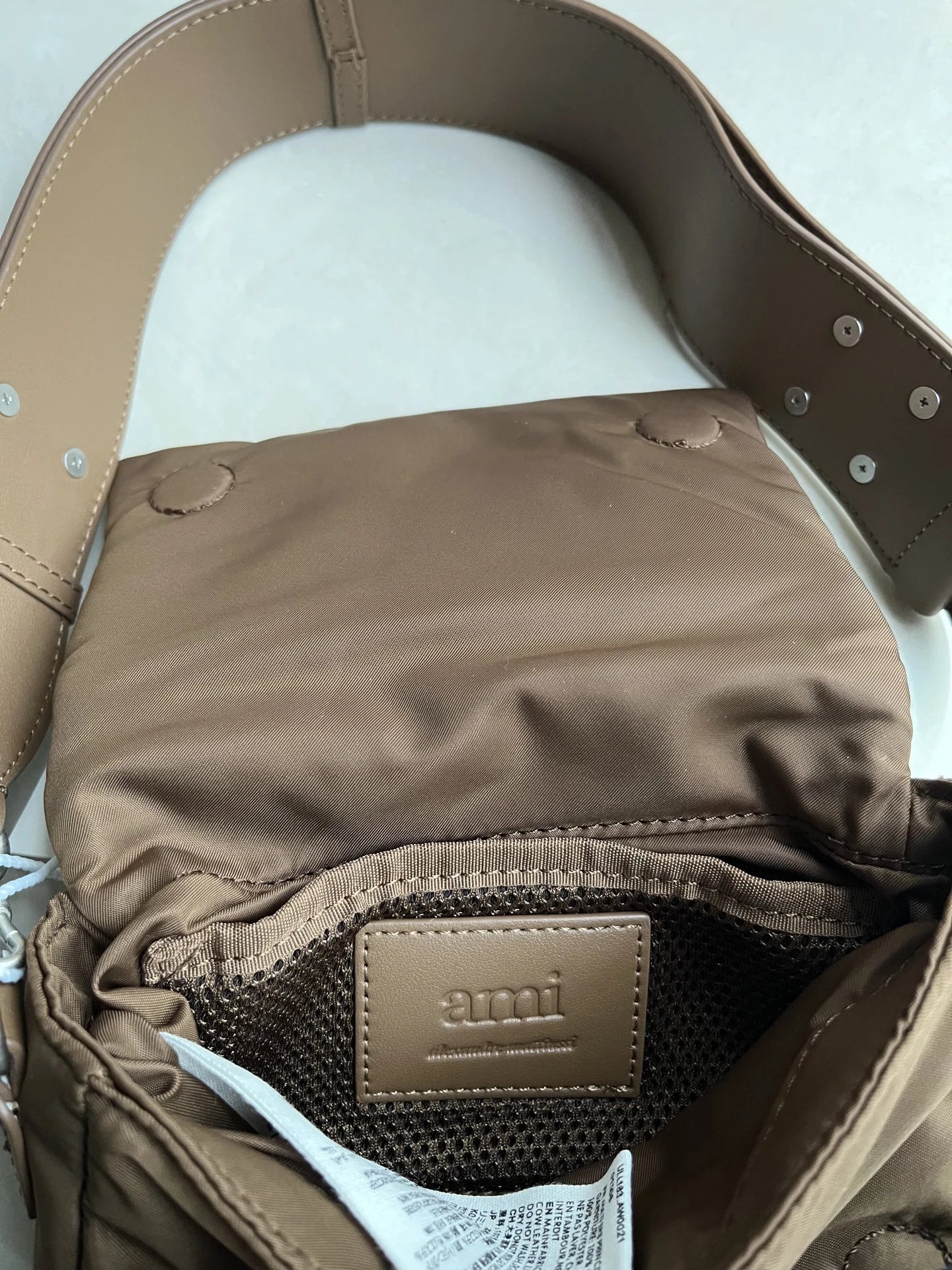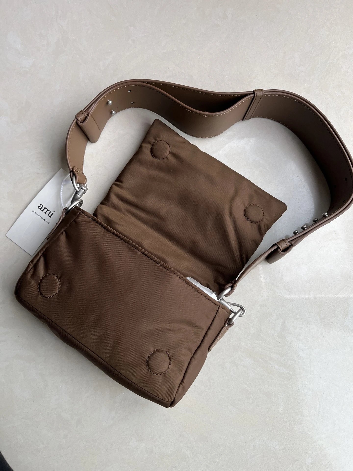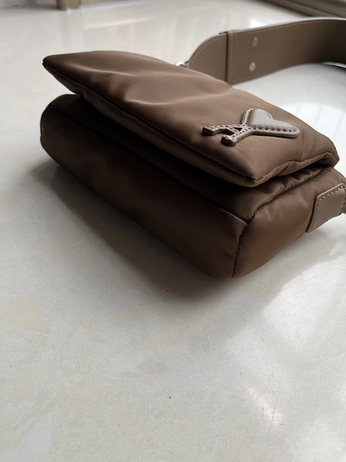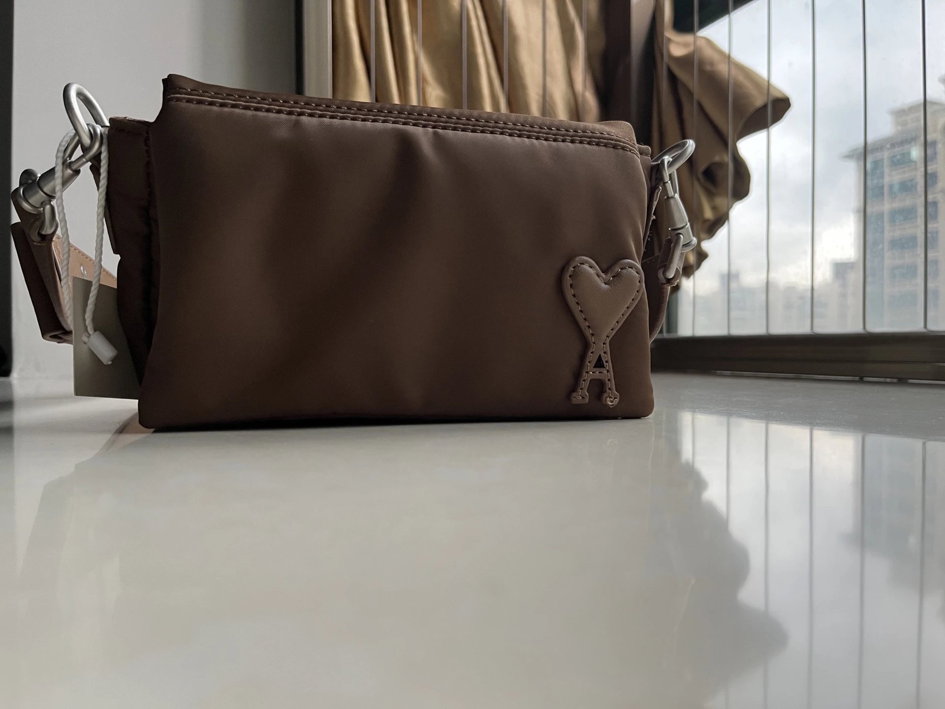 AMI MARCEL Flap Crossbody Bag is an early autumn new item with leather patch, heart design, adjustable strap & small square shape.