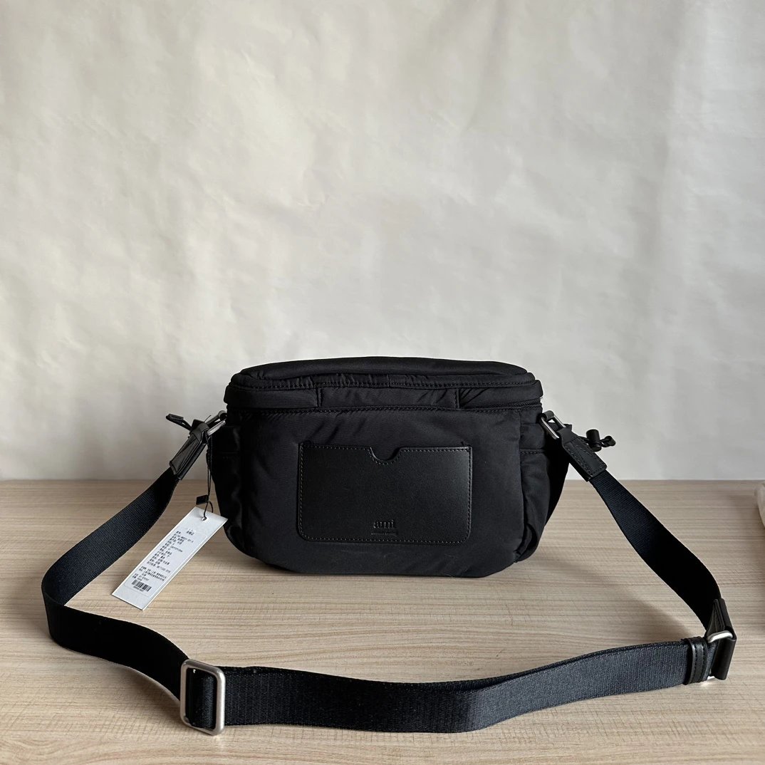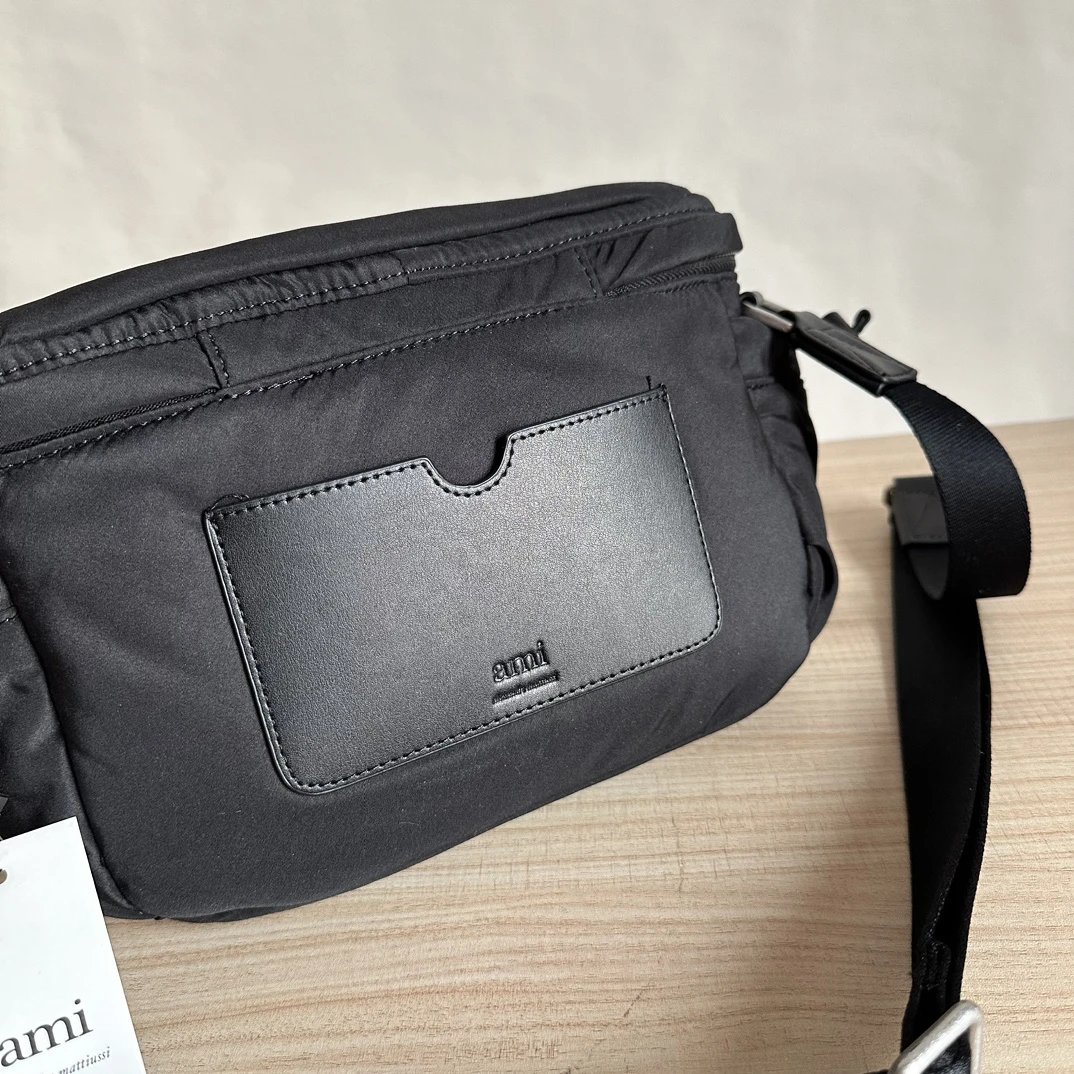 AMI Black Crossbody Messenger Bag is unisex, sleek with silver metal buckles.