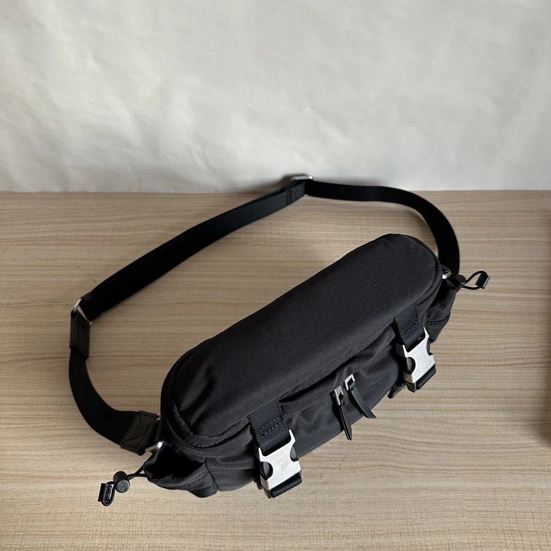 Adjustable strap, imported water-resistant nylon, side cinched pockets for small items.