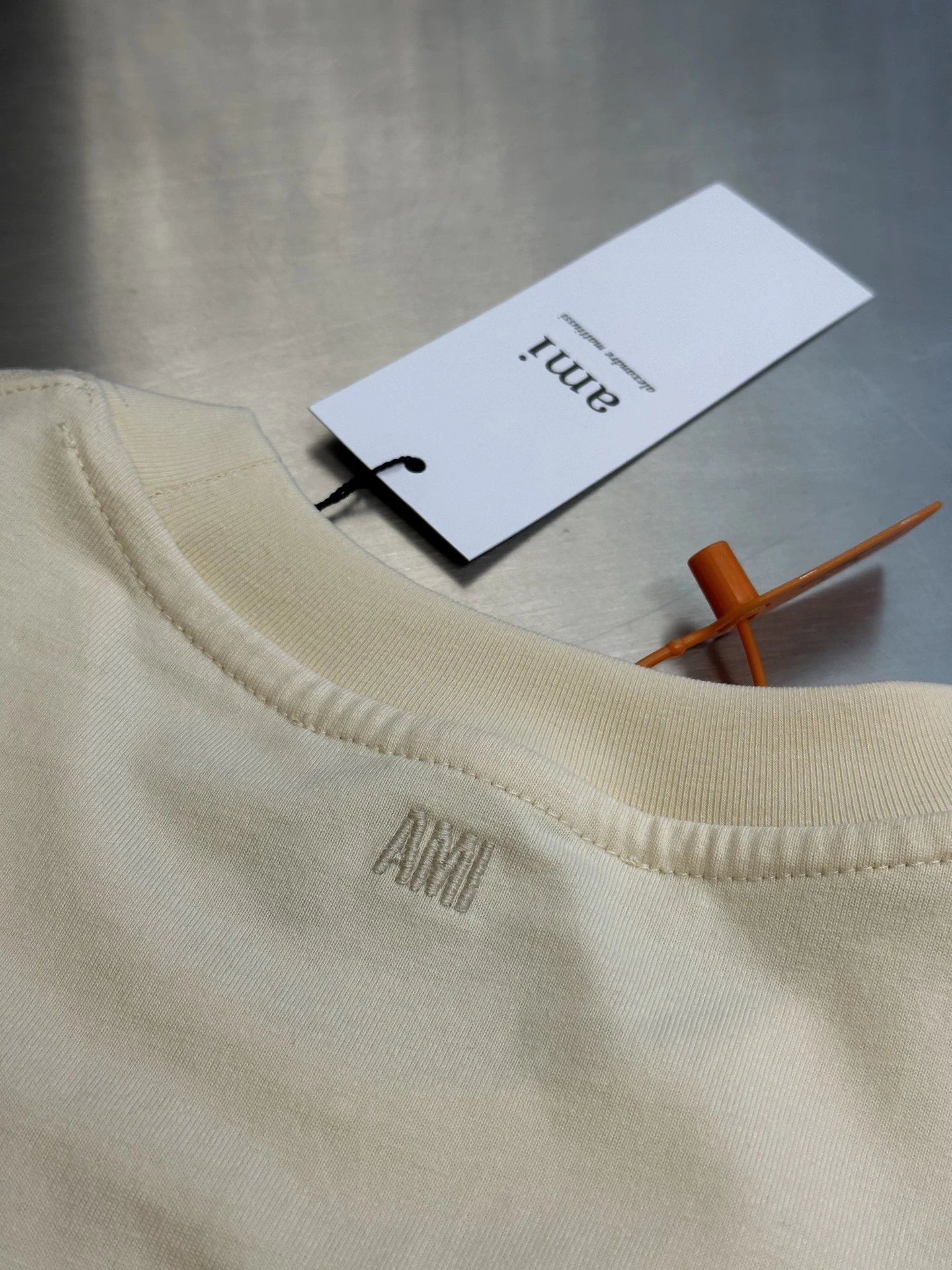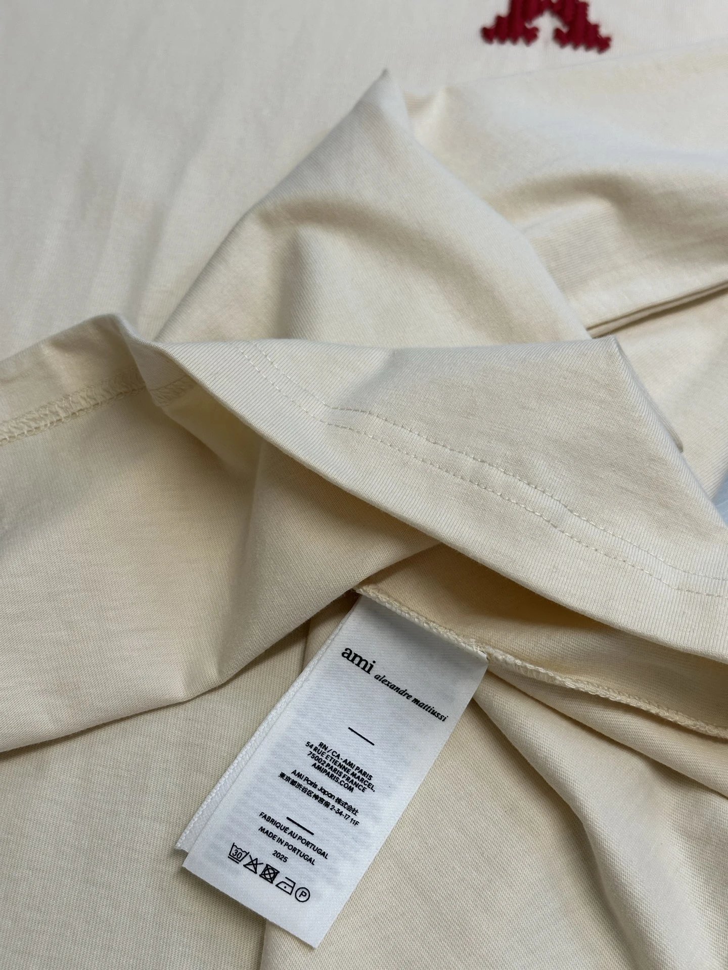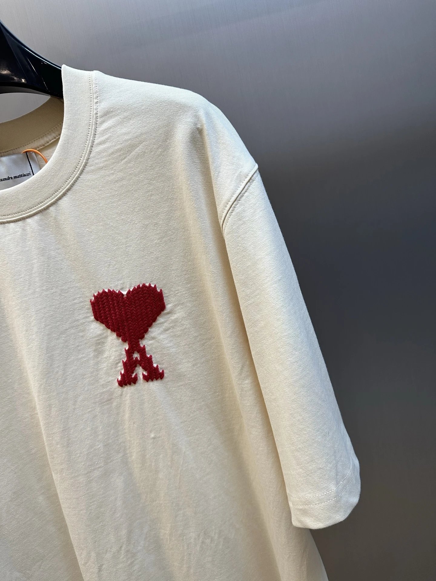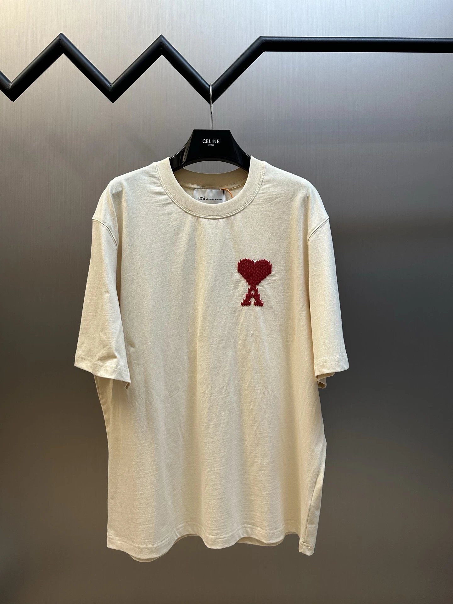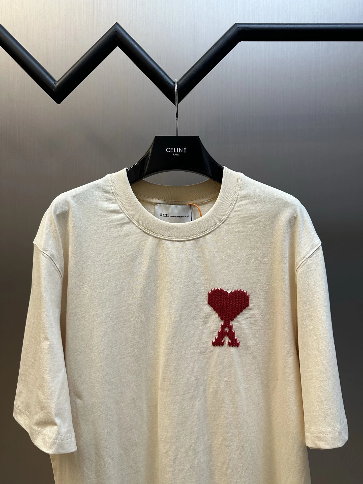 Pixelated heart & AMI letter embroidery on chest/back boost brand recognition & French charm.