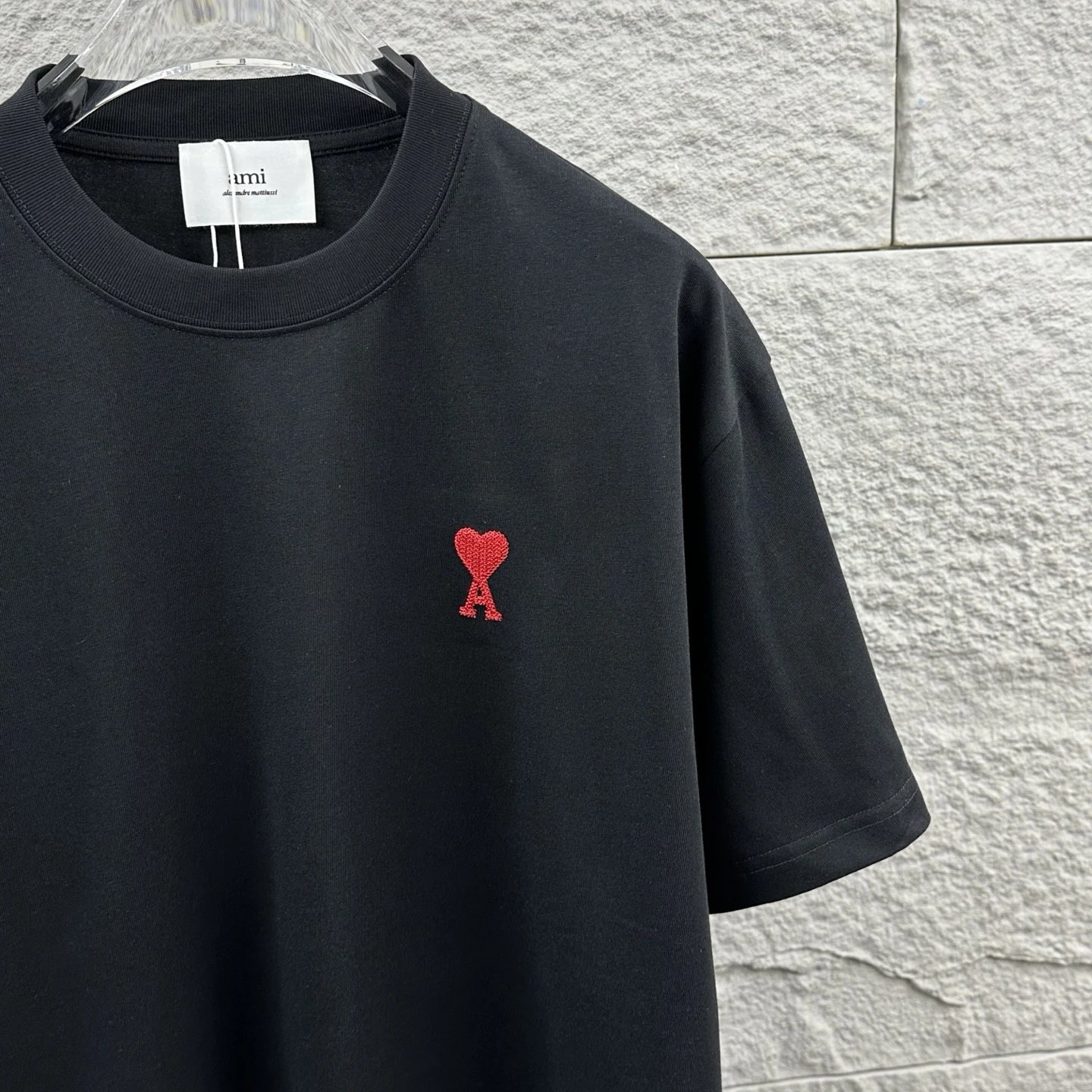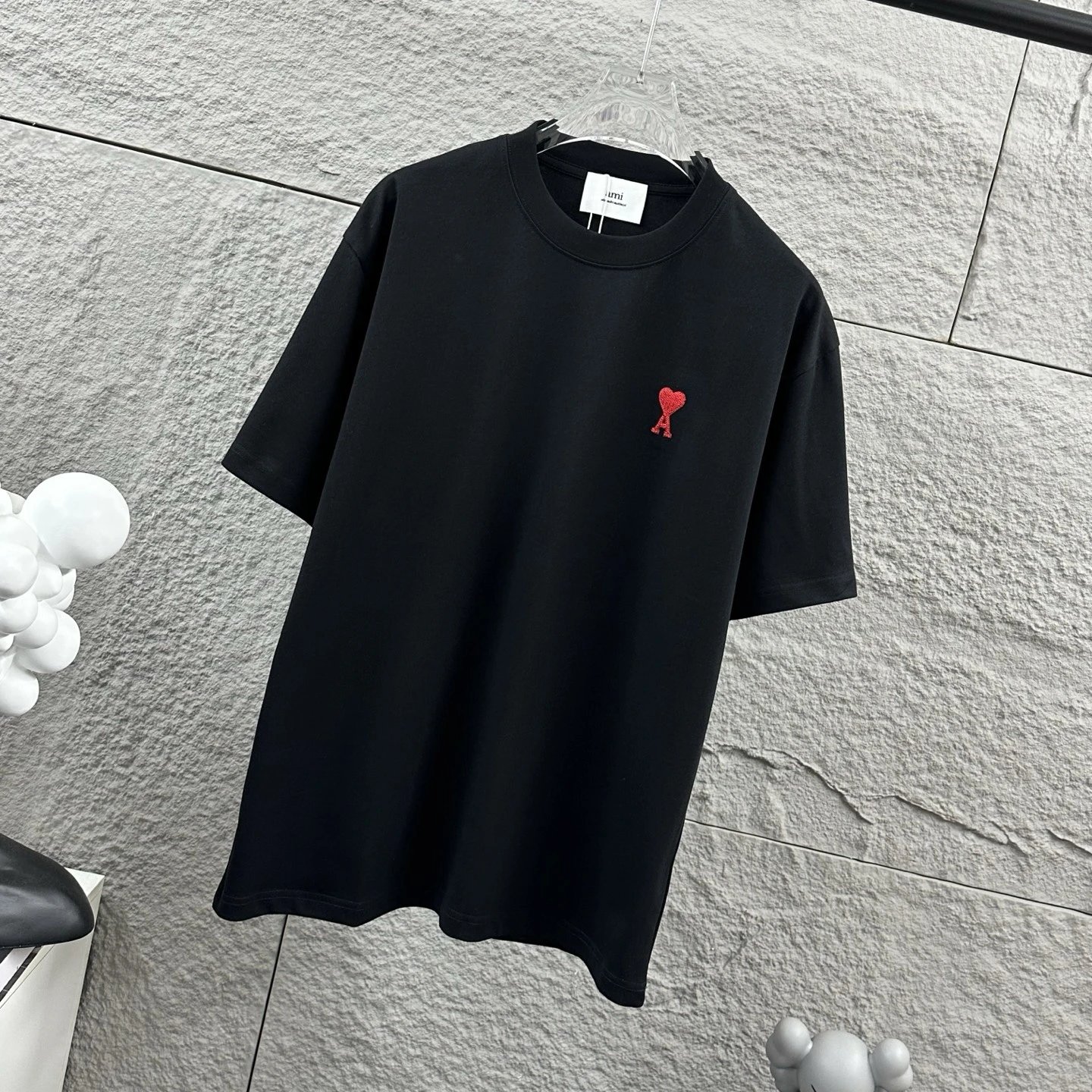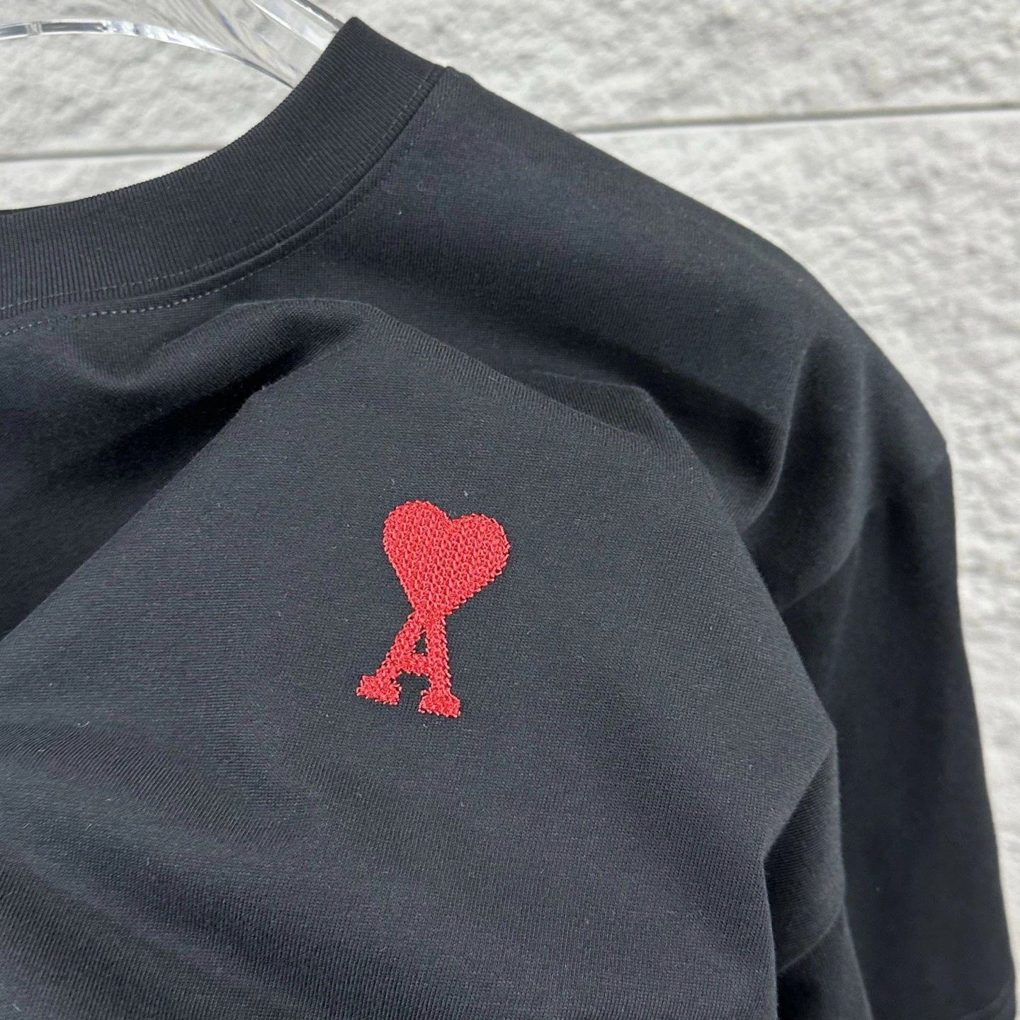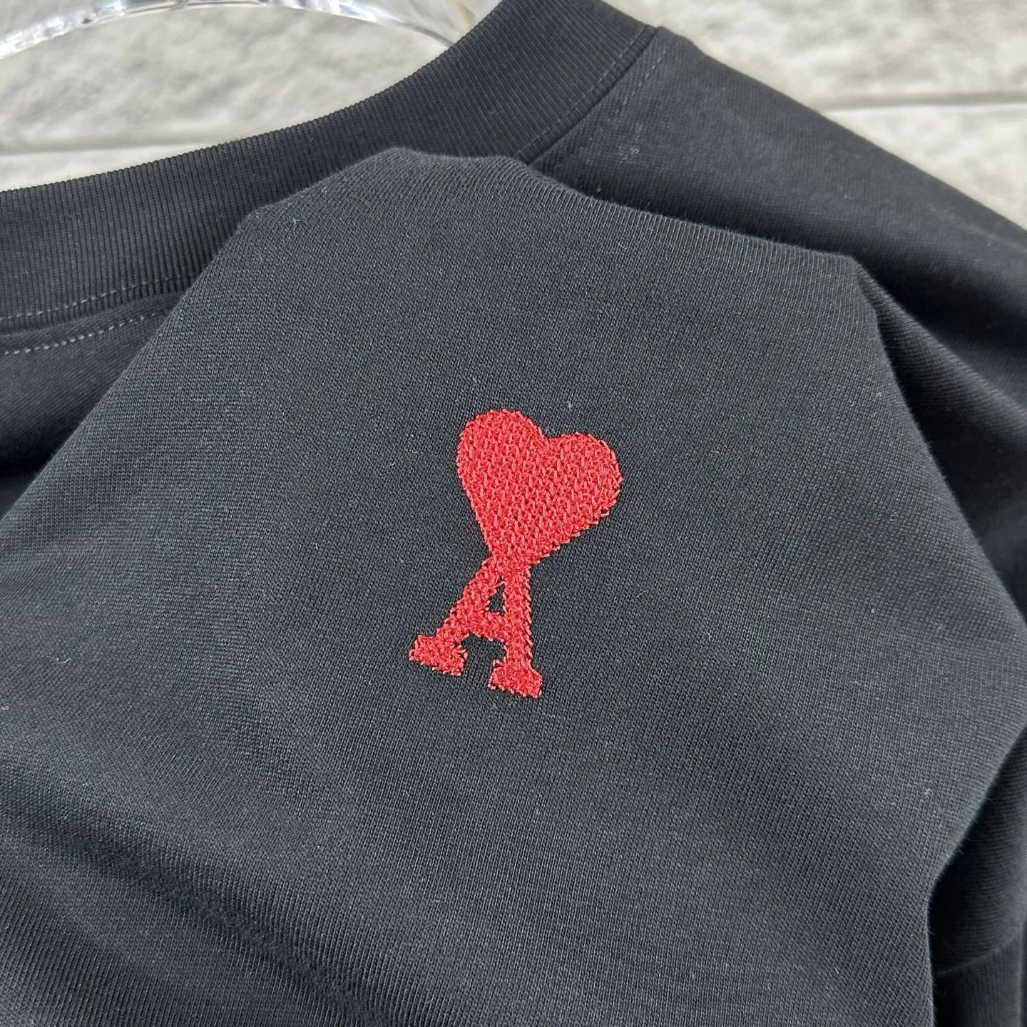 AMI 2026 Spring Summer unisex cotton t-shirt has small heart embroidery, classic minimalist design, custom double yarn combed cotton fabric.