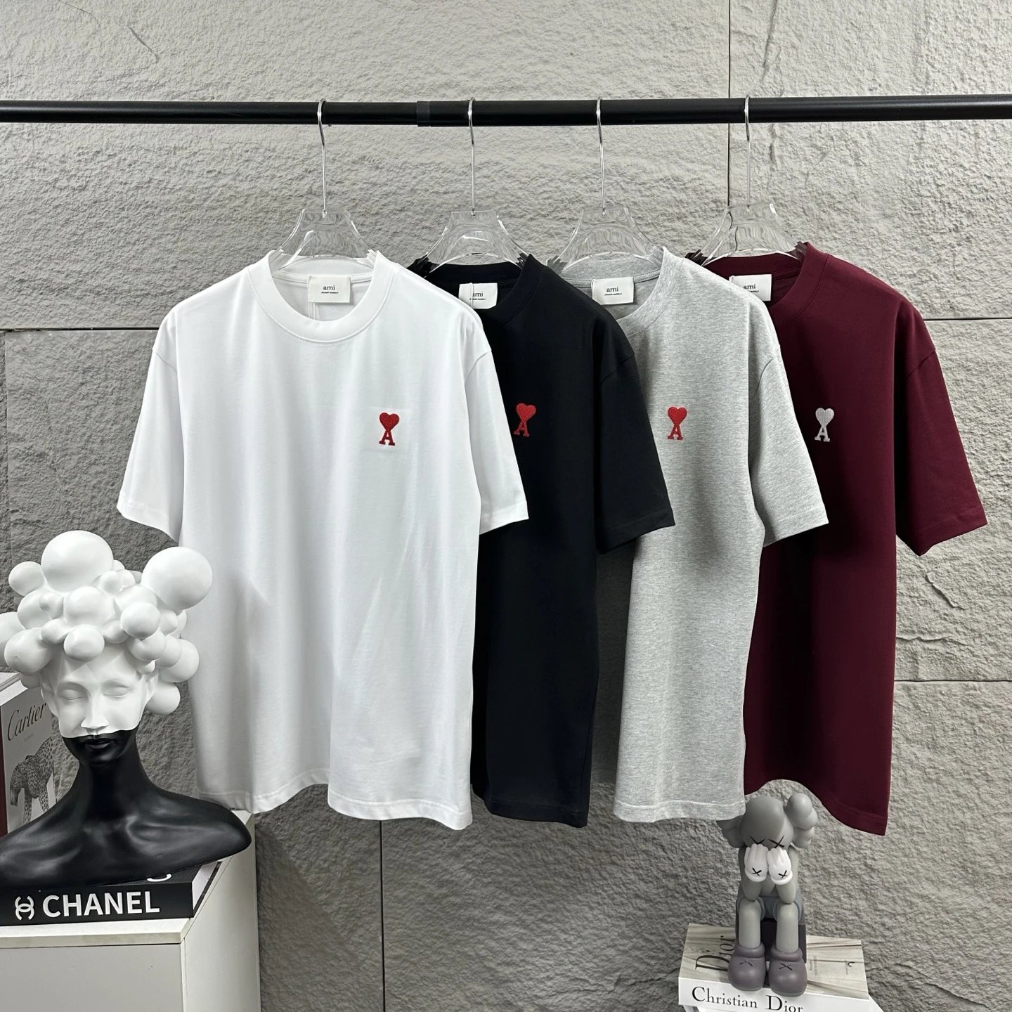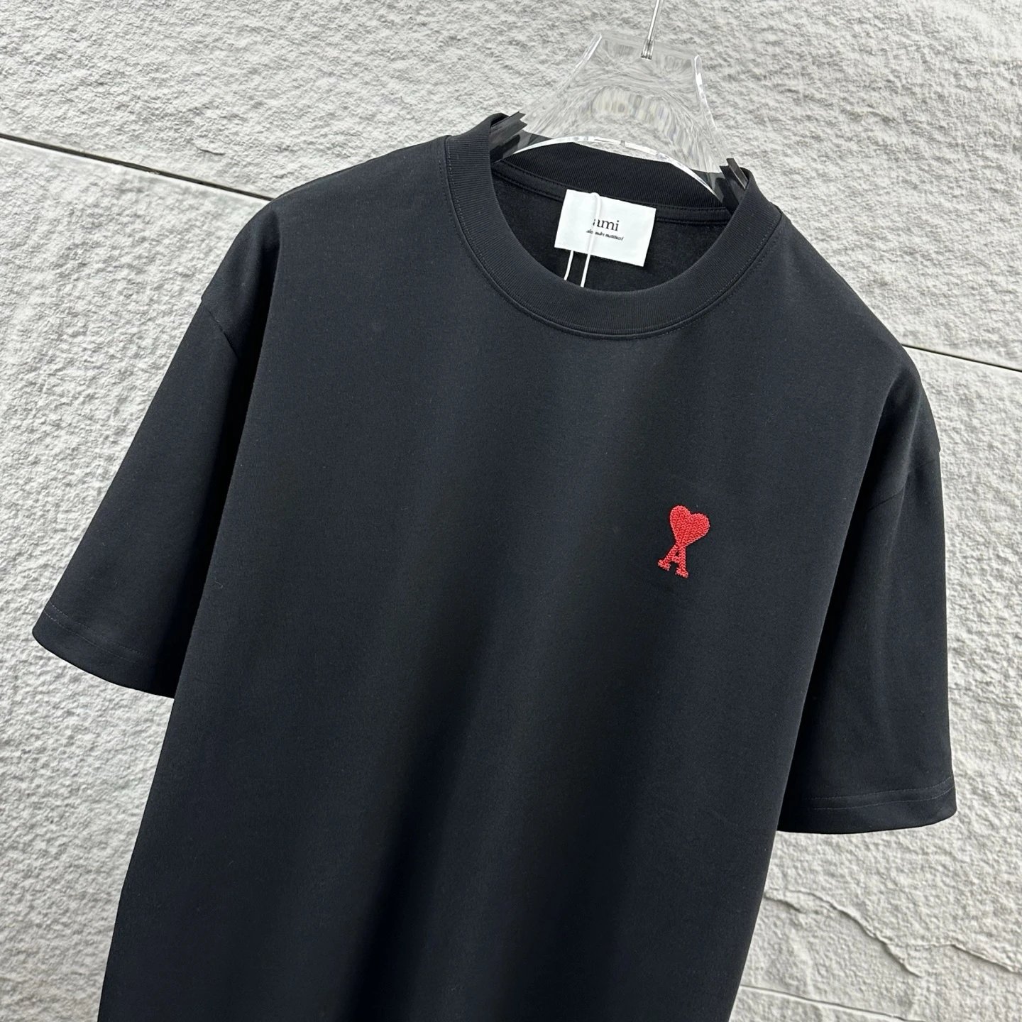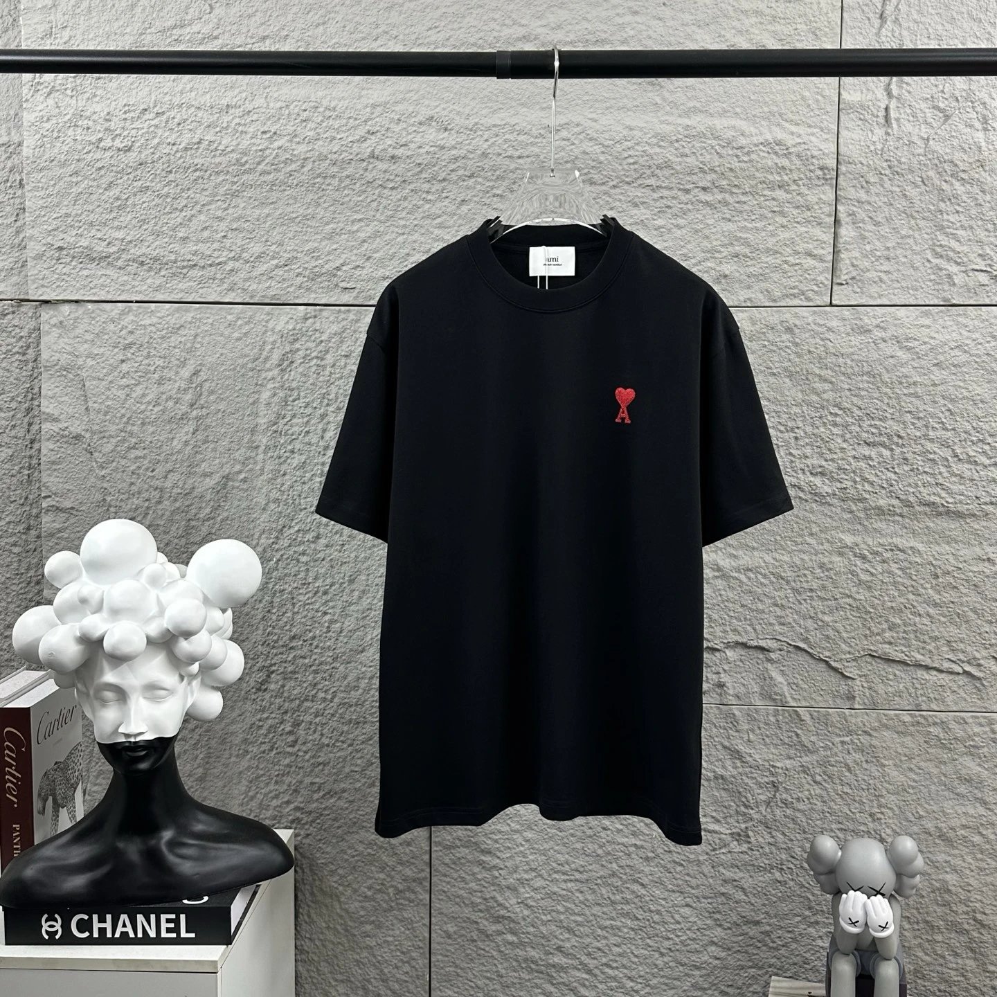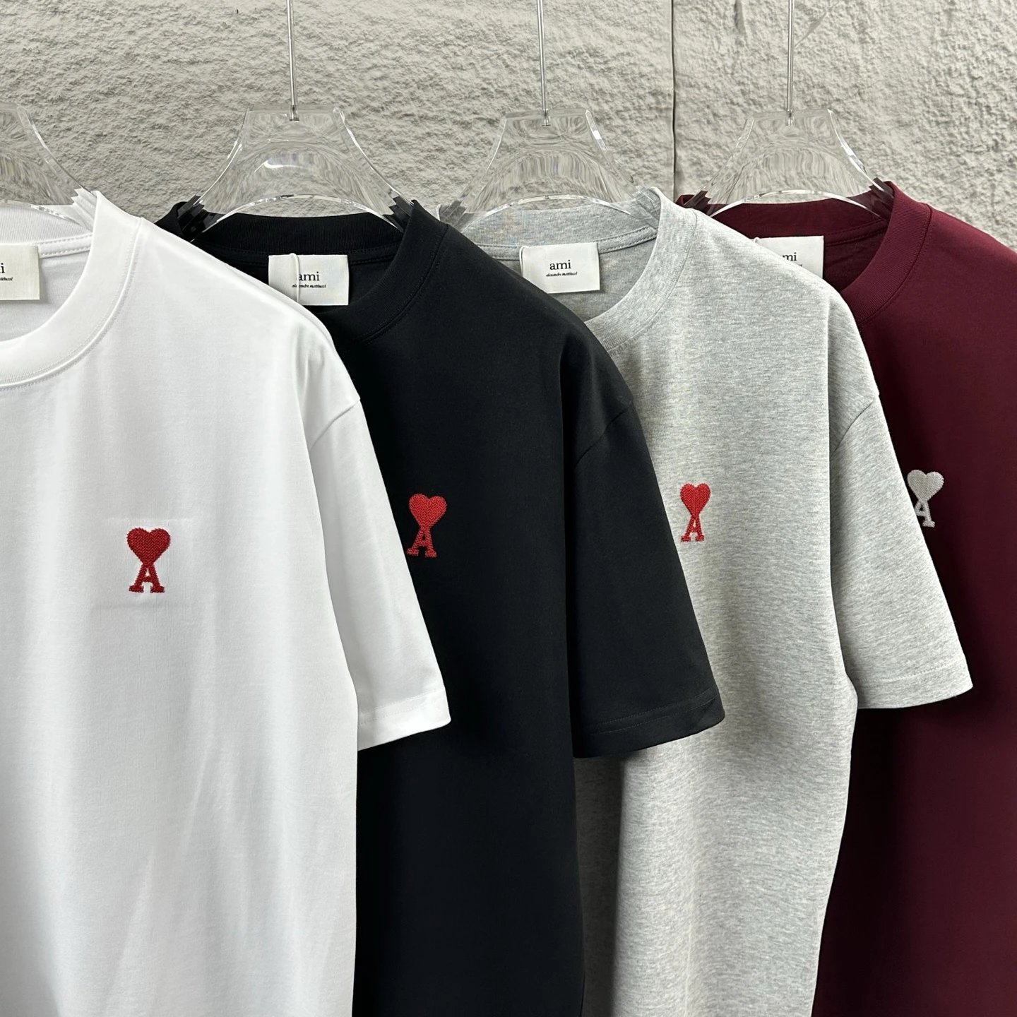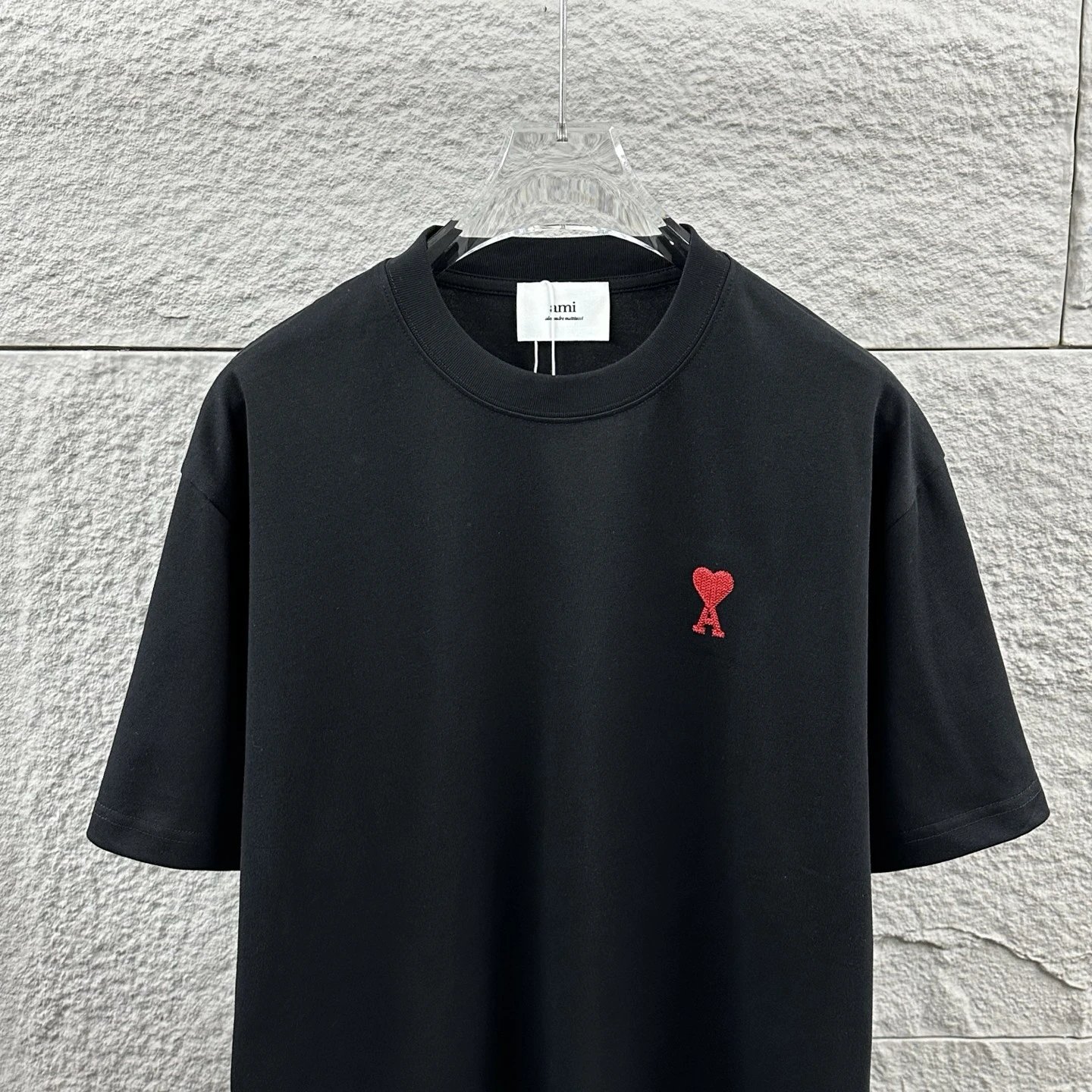 AMI 2026 Spring Summer unisex cotton t-shirt has small heart embroidery, classic minimalist design, custom double yarn combed cotton fabric.