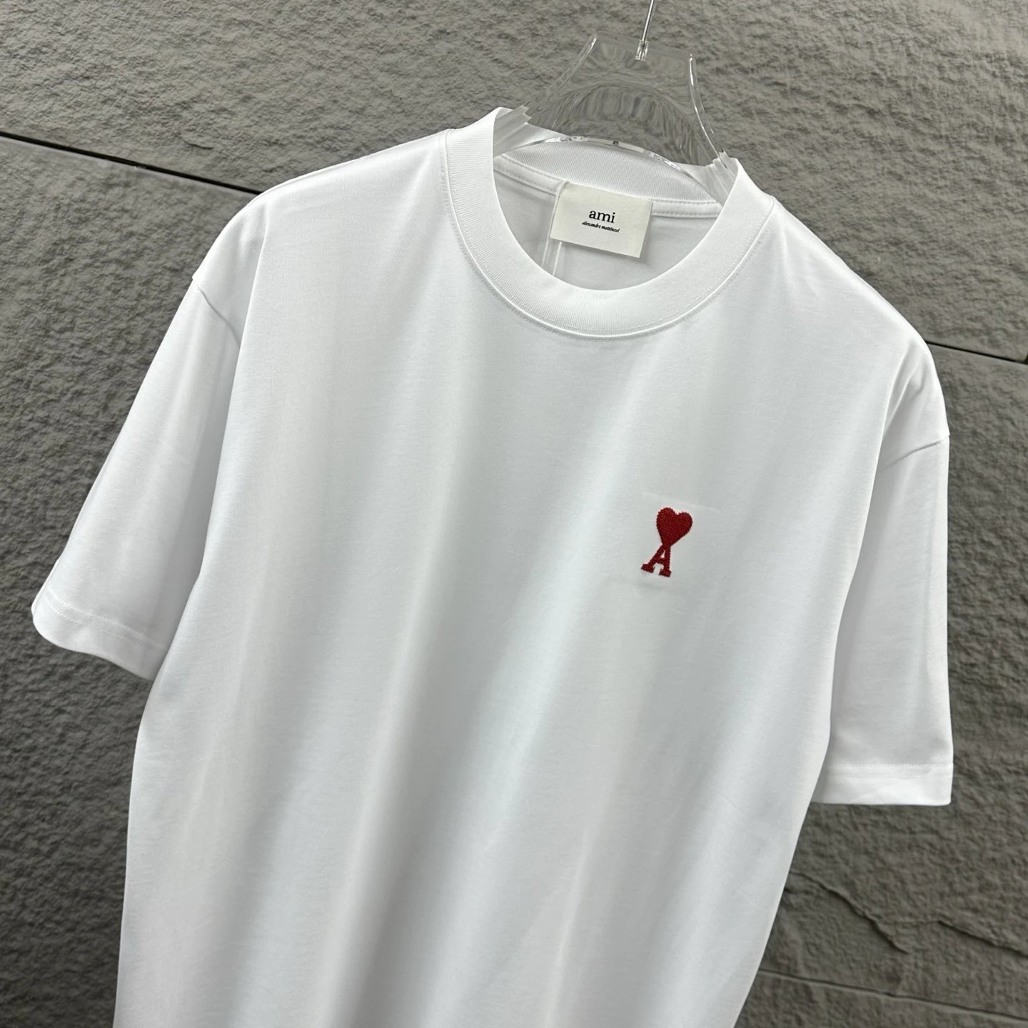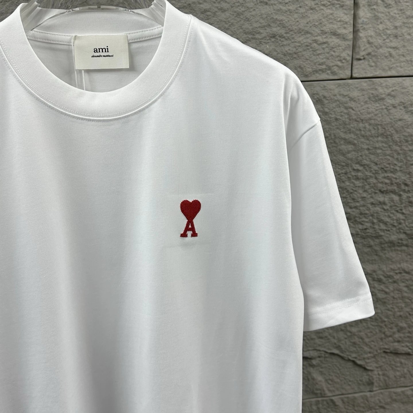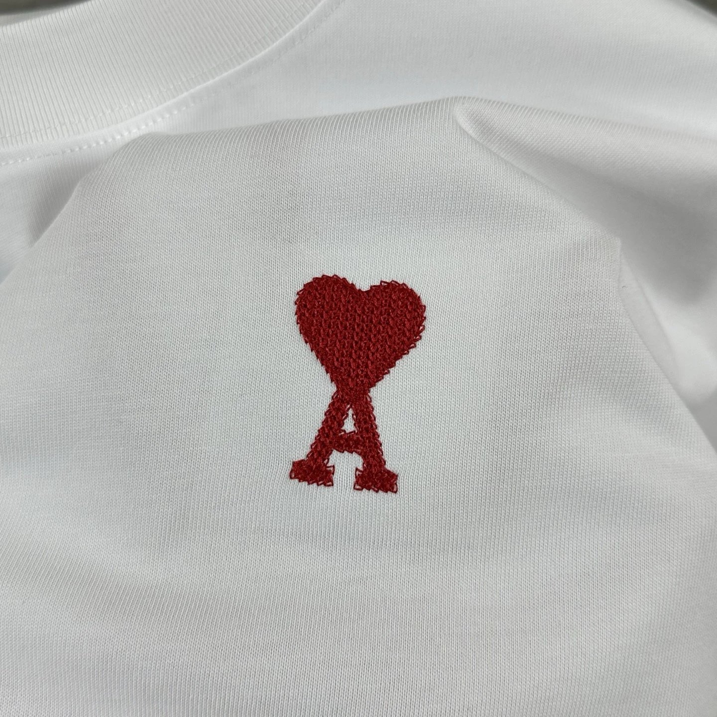 AMI 2026 Spring Summer Love Embroidery Unisex T-Shirt features classic minimalist design, 3D small heart logo embroidery, and custom double yarn combed cotton fabric.