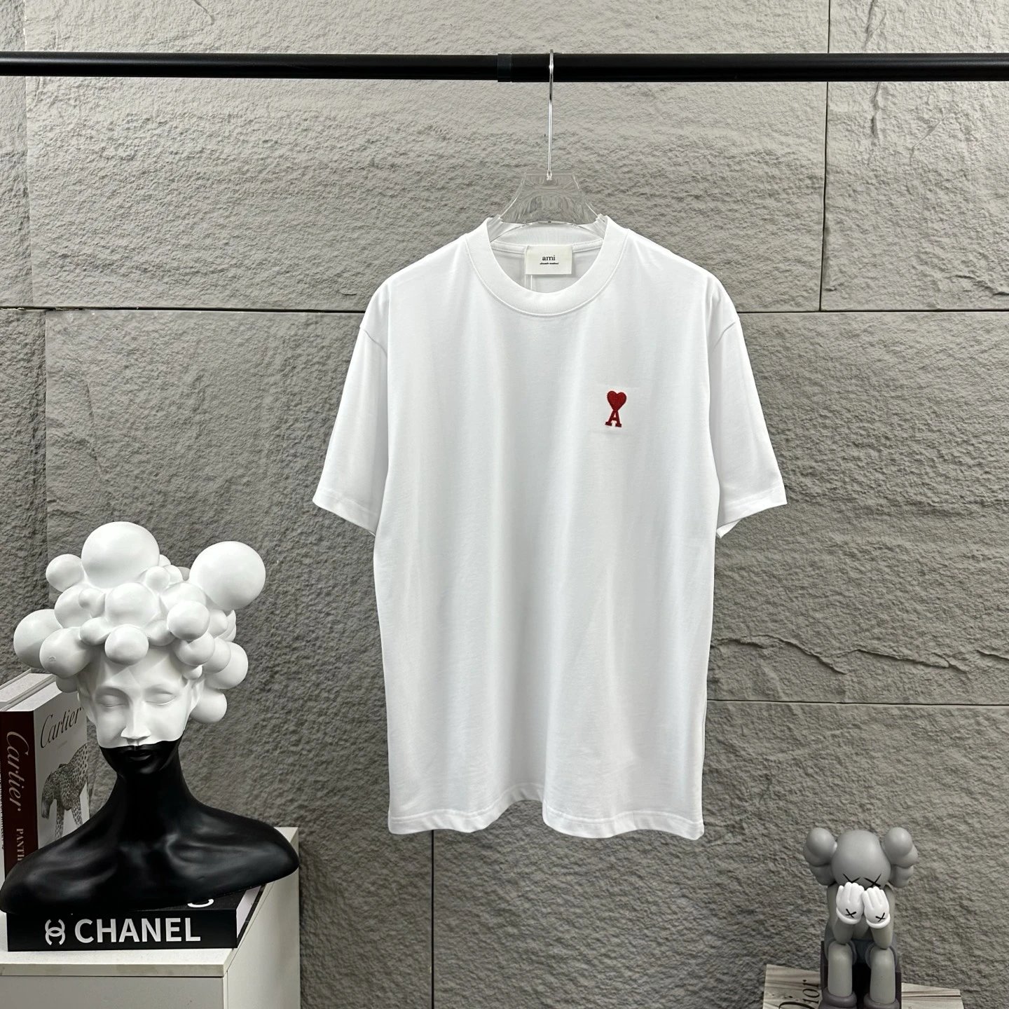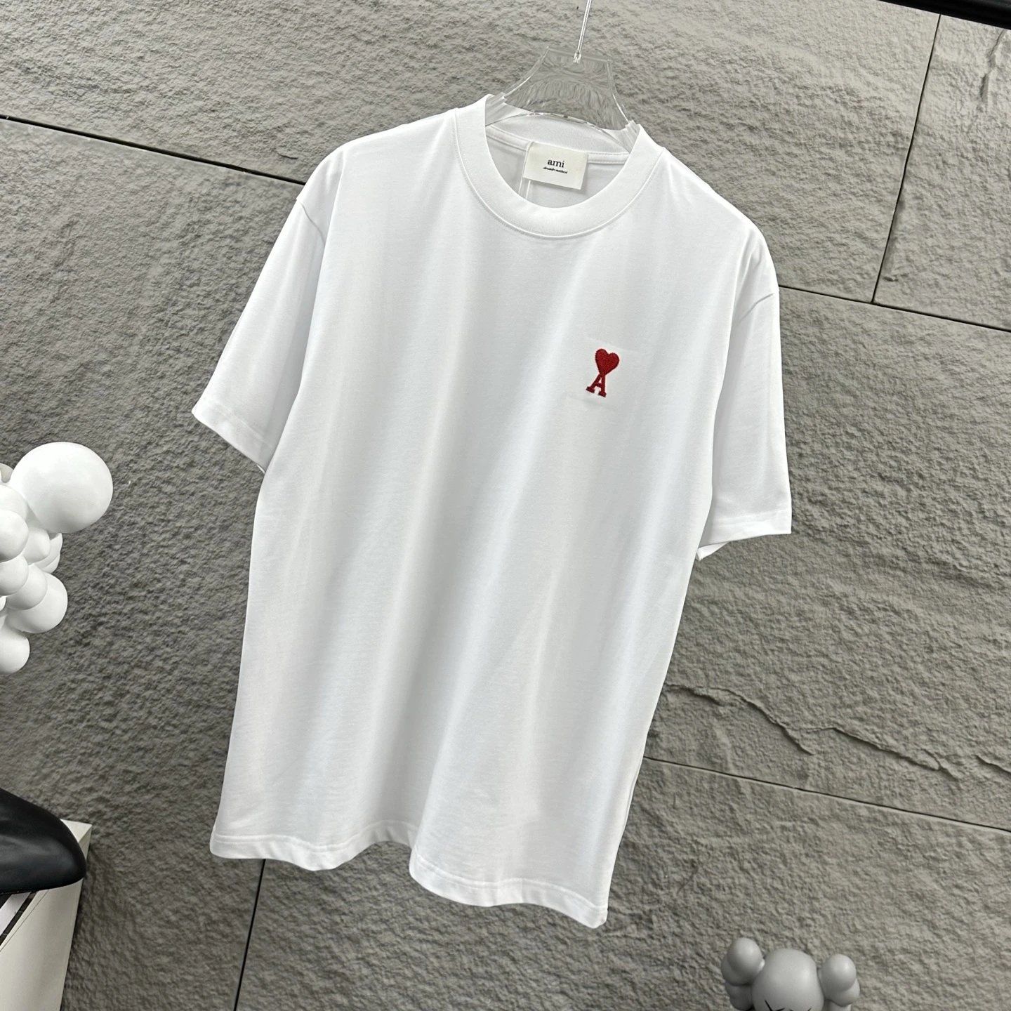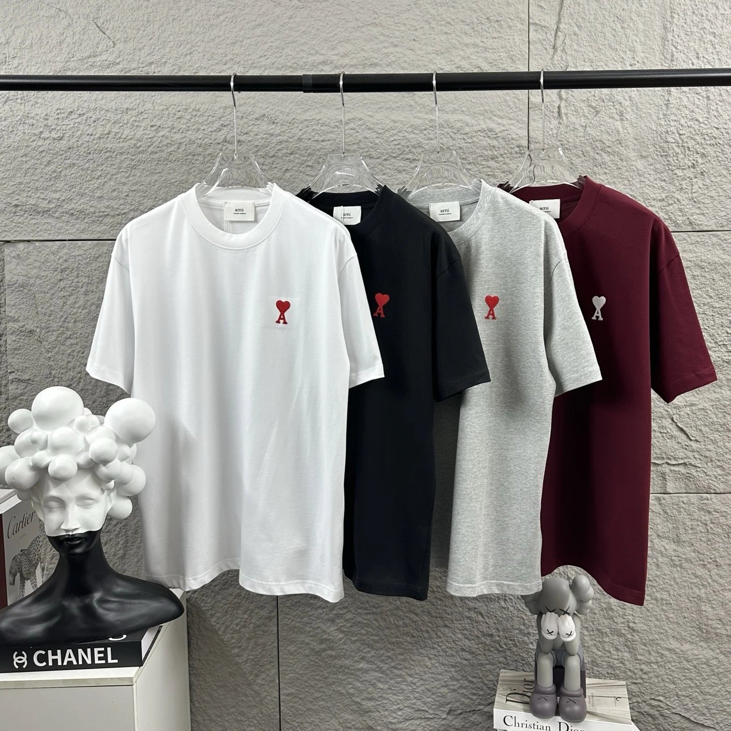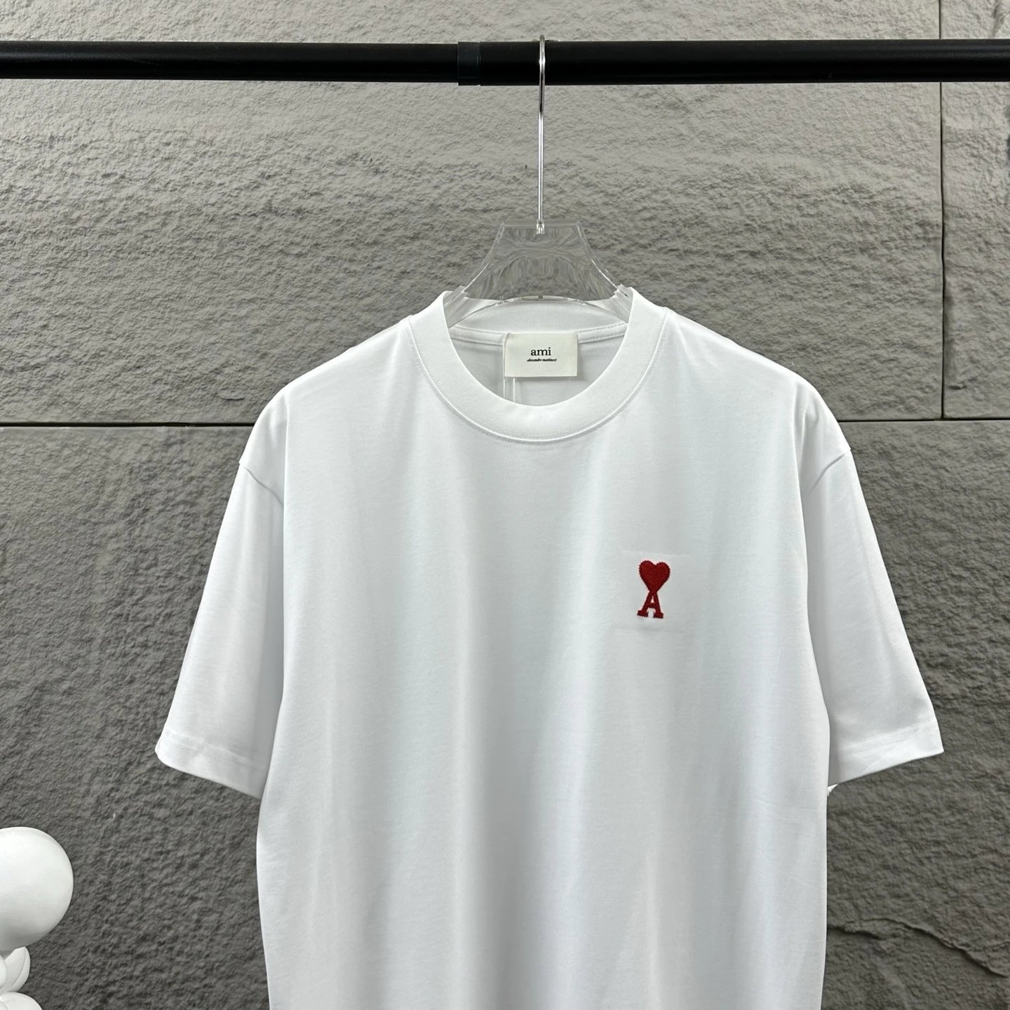AMI 2026 Spring Summer Love Embroidery Unisex T-Shirt features classic minimalist design, 3D small heart logo embroidery, and custom double yarn combed cotton fabric.
